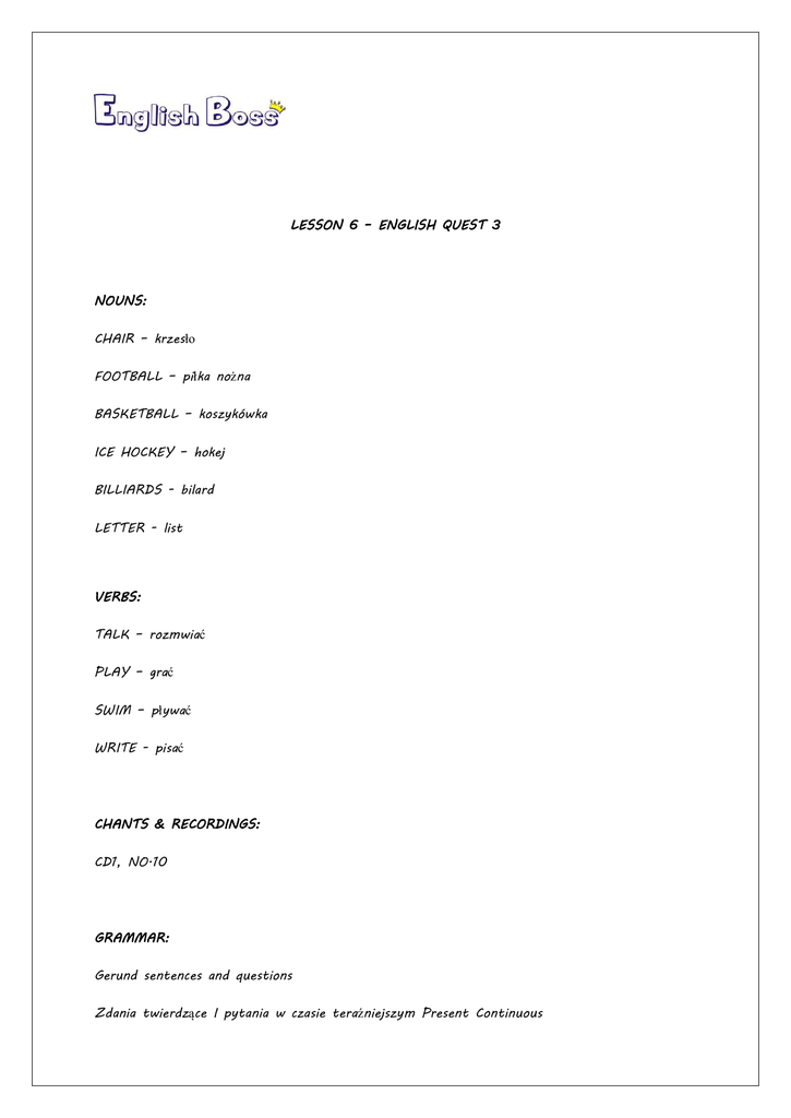LESSON 6 – ENGLISH QUEST 3 NOUNS: CHAIR – krzesło FOOTBALL – piłka nożna BASKETBALL – koszykówka ICE HOCKEY – hokej BILLIARDS - bilard LETTER - list VERBS: TALK – rozmwiać PLAY – grać SWIM – pływać WRITE - pisać CHANTS & RECORDINGS: CD1, NO.10 GRAMMAR: Gerund sentences and questions Zdania twierdzące I pytania w czasie teraźniejszym Present Continuous