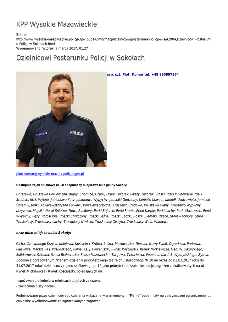 KPP Wysokie Mazowieckie Źródło: http://www.wysokie-mazowieckie.policja.gov.pl/p14/informacj/dzielnicowi/posterunek-policji-w-s/42904,Dzielnicowi-Posterunk u-Policji-w-Sokolach.html Wygenerowano: Wtorek, 7 marca 2017, 01:27 Dzielnicowi Posterunku Policji w Sokołach asp. szt. Piotr Komar tel. +48 885997364 [email protected] Obsługuje rejon służbowy nr 10 obejmujący miejscowości z gminy Sokoły: Bruszewo, Bruszewo Borkowizna, Bujny, Chomice, Czajki, Drągi, Dworaki Pikaty, Dworaki Staśki, Idźki Młynowskie, Idźki Średnie, Idźki Wykno, Jabłonowo Kąty, Jabłonowo Wypychy, Jamiołki Godzieby, Jamiołki Kowale, Jamiołki Piotrowięta, Jamiołki Świetliki, Jeńki, Kowalewszczyzna Folwark, Kowalewszczyzna, Kruszewo Brodowo, Kruszewo Głąby, Kruszewo Wypychy, Krzyżewo, Mojsiki, Noski Śnietne, Nowe Racibory, Perki Bujenki, Perki Franki, Perki Karpie, Perki Lachy, Perki Mazowsze, Perki Wypychy, Pęzy, Porośl Kije, Roszki Chrzczony, Roszki Leśne, Roszki Sączki, Roszki Ziemaki, Rzące, Stare Racibory, Stare Truskolasy, Truskolasy Lachy, Truskolasy Niwisko, Truskolasy Olszyna, Truskolasy Wola, Waniewo oraz ulice miejscowości Sokoły: Cicha, Czerwonego Krzyża, Kolejowa, Kościelna, Krótka. Leśna, Mazowiecka, Niecała, Nowy Świat, Ogrodowa, Parkowa, Piaskowa, Marszałka J. Piłsudskiego, Polna, Ks. J. Popiełuszki, Rynek Kościuszki, Rynek Mickiewicza, Gen. W. Sikorskiego, Solidarności, Szkolna, Szosa Białostocka, Szosa Mazowiecka, Targowa, Tykocińska, Wspólna, Kard. S. Wyszyńskiego, Żytnia. Zgodnie z opracowanym "Planem działania priorytetowego dla rejonu służbowego Nr 10 na okres od 01.02.2017 roku do 31.07.2017 roku" dzielnicowy rejonu służbowego nr 10 jako priorytet realizuje likwidację zagrożeń zlokalizowanych na ul. Rynek Mickiewicza i Rynek Kościuszki, polegających na: - spożywaniu alkoholu w miejscach objętych zakazem, - zakłócania ciszy nocnej, Podejmowane przez dzielnicowego działania wskazane w wymienionym "Planie" będą miały na celu znaczne ograniczenie lub całkowite wyeliminowanie zdiagnozowanych zagrożeń. asp. Marcin Jabłoński tel. +48 885997356 [email protected] Obsługuje rejon służbowy nr 11 obejmujący miejscowości z gminy Kulesze Kościelne: Chojane Bąki, Chojane Gorczany, Chojane Pawłowięta, Chojane Piecki, Chojane Sierocięta, Chowane Stankowięta, Czarnowo Biki, Faszcze, Gołasze Mościckie, Gołasze Dąb, Grodzkie Szczepanowięta, Kalinowo Solki, Kulesze Litewka, Kulesze Podlipne, Kulesze Podawce, Leśniewo Niedźwiedź I, Leśniewo Niedźwiedź II, Niziołki Dobki, Nowe Grodzkie, Nowe Kalinowo, Nowe Wiechy, Nowe Wykno, Stara Litwa, Stare Grodzkie, Stare Kalinowo, Stare Niziołki, Stare Wykno, Stypułki Giemzino, Tybory Uszyńskie, Wnory Pażochy, Wnory Wiechy, Wnory Wypychy. oraz ulice miejscowości Kulesze Kościelne: Główna, Mazowiecka, Łąkowa, Nowa, Kolejowa, Piękna, Wesoła, Zacisze, Polna, Krótka, Obwodowa Zgodnie z opracowanym "Planem działania priorytetowego dla rejonu służbowego Nr 11 na okres od 01.02.2017 roku do 31.07.2017 roku" dzielnicowy rejonu służbowego nr 11 jako priorytet realizuje likwidację zagrożeń zlokalizowanych w sołectwie Wnory-Wiechy w okolicach klubu "SCORPIO", polegających na: - zakłócaniu ciszy nocnej, - spożywaniu alkoholu w miejscach objętych zakazem, Podejmowane przez dzielnicowego działania wskazane w wymienionym "Planie" będą miały na celu znaczne ograniczenie lub całkowite wyeliminowanie zdiagnozowanych zagrożeń. mł. asp. Marek Pabich tel. +48 885997355 [email protected] Obsługuje rejon służbowy nr 12 obejmujący miejscowości z gminy Kobylin Borzymy: Franki Dąbrowa, Franki Piaski, Garbowo Kolonia, Kierzki, Kłoski Młynowięta, Kłoski Świgonie, Kobylin Cieszymy, Kobylin Kruszewo, Kobylin Kuleszki, Kobylin Latki, Kobylin Pieniążki, Kobylin Pogorzałki, Kropiewnica Gajki, Kropiewnica Racibory, Kurowo, Kurowo Kolonia, Kurzyny, Makowo, Milewo Zabielne, Mojki, Nowe Garbowo, Piszczaty Kończany, Piszczaty Piotrowięta, Pszczółczyn, Sikory Bartyczki, Sikory Bartkowięta, Sikory Janowięta, Sikory Pawłowięta, Sikory Piotrowięta, Sikory Tomkowięta, Sikory Wojciechowięta, Stare Garbowo, Stare Wnory, Stypułki Borki, Stypułki Szymany, Stypułki Święchy, Wnory Kużele, Wnory Wandy, Zalesie Łabędzkie. oraz ulice miejscowości Kobylin Borzymy: Główna, Lipowa, Cmentarna, Południowa Zgodnie z opracowanym "Planem działania priorytetowego dla rejonu służbowego Nr 12 na okres od 01.02.2017 roku do 31.07.2017 roku" dzielnicowy rejonu służbowego nr 12 jako priorytet realizuje likwidację zagrożeń zlokalizowanych w miejscowości Kropiewnica Gajki - buynek dawnej szkoły podstawowej, polegających na: - grupowaniu się młodzieży, - spożywaniu alkoholu , - akty wandalizmu -nieobyczajnych wybrykach, - zakłócanie ciszy nocnej. Podejmowane przez dzielnicowego działania wskazane w wymienionym "Planie" będą miały na celu znaczne ograniczenie lub całkowite wyeliminowanie zdiagnozowanych zagrożeń asp. Jerzy Choiński tel. +48 885997363 [email protected] Obsługuje rejon służbowy nr 8 obejmujący teren gminy Nowe Piekuty: Lendowo-Budy, Markowo-Wólka, Hodyszewo, Skłody Przyrusy, Jośki, Piekuty Urbany, Koboski, Łopienie Zyski, Łopienie Szelągi, Stokowisko, Jabłoń-Dąbrowa, Jabłoń Śliwowo, Jabłoń Zarzeckie, Jabłoń Markowięta, Jabłoń Spały, Jabłoń Dobki, Jabłoń Piotrowce, Pruszanka Mała, Tłoczewo, Wierzbowizna, Krasowo-Wólka, Krasowo-Wielkie, Krasowo Siódmaki, Kostry Litwa, Kostry Noski, Skłody Borowe, Stare Żochy, Nowe Żochy, Nowe Rzepki, Łopienie Jeże, Krasowo Częstki, Jabłoń Zambrowizna, Jabłoń Jankowce Nowe Piekuty :ul. Główna, ul. Spokojna, ul. Słoneczna, ul. Polna Jabłoń Kościelna: ul. Cmentarna, ul. Dobkowska, ul. Kolejowa, ul. Krótka, ul. Mazowiecka, ul. Polna, ul. Przemysłowa, ul. Rynek Kościelny, ul. Sokołowska, ul. Zielona, ul. Sadowa. Zgodnie z opracowanym "Planem działania priorytetowego 
