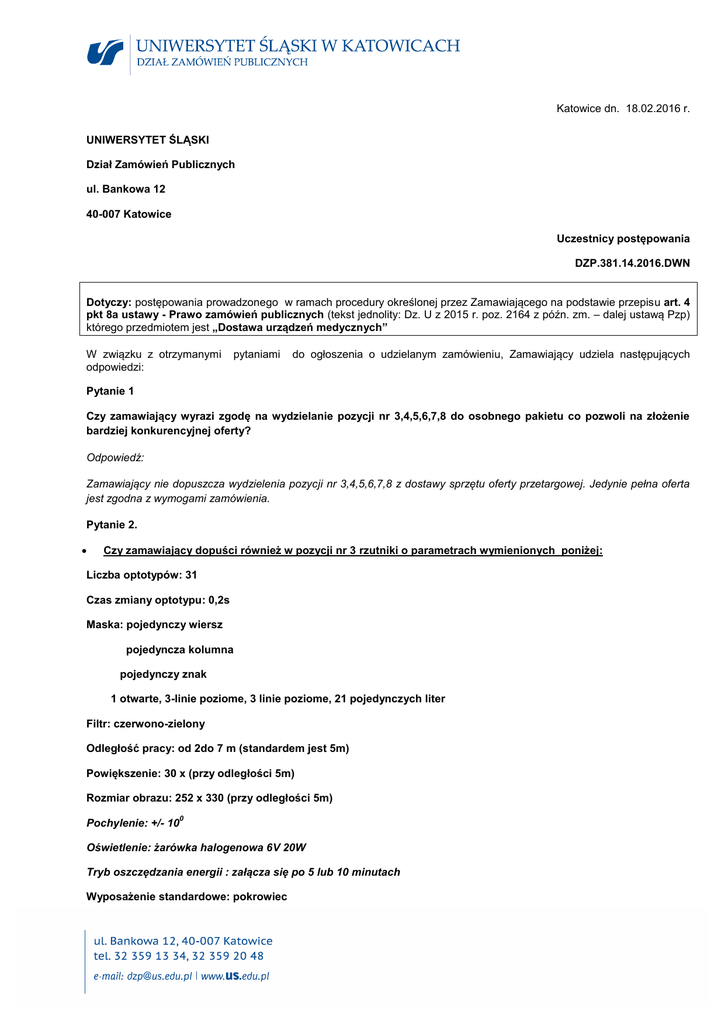 Katowice dn. 18.02.2016 r. UNIWERSYTET ŚLĄSKI Dział Zamówień Publicznych ul. Bankowa 12 40-007 Katowice Uczestnicy postępowania DZP.381.14.2016.DWN Dotyczy: postępowania prowadzonego w ramach procedury określonej przez Zamawiającego na podstawie przepisu art. 4 pkt 8a ustawy - Prawo zamówień publicznych (tekst jednolity: Dz. U z 2015 r. poz. 2164 z późn. zm. – dalej ustawą Pzp) którego przedmiotem jest „Dostawa urządzeń medycznych” W związku z otrzymanymi odpowiedzi: pytaniami do ogłoszenia o udzielanym zamówieniu, Zamawiający udziela następujących Pytanie 1 Czy zamawiający wyrazi zgodę na wydzielanie pozycji nr 3,4,5,6,7,8 do osobnego pakietu co pozwoli na złożenie bardziej konkurencyjnej oferty? Odpowiedź: Zamawiający nie dopuszcza wydzielenia pozycji nr 3,4,5,6,7,8 z dostawy sprzętu oferty przetargowej. Jedynie pełna oferta jest zgodna z wymogami zamówienia. Pytanie 2. Czy zamawiający dopuści również w pozycji nr 3 rzutniki o parametrach wymienionych poniżej: Liczba optotypów: 31 Czas zmiany optotypu: 0,2s Maska: pojedynczy wiersz pojedyncza kolumna pojedynczy znak 1 otwarte, 3-linie poziome, 3 linie poziome, 21 pojedynczych liter Filtr: czerwono-zielony Odległość pracy: od 2do 7 m (standardem jest 5m) Powiększenie: 30 x (przy odległości 5m) Rozmiar obrazu: 252 x 330 (przy odległości 5m) Pochylenie: +/- 10 0 Oświetlenie: żarówka halogenowa 6V 20W Tryb oszczędzania energii : załącza się po 5 lub 10 minutach Wyposażenie standardowe: pokrowiec ekran pilot zdalnego sterowania okulary spolaryzowane zapasowe bezpieczniki - 3 x zapasowe żarówki halogenowe -3 x Zasilanie: 240 V Wyposażenie dodatkowe: okulary czerwono-zielone uchwyt do mocowania na ścianie Odpowiedź: Zamawiający nie dopuszcza w pozycji nr 3 rzutników o parametrach przedłożonych w zapytaniu, ponieważ nie spełniają one wszystkich wymagań Zamawiającego Czy zamawiający dopuści również w pozycji nr 4 kasety o parametrach wymienionych poniżej: 260 szkieł sferycznych od 0,25 D do 6,00 D (co 0,25 D) od 6,00 D do 10,00 D (co 0,50 D) od 10,00 D do 20,00 D ( co 1,00 D) 80 szkieł cylindrycznych od 0,25 D do 4,00 D ( co 0,25 D) od 4,00 do 6,00 D (co 1,00 D) 12 szkieł pryzmatycznych 14 szkieł dodatkowych 2 cylindry skrzyżowane na rączce Odpowiedź: Zamawiający nie dopuszcza w pozycji nr 4 kaset szkieł okulistycznych o parametrach przedłożonych w zapytaniu, ponieważ nie spełniają one wszystkich wymagań Zamawiającego Zamawiający Dopuszcza jedynie zmianę wymagań do zamówienia kasety okulistycznej określonej w opisie przedmiotu zamówienia wyposażonej w szkła próbne o zakresie sfery +/- 20 D co 0,25 D w pełnym zakresie na zakres sfery +/- 20 D ale od 0,25 D do 4,00 D (co 0,25 D), od 4,00 D do 7,00 D (co 0,50 D), od 7,00 do 16,00 D (co 1,00 D), od 16,00 do 20,00 (co 2,00 D) Czy zamawiający dopuści również w pozycji nr 5 oprawy o parametrach wymienionych poniżej: Zakres PD: 48-80 mm Skala regulacji na około lewe i prawe: od 24-40 mm 0 0 0 Skala kątowa na oko prawe: 60 do 45 na oko lewe 120 -135 Zewnętrzna średnica szkła: 32,5 mm Cztery uchwyty na szkła próbne Waga: 80 g Odpowiedź: 0 Zamawiający nie dopuszcza w pozycji nr 5 opraw okularowych o parametrach przedłożonych w zapytaniu. Czy zamawiający dopuści w pozycji nr 6 autorefraktometry o parametrach wymienionych poniżej: -Autorefraktometr z keratometrią-funkcje: Minimalna średnica źrenicy: 2 mm Pomiar średnicy źrenicy i rogówki Pomiar krzywizny bazowej soczewki kontaktowej Czas pomiaru: 0,,07 sek Graficzna wizualizacja wady wzroku Kolorowy monitor TFT Tryb IOL Pomiar ręczny i automatyczny Pomiar PD Retroiluminacja -Refrakcja : Odległość czołowa (VD): 0; 10; 12; 13,5; 15 mm Zakres pomiaru sfery (SPH): od -25,00 do +22,00 D Co 0,12/0,25 D Zakres pomiaru cylindra (CYL): od 0,00 do +/-10,00 D (Co 0,12/0,25 D) Oś: od 1do 180 0 0 (1 ) Znak cylindra: -, +, +/Rozstaw źrenic: 10~85 Minimalna średnica źrenicy: 2.0 mm -Keratometria: Promień krzywizny : od 5,0 do 10,2 mm (co 0,01 mm) Moc rogówki: 0d 33,00 do 67,50 D Astygmatyzm rogówki: 0,00 do 15,00 D Oś: od 1 do 180 0 Zakres pomiaru średnicy rogówki: od 2,0 do 12,0 mm Drukarka: termiczna Monitor: dotykowy 7 cali Stolik elektryczny Odpowiedź: Zamawiający nie dopuszcza w pozycji nr 6 autorefraktometru o parametrach przedłożonych w zapytaniu, ponieważ nie spełniają one wszystkich wymagań Zamawiającego. POWYŻSZE WYJAŚNIENIA I ZMIANY SĄ WIĄŻĄCE DLA WYKONAWCÓW I NALEŻY JE UWZGLĘDNIĆ PRZY SPORZĄDZANIU OFERTY. Przewodniczący Komisji Przetargowej Małgorzata Wróblewska