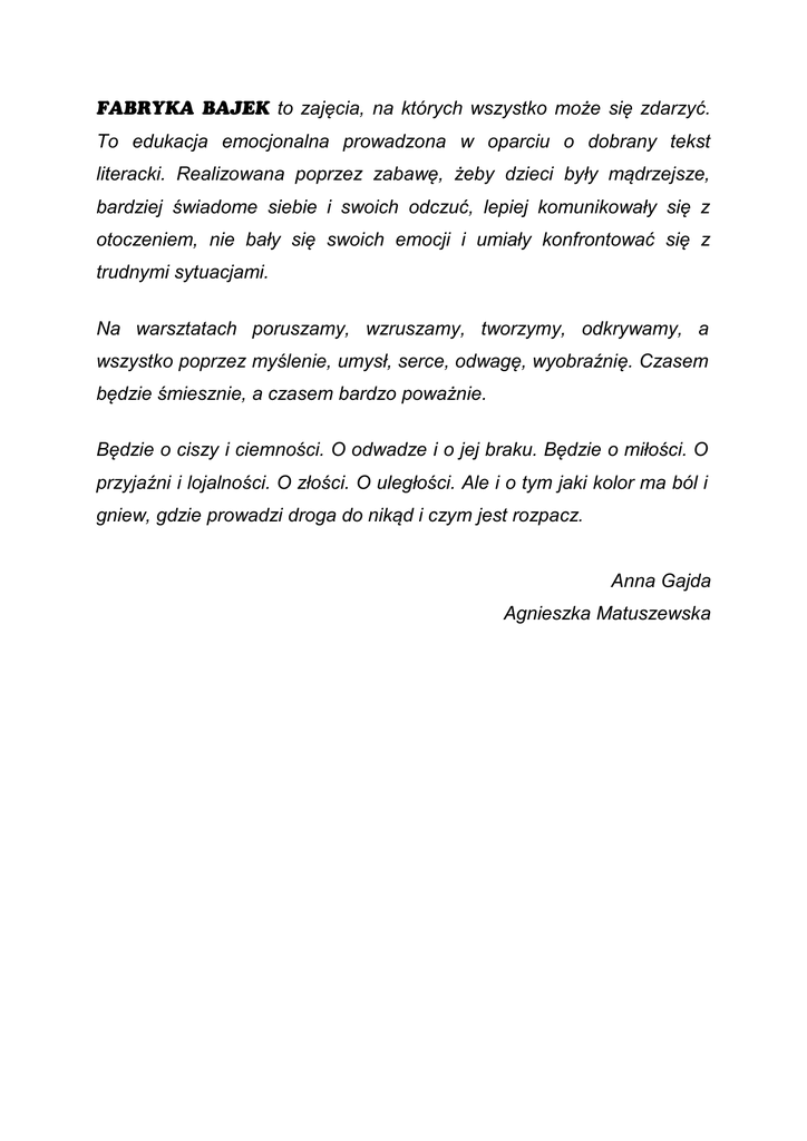 FABRYKA BAJEK to zajęcia, na których wszystko może się zdarzyć. To edukacja emocjonalna prowadzona w oparciu o dobrany tekst literacki. Realizowana poprzez zabawę, żeby dzieci były mądrzejsze, bardziej świadome siebie i swoich odczuć, lepiej komunikowały się z otoczeniem, nie bały się swoich emocji i umiały konfrontować się z trudnymi sytuacjami. Na warsztatach poruszamy, wzruszamy, tworzymy, odkrywamy, a wszystko poprzez myślenie, umysł, serce, odwagę, wyobraźnię. Czasem będzie śmiesznie, a czasem bardzo poważnie. Będzie o ciszy i ciemności. O odwadze i o jej braku. Będzie o miłości. O przyjaźni i lojalności. O złości. O uległości. Ale i o tym jaki kolor ma ból i gniew, gdzie prowadzi droga do nikąd i czym jest rozpacz. Anna Gajda Agnieszka Matuszewska