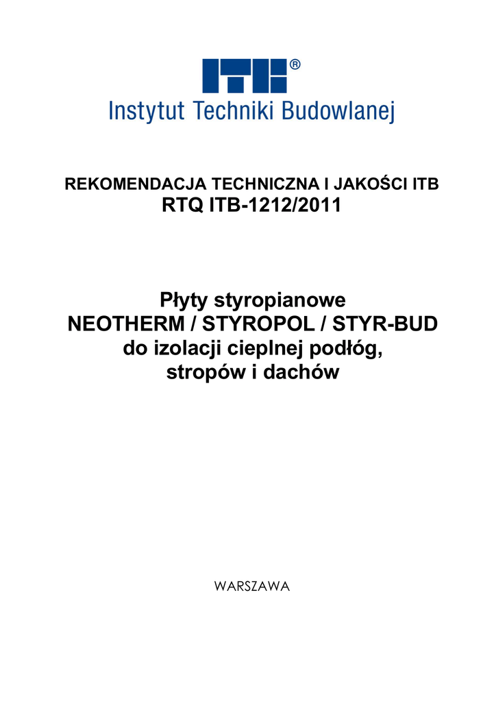 REKOMENDACJA TECHNICZNA I JAKOŚCI ITB RTQ ITB-1212/2011 Płyty styropianowe NEOTHERM / STYROPOL / STYR-BUD do izolacji cieplnej podłóg, stropów i dachów WARSZAWA Rekomendacja techniczna i jakości została opracowana w Zakładzie Aprobat Technicznych przez mgr inż. Grażynę CAŁKĘ-CYBULSKĄ Projekt okładki: Ewa Kossakowska GW V Kopiowanie aprobaty technicznej jest dozwolone jedynie w całości Wykonano z oryginałów bez opracowania wydawniczego Copyright by Instytut Techniki Budowlanej Warszawa 2011 ISBN 978-83-249-4819-2 Dział Wydawniczy, 02-656 Warszawa, ul. Ksawerów 21, tel.: 22 843 35 19 Format: pdf Wydano w sierpniu 2011 r. Zam. 1540/2011 Seria: APROBATY TECHNICZNE REKOMENDACJA TECHNICZNA I JAKOŚCI ITB RTQ ITB-1212/2011 Instytut Techniki Budowlanej w Warszawie, na wniosek firm: Neotherm Sp. z o. o ul. Przemysłowa 1, 43-340 Kozy NEOTHERM Sp. j. Rafał Herzyk, Ireneusz Nowak ul. Pułaskiego 6, 42-300 Myszków potwierdza wykonanie wstępnego badania typu wyrobów pod nazwą: Płyty styropianowe NEOTHERM / STYROPOL / STYR-BUD do izolacji cieplnej podłóg, stropów i dachów oraz stwierdza przydatność do stosowania w budownictwie i zgodność z zasadami wiedzy technicznej izolacji cieplnej podłóg, stropów i dachów wykonywanych z zastosowaniem tych wyrobów w zakresie i na zasadach określonych w Załączniku, który jest integralną częścią niniejszej Rekomendacji Technicznej i Jakości ITB. W ramach nadzoru nad Rekomendacją Instytut Techniki Budowlanej wykonuje badania kontrolne wyrobów nią objętych na próbkach pobranych z rynku. Termin ważności: 30 czerwca 2016 r. DYREKTOR Instytutu Techniki Budowlanej Załączniki: Postanowienia ogólne i techniczne Marek Kaproń Warszawa, 30 czerwca 2011 r. Rekomendacja Techniczna i Jakości RTQ ITB-1212/2011 jest nowelizacją Rekomendacji Technicznej i Jakości RTQ ITB-1212/2010. Dokument Rekomendacji Technicznej i Jakości RTQ ITB-1212/2011 zawiera 31 stron. Tekst tego dokumentu można kopiować tylko w całości. Publikowanie lub upowszechnianie w każdej innej formie fragmentów tekstu Rekomendacji Technicznej i Jakości wymaga pisemnego uzgodnienia z Instytutem Techniki Budowlanej. ® RTQ ITB-1212/2011 2/31 ZAŁĄCZNIK POSTANOWIENIA OGÓLNE I TECHNICZNE SPIS TREŚCI 1. CHARAKTER I CEL REKOMENDACJI ............................................................................... 3 2. PRZEDMIOT REKOMENDACJI .......................................................................................... 3 3. PŁYTY STYROPIANOWE ................................................................................................... 4 3.1. Właściwości techniczno-użytkowe płyt ......................................................................... 4 4. OCENA ZGODNOŚCI ...................................................................................................... 11 4.1. Postanowienia ogólne ................................................................................................ 11 4.2. Wstępne badanie typu................................................................................................ 11 4.3. Znakowanie ................................................................................................................ 12 4.4. Zakładowa kontrola produkcji ..................................................................................... 13 5. PAKOWANIE, PRZECHOWYWANIE I TRANSPORT ....................................................... 13 6. PRZEZNACZENIE, ZAKRES I WARUNKI STOSOWANIA ............................................... 13 7. PRZYKŁADOWE ZASTOSOWANIA WYROBÓW OBJĘTYCH REKOMENDACJĄ.......... 14 8. USTALENIA FORMALNO-PRAWNE ................................................................................. 15 9. TERMIN WAŻNOŚCI ......................................................................................................... 16 INFORMACJE DODATKOWE .............................................................................................. .16 RYSUNKI ............................................................................................................................... 19 ® RTQ ITB-1212/2011 3/31 1. CHARAKTER I CEL REKOMENDACJI Rekomendacja Techniczna i Jakości RTQ ITB-1212/2011 jest dokumentem dobrowolnym, potwierdzającym wykonanie wstępnego badania typu płyt styropianowych o zamiennie stosowanych nazwach NEOTHERM, STYROPOL i STYR-BUD oraz, że izolacje cieplne podłóg, stropów i dachów wykonane z zastosowaniem tych płyt spełnia wymagania art. 5 Ustawy - Prawo budowlane (tekst jednolity – Dz. U. Nr 207/2003, poz. 2016, wraz z późniejszymi zmianami), tzn. potwierdzają, że izolacje te są zgodne z wymaganiami przepisów techniczno-budowlanych oraz zasadami wiedzy technicznej i zapewniają spełnienie wymagań podstawowych przez obiekty budowlane. Rekomendacja Techniczna i Jakości określa także warunki stosowania objętych nią płyt styropianowych. W ramach nadzoru nad Rekomendacją Instytut Techniki Budowlanej wykonuje badania kontrolne płyt nią objętych na próbkach pobranych z rynku. 2. PRZEDMIOT REKOMENDACJI Przedmiotem niniejszej Rekomendacji Technicznej i Jakości są płyty styropianowe do izolacji cieplnej podłóg, stropów i dachów. Niniejsza Rekomendacja Techniczna i Jakości następujących zamiennie stosowanych nazwach handlowych: NEOTHERM: Neodach/Podłoga Standard, Neodach/Podłoga Premium, Neodach/Podłoga Super, Neographite Dach/Podłoga 032, Neographite Dach/Podłoga 031, STYROPOL i STYR-BUD: Standard STRONG Dach/Podłoga, Premium STRONG Dach/Podłoga, Super STRONG Dach/Podłoga, Graphite STRONG Dach/Podłoga 032, Graphite STRONG Dach/Podłoga 031, różniące się właściwościami techniczno-użytkowymi. obejmuje płyty styropianowe o ® RTQ ITB-1212/2011 4/31 Płyty styropianowe objęte niniejszą Rekomendacją są białe lub kolorowe. Płyty styropianowe NEOTHERM / STYROPOL / STYR-BUD do izolacji cieplnej podłóg, stropów