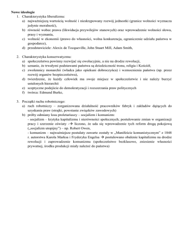 Nowe ideologie 1. Charakterystyka liberalizmu: a) najważniejszą wartością wolność i nieskrępowany rozwój jednostki (granice wolności wyznacza jedynie moralność), b) równość wobec prawa (likwidacja przywilejów stanowych) oraz wprowadzenie wolności słowa, prasy i wyznania, c) wolność w ekonomii (prawo do własności, wolna konkurencja, ograniczenie udziału państwa w gospodarce), d) przedstawiciele: Alexix de Tocqueville, John Stuart Mill, Adam Smith, 2. Charakterystyka konserwatyzmu: a) społeczeństwa powinny rozwijać się ewolucyjnie, a nie na drodze rewolucji, b) uznanie, że trwałymi podstawami państwa są dziedziczność tronu, religia i Kościół, c) zwolennicy monarchii (władca jako opiekuni dobroczyńca) i wzmocnienia państwa (np. przez rozwój organów bezpieczeństwa), d) twierdzenie, że każdy człowiek ma swoje miejsce w społeczeństwie i nie należy burzyć ustalonych hierarchii e) sceptyczne podejście do demokratyzacji i rozszerzania praw politycznych f) twórca: Edmund Burke, 3. Początki ruchu robotniczego: a) ruch robotniczy – zorganizowana działalność pracowników fabryk i zakładów dążących do uzyskania praw (strajki, powstanie związków zawodowych) b) próby odmiany losu proletariuszy – socjalizm i komunizm: - socjalizm – krytyka kapitalizmu i nierówności społecznych; postulowanie zmian w organizacji pracy i szerzenie oświaty - liczono, że uda się wprowadzenie tych reform drogą pokojową („socjalizm utopijny”) – np. Robert Owen, - komunizm – najważniejsze postulaty zawarte zostały w „Manifeście komunistycznym” z 1848 r. autorstwa Karola Marksa i Fryderyka Engelsa postulowano obalenie kapitalizmu na drodze rewolucji i zaprowadzenie komunizmu (społeczeństwo bezklasowe, zniesienie własności prywatnej, środku produkcji miały należeć do państwa)