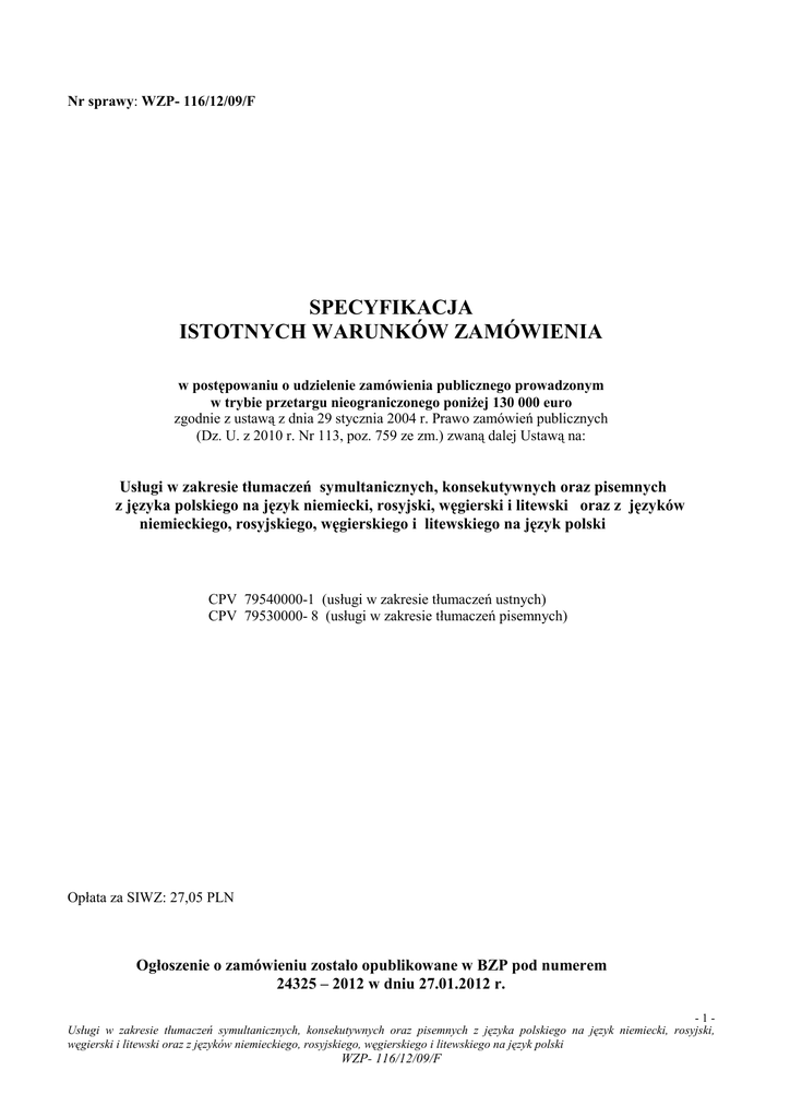 Nr sprawy: WZP- 116/12/09/F SPECYFIKACJA ISTOTNYCH WARUNKÓW ZAMÓWIENIA w postępowaniu o udzielenie zamówienia publicznego prowadzonym w trybie przetargu nieograniczonego poniŜej 130 000 euro zgodnie z ustawą z dnia 29 stycznia 2004 r. Prawo zamówień publicznych (Dz. U. z 2010 r. Nr 113, poz. 759 ze zm.) zwaną dalej Ustawą na: Usługi w zakresie tłumaczeń symultanicznych, konsekutywnych oraz pisemnych z języka polskiego na język niemiecki, rosyjski, węgierski i litewski oraz z języków niemieckiego, rosyjskiego, węgierskiego i litewskiego na język polski CPV 79540000-1 (usługi w zakresie tłumaczeń ustnych) CPV 79530000- 8 (usługi w zakresie tłumaczeń pisemnych) Opłata za SIWZ: 27,05 PLN Ogłoszenie o zamówieniu zostało opublikowane w BZP pod numerem 24325 – 2012 w dniu 27.01.2012 r. -1Usługi w zakresie tłumaczeń symultanicznych, konsekutywnych oraz pisemnych z języka polskiego na język niemiecki, rosyjski, węgierski i litewski oraz z języków niemieckiego, rosyjskiego, węgierskiego i litewskiego na język polski WZP- 116/12/09/F SPECYFIKACJA ISTOTNYCH WARUNKÓW ZAMÓWIENIA, zwana dalej „SIWZ” zawiera: Rozdział I Informacje ogólne Rozdział II Przedmiot, termin i miejsce wykonania zamówienia Rozdział III Warunki udziału w postępowaniu oraz opis sposobu dokonywania oceny spełniania tych warunków Rozdział IV Wykaz oświadczeń i dokumentów, jakie mają złoŜyć Wykonawcy Rozdział V Wymagania w zakresie zawartości oferty i dokumentów do niej załączonych Rozdział VI Wymagana postać oferty Rozdział VII Termin związania ofertą Rozdział VIII Tryb udzielania wyjaśnień Rozdział IX Miejsce i termin składania ofert Rozdział X Wycofanie lub zmiana oferty Rozdział XI Miejsce i termin otwarcia ofert Rozdział XII Badanie i ocena ofert Rozdział XIII Opis kryteriów oceny ofert oraz sposobu wyliczenia ceny Rozdział XIV Informacja o formalnościach, jakie powinny zostać dopełnione po wyborze oferty w celu zawarcia umowy w sprawie zamówienia publicznego Rozdział XV Pouczenie o środkach ochrony prawnej Rozdział XVI Ogólne warunki umowy Załączniki do SIWZ: 1. Wzór - załącznik nr 1 do SIWZ - Oferta Wykonawcy. 2. Wzór - załącznik nr 2 do SIWZ – Oświadczenie z art. 22 ust. 1 i 24 ustawy 2 Ustawy. 3. Wzór - załącznik nr 3 do SIWZ – Wykaz usług 4. Wzór - załącznik nr 4 do SIWZ - Wykaz osób, które będą uczestniczyć w wykonywaniu zamówienia w zakresie tłumaczeń ustnych 5. Wzór - załącznik nr 5 do SIWZ - Oświadczenia Wykonawców wspólnie ubiegających się o przyznanie zamówienia. 6. Wzór – załącznik nr 5a do SIWZ – Oświadczenie Wykonawcy wspólnie ubiegającego się o przyznanie zamówienia. 7. Wzór – załącznik nr 6 do SIWZ – Zobowiązanie innego podmiotu o oddaniu do dyspozycji Wykonawcy zasobu w zakresie doświadczenia na okres korzystania z nich przy wykonywaniu zamówienia 8. Wzór – załącznik nr 7 do SIWZ – Zobowiązanie innego podmiotu o oddaniu do dyspozycji Wykonawcy zasobu w zakresie osób zdolnych do wykonania zamówienia na okres korzystania z nich przy wykonywaniu zamówienia -2Usługi w zakresie tłumaczeń symultanicznych, konsekutywnych oraz pisemnych z języka polskiego na język niemiecki, rosyjski, węgierski i litewski oraz z języków niemieckiego, rosyjskiego, węgierskiego i litewskiego na język polski WZP- 116/12/09/F I. INFORMACJE OGÓLNE: 1. Zamawiający KOMENDANT STOŁECZNY POLICJI 2. Siedziba Zamawiającego: ul. Nowolipie 2, 00-150 Warszawa 3. Wszelką korespondencję do Zamawiającego związaną z niniejszym postępowaniem naleŜy kierować na adres: Komenda Stołeczna Policji Wydział Zamówień Publicznych, ul. Nowolipie 2, 00-150 Warszawa z dopiskiem: Usługi w zakresie tłumaczeń symultanicznych, konsekutywnych oraz pisemnych z języka polskiego na język niemiecki, rosyjski, węgierski i litewski oraz z języków niemieckiego, rosyjskiego, węgierskiego i litewskiego na język polski ze wskazaniem numeru referencyjnego WZP- 116/12/09/F. 4. Zgodnie z art. 27 ust. 1 Ustawy, Zamawiający dopuszcza moŜliwość prowadzenia korespondencji w formie pisemnej lub za pośrednictwem faksu. 5. Wykonawca zobowiązany jest do niezwłocznego potwierdzania faktu otrzymania wszelkiej korespondencji od Zamawiającego - podstawa prawna art. 27 ust. 2 Ustawy. W przypadku braku potwierdzenia, o którym mowa w zdaniu poprzedzającym, Zamawiający uzna, iŜ Wykonawca zapoznał się z treścią dokumentu w dniu jego przekazania przez Zamawiającego. 6. Wykonawca zobowiązany jest do zapewnienia moŜliwości odbierania korespondencji drogą faksową przez całą dobę. 7. Wykonawca zobowiązany jest do informowania Zamawiającego o kaŜdej zmianie numerów faksowych słuŜących do wymiany korespondencji w ramach prowadzonego postępowania. 8. Osobą uprawnioną do kontaktów z Wykonawcami, w zakresie zagadnień związanych z prowadzoną procedurą jest Anna Kukawka tel. (22) 603 86 08, faks (22) 603 76 42. 9. Zamawiający nie udziela Ŝadnych ustnych i telefonicznych wyjaśnień w zakresie, o którym mowa w art. 38 ust. 1 i ust. 3 Ustawy. 10. Rozliczenia pomiędzy Wykonawcą a Zamawiającym będą dokonywane w złotych polskich (PLN). 11. Wykonawca poniesie wszelkie koszty związane ze sporządzeniem oraz złoŜeniem oferty. II. PRZEDMIOT, TERMIN I MIEJSCE WYKONANIA ZAMÓWIENIA: 1. Przedmiotem zamówienia jest świadczenie usług w zakresie tłumaczeń symultanicznych, konsekutywnych oraz pisemnych z języka polskiego na język niemiecki, rosyjski, węgierski i litewski oraz z języków niemieckiego, rosyjskiego, węgierskiego i litewskiego na język polski, zwanych w dalszej części SIWZ „usługami”. 2. Przedmiot zamówienia realizowany jest w ramach projektu pt. „Bezpieczne imprezy masowe w duŜych aglomeracjach UE: Działania Policji w zapobieganiu i zwalczaniu przestępstw im towarzyszących (program UE „Zapobieganie i zwalczanie przestępczości – ISEC). 3. 