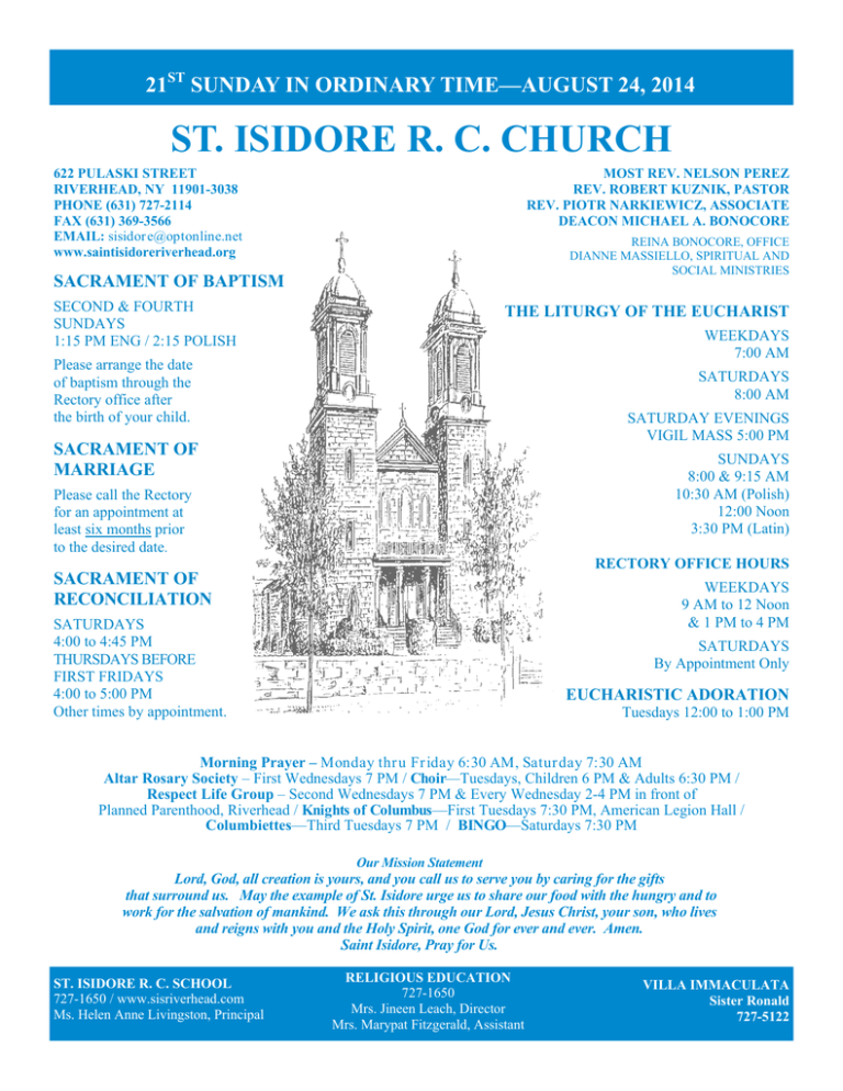 21ST SUNDAY IN ORDINARY TIME—AUGUST 24, 2014 ST. ISIDORE R. C. CHURCH 622 PULASKI STREET RIVERHEAD, NY 11901-3038 PHONE (631) 727-2114 FAX (631) 369-3566 EMAIL: sisidor [email protected] www.saintisidoreriverhead.org MOST REV. NELSON PEREZ REV. ROBERT KUZNIK, PASTOR REV. PIOTR NARKIEWICZ, ASSOCIATE DEACON MICHAEL A. BONOCORE REINA BONOCORE, OFFICE DIANNE MASSIELLO, SPIRITUAL AND SOCIAL MINISTRIES SACRAMENT OF BAPTISM SECOND & FOURTH SUNDAYS 1:15 PM ENG / 2:15 POLISH THE LITURGY OF THE EUCHARIST WEEKDAYS 7:00 AM Please arrange the date of baptism through the Rectory office after the birth of your child. SATURDAYS 8:00 AM SATURDAY EVENINGS VIGIL MASS 5:00 PM SACRAMENT OF MARRIAGE SUNDAYS 8:00 & 9:15 AM 10:30 AM (Polish) 12:00 Noon 3:30 PM (Latin) Please call the Rectory for an appointment at least six months prior to the desired date. RECTORY OFFICE HOURS SACRAMENT OF RECONCILIATION WEEKDAYS 9 AM to 12 Noon & 1 PM to 4 PM SATURDAYS 4:00 to 4:45 PM THURSDAYS BEFORE FIRST FRIDAYS 4:00 to 5:00 PM Other times by appointment. SATURDAYS By Appointment Only EUCHARISTIC ADORATION Tuesdays 12:00 to 1:00 PM Morning Prayer – Monday thr u Fr iday 6:30 AM, Satur day 7:30 AM Altar Rosary Society – First Wednesdays 7 PM / Choir—Tuesdays, Children 6 PM & Adults 6:30 PM / Respect Life Group – Second Wednesdays 7 PM & Every Wednesday 2-4 PM in front of Planned Parenthood, Riverhead / Knights of Columbus—First Tuesdays 7:30 PM, American Legion Hall / Columbiettes—Third Tuesdays 7 PM / BINGO—Saturdays 7:30 PM Our Mission Statement Lord, God, all creation is yours, and you call us to serve you by caring for the gifts that surround us. May the example of St. Isidore urge us to share our food with the hungry and to work for the salvation of mankind. We ask this through our Lord, Jesus Christ, your son, who lives and reigns with you and the Holy Spirit, one God for ever and ever. Amen. Saint Isidore, Pray for Us. ST. ISIDORE R. C. SCHOOL 727-1650 / www.sisriverhead.com Ms. Helen Anne Livingston, Principal RELIGIOUS EDUCATION 727-1650 Mrs. Jineen Leach, Director Mrs. Marypat Fitzgerald, Assistant VILLA IMMACULATA Sister Ronald 727-5122 21ST SUNDAY IN ORDINARY TIME—AUGUST 24, 2014 IN LOVING MEMORY MISSALETTES Cecelia Naugles MASS INTENTIONS SATURDAY, AUGUST 23, 2014 5:00 pm + Mary Jane Kelly (2nd A) + Adolph Breitenbach + Raymond McVeigh Health for Helen Zurawinsky 21ST SUNDAY IN ORD TIME, AUG 24, 2014 8:00 am 9:15 am 10:30 am (POLISH) + Walter J. and Wanda J. Danowski + Leonora, Paul and Elizabeth B. Okula The People of the Parish, Living & Deceased + Anna Giecko + Maria Dubicki + Kurzyna Family + Szemiot Family 12:00 noon + Henry Wojewocki MONDAY, AUGUST 25, 2014 7:00 am Health and Blessings for Lianne Stepnoski TUESDAY, AUGUST 26, 2014 7:00 am “Whatever you bind on earth shall be bound in heaven; and whatever you loose on earth shall be loosed in heaven.” — Matthew 16:19 + Edmund Fialkowski O Błogosławieństwo Irena Fialkowska TODAY’S READINGS WEDNESDAY, AUGUST 27, 2014 7:00 am + Anne Rutkowski (A) + David Hahn THURSDAY, AUGUST 28, 2014 7:00 am + Mildred Gatz Blessings on Bertha Harris and Thanksgiving to God on her 99th Birthday 7:00 am + Thomas Troyan FRIDAY, AUGUST 29, 2014 SATURDAY, AUGUST 30, 2014 8:00 am + Jennie Koroleski 5:00 pm The People of the Parish, Living & Deceased + Raymond Zaleski + Edward & Eva Piekarski + Bertha Harris 22ND SUNDAY IN ORD TIME, AUG 31, 2014 8:00 am 9:15 am 10:30 am (POLISH) + Emily and Stanley J. Yakaboski, Sr. + Marie Lodise + Jacek Hencinski & Jan Wodecki Blessings on Laura and Lukasz (& Lukasz, Jr.) on the occasion of their wedding anniv. + Maria Dubicki + Jan & Lucyna Zaniewski and Family 12:00 noon + Anthony J. Bonocore First Reading — Eliakim is destined by God to be a father to those who live in Jerusalem (Isaiah 22:19-23). Psalm — Lord, your love is eternal; do not forsake the work of your hands (Psalm 138). Second Reading — How deep are the riches and the wisdom and the knowledge of God! (Romans 11:33-36). Gospel — Jesus asked the disciples, “Who do you say that I am?” Peter replied, “You are the Christ” (Matthew 16:13-20). READINGS FOR THE WEEK Monday: Tuesday: 2 Thes 1:1-5, 11-12; Ps 96:1-5; Mt 23:13-22 2 Thes 2:1-3a, 14-17; Ps 96:10-13; Mt 23:23-26 Wed: 2 Thes 3:6-10, 16-18; Ps 124:1-2, 4-5; Mt 23:27-32 Thursday: 1 Cor 1:1-9; Ps 145:2-7; Mt 24:42-51 Friday: 1 Cor 1:17-25; Ps 33:1-2, 4-5, 10-11; Mk 6:17-29 Saturday: 1 Cor 1:26-31; Ps 33:12-13, 18-21; Mt 25:14-30 Sunday: Jer 20:7-9; Ps 63:2-6, 8-9; Rom 12:1-2; Mt 16:21-27 PRAY FOR OUR SICK Joseph Edgar Joseph & Ursula Mocniak Wayne Dillingham Cecilia Murphy Thomas Clark Kaitlyn Collins Edward Jaeger Feliksa Sawicka Mary Oleksiak Katy Zlatniski Barbara Cushieri William Ferrara Carmine Marando Claire Maffei Bruce Stump Barbara Jaeger Stephanie Kane Richard Edwards Robert Zlatniski Tony Condzella Brian Crowley Katherine Metzger Elsie Sowinski Charles Sehy Joann Marchese Ryan Karzenski Brian Darmody Brian Sullivan Dan Massiello Christopher Wyhowanec DONATIONS August 17th 2014 $ 5,272 2013 $ 5,991 2nd COLLECTIONS This Week, Aug 24—Debt Reduction Next Week, Aug 31—Debt Reduction THE WEEK AHEAD Sunday, Aug 24, 2014 Latin Mass 3:30 PM Tuesday, Aug 26, 2014 Adoration 12 to 1 PM Saturday, August 30, 2014 NO BINGO (Labor Day Weekend) Please keep all those serving in the military and their families in your thoughts and prayers. PRAY FOR OUR DECEASED George Wurtz ST. ISIDORE RELIGIOUS ED PROGRAM Do you have an hour and a half to give on Wednesdays? Volunteer to teach about our Faith! Calling all parents, grandparents or high school students...Religious Education Instructors are needed! Registration for all students: WE WELCOME: Wednesday, August 27, 5-7 PM Thursday, August 28, 11-1 PM Chase and Luke Murphy Ayden Jamrozek Sebastian Czochanski Bring a copy of your child’s Baptismal Certificate with you when registering. SIS 23RD ANNUAL GOLF OUTING Wednesday, October 1st Rock Hill Gol
