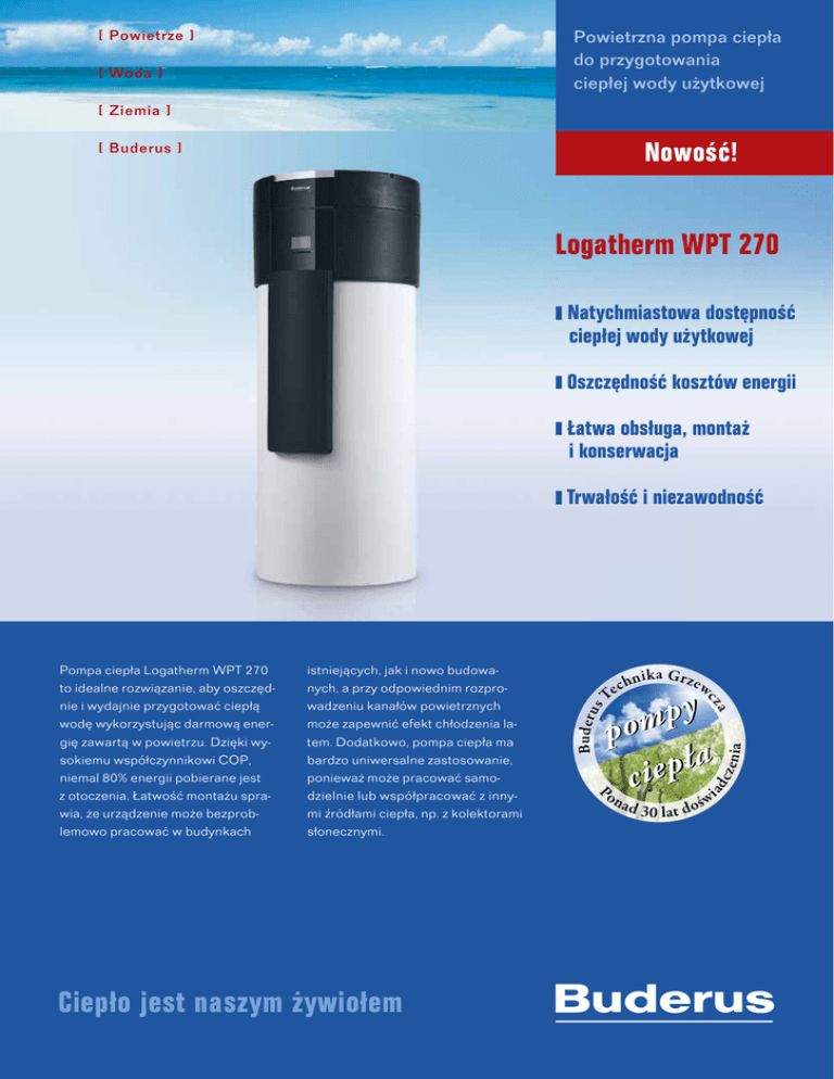 Powietrzna pompa ciepła do przygotowania ciepłej wody użytkowej [ Powietrze ] [ Woda ] [ Ziemia ] Nowość! [ Buderus ] Logatherm WPT 270 Natychmiastowa dostępność ciepłej wody użytkowej Oszczędność kosztów energii Łatwa obsługa, montaż i konserwacja Ciepło jest naszym żywiołem hn i k a Gr z e w y p m po ła p e i c nia cze Po n ad B u d er u c Te a istniejących, jak i nowo budowanych, a przy odpowiednim rozprowadzeniu kanałów powietrznych może zapewnić efekt chłodzenia latem. Dodatkowo, pompa ciepła ma bardzo uniwersalne zastosowanie, ponieważ może pracować samodzielnie lub współpracować z innymi źródłami ciepła, np. z kolektorami słonecznymi. cz Pompa ciepła Logatherm WPT 270 to idealne rozwiązanie, aby oszczędnie i wydajnie przygotować ciepłą wodę wykorzystując darmową energię zawartą w powietrzu. Dzięki wysokiemu współczynnikowi COP, niemal 80% energii pobierane jest z otoczenia. Łatwość montażu sprawia, że urządzenie może bezproblemowo pracować w budynkach s Trwałość i niezawodność ad 3 ś 0 l at d o wi Powietrzna pompa ciepła do przygotowania ciepłej wody użytkowej Logatherm WPT 270 Logatherm WPT 270 – komfortowe przygotowanie c.w.u. Pompa ciepła Logatherm WPT 270 efektywnie wykorzystuje darmową energię z powietrza do przygotowania ciepłej wody użytkowej. Urządzenie może współpracować z innymi systemami grzewczymi a jego montaż jest niezwykle łatwy. Oprócz tego posiada dodatkową zaletę – może zapewnić przyjemny chłód w upalne dni. „Teraz ciepła woda w każdej ilości i na każde żądanie – absolutny komfort. Dzięki nowej pompie ciepła Logatherm WPT 270, produkcja ciepłej wody użytkowej jest jeszcze tańsza i chroni środowisko naturalne.” nia obudowa urządzenia pozwala na pobieranie powietrza zarówno z pomieszczenia, w którym zainstalowana jest pompa ciepła jak i z innych miejsc. Tak wiele możliwości daje tylko pompa Logatherm WPT 270. Różnorodne rozwiązania Zasobnik wody o pojemności 270 litrów wyposażony jest w wężownicę, co pozwala połączyć pompę ciepła z innymi źródłami ciepła. Instalacja może być wykonana w połączeniu z instalacją solarną, kotłem na gaz lub olej lub z kotłem na paliwo stałe. Regulator pompy ciepła daje szereg możliwości. Jedną z nich jest zaprogramowanie godzin pracy urządzenia. Odpowied- Jakość i bezpieczeństwo Pompa ciepła Logatherm WPT 270 pozwala na podgrzanie wody nawet do 60°C bez użycia grzałki. Wystarczy, że urządzenie za pomocą wentylatora pobierze powietrze i schłodzi je tylko o około 7°C. Tak, tylko tyle! Całej reszty dokonuje pompa ciepła. Podgrzana ciepła woda zgromadzona jest w dobrze izolowanym, emaliowanym zasobniku, który dodatkowo zabezpieczony jest anodą antykorozyjną, co zapewnia długą żywotność. Gdy zajdzie konieczność dezynfekcji termicznej wody, do przegrzewu zostanie użyta grzałka elektryczna, która we współpracy z pompą ciepła podniesie temperaturę do 70°C. Zalety pompy ciepła Logatherm WPT 270: elektroniczny, czytelny wyświetlacz programowanie godzin pracy pompy ciepła, dezynfekcji termicznej oraz kontrola zużytej energii podgrzewanie wody nawet do 60°C, bez grzałki łatwy montaż hydrauliczny i elektryczny obudowa pozwalająca na podłączenia kanałów powietrznych, dzięki czemu powietrze można pobierać z innych pomieszczeń szeroki zakres pracy temp. powietrza: od 5°C do 35°C wbudowana w zasobnik c.w.u., wężownica o powierzchni 1,5 m2 pozwalająca na połączenie z innymi źródłami ciepła np. instalacją solarną, kotłem na gaz, olej lub paliwo stałe emaliowany zasobnik zabezpieczony anodą antykorozyjną wbudowany dogrzewacz elektryczny o mocy 2 kW możliwość rozłączenia pompy ciepła i zasobnika Autoryzowany Partner Handlowy: do celów transportowych wysoka jakość wykonania, nowoczesny wygląd Logatherm Moc grzewcza (bez grzałki elektr.) Współczynnik wydajności COP Moc grzewcza zintegrowanej grzałki elektr. Temp. robocza powietrza Poj. podgrzewacza pojemnościowego c.w.u. Pow. wymiennika ciepła (wbudowana wężownica) Maks. temp. c.w.u. z grzałką elektr. / bez grzałki elektr. Zasilanie elektryczne Pobór mocy elektrycznej pompa ciepła / pompa ciepła + grzałka elektr. (kW) (°C) (l) (m2) (°C) V/Hz WPT 270 2,0 3,5 2,0 +5...+35 270 1,5 70/60 230/50 (kW) 0,6/2,6 (kW) Buderus Technika Grzewcza Sp. z.o.o.•Dział Odnawialnych Źródeł Energii•tel.: +48 58 340 15 00•e-mail: [email protected]•www.buderus.pl