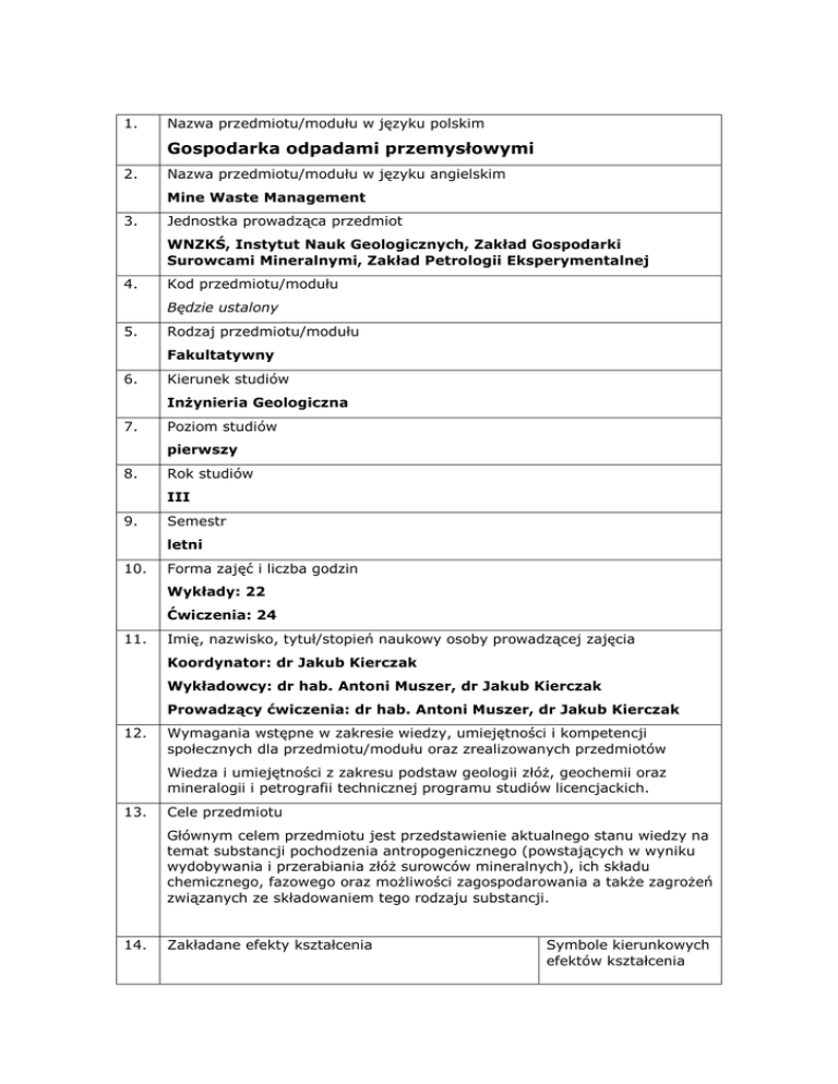 1. Nazwa przedmiotu/modułu w języku polskim Gospodarka odpadami przemysłowymi 2. Nazwa przedmiotu/modułu w języku angielskim Mine Waste Management 3. Jednostka prowadząca przedmiot WNZKŚ, Instytut Nauk Geologicznych, Zakład Gospodarki Surowcami Mineralnymi, Zakład Petrologii Eksperymentalnej 4. Kod przedmiotu/modułu Będzie ustalony 5. Rodzaj przedmiotu/modułu Fakultatywny 6. Kierunek studiów Inżynieria Geologiczna 7. Poziom studiów pierwszy 8. Rok studiów III 9. Semestr letni 10. Forma zajęć i liczba godzin Wykłady: 22 Ćwiczenia: 24 11. Imię, nazwisko, tytuł/stopień naukowy osoby prowadzącej zajęcia Koordynator: dr Jakub Kierczak Wykładowcy: dr hab. Antoni Muszer, dr Jakub Kierczak Prowadzący ćwiczenia: dr hab. Antoni Muszer, dr Jakub Kierczak 12. Wymagania wstępne w zakresie wiedzy, umiejętności i kompetencji społecznych dla przedmiotu/modułu oraz zrealizowanych przedmiotów Wiedza i umiejętności z zakresu podstaw geologii złóż, geochemii oraz mineralogii i petrografii technicznej programu studiów licencjackich. 13. Cele przedmiotu Głównym celem przedmiotu jest przedstawienie aktualnego stanu wiedzy na temat substancji pochodzenia antropogenicznego (powstających w wyniku wydobywania i przerabiania złóż surowców mineralnych), ich składu chemicznego, fazowego oraz możliwości zagospodarowania a także zagrożeń związanych ze składowaniem tego rodzaju substancji. 14. Zakładane efekty kształcenia Symbole kierunkowych efektów kształcenia 15. W_1 Posiada wiedzę w zakresie aktualnych problemów nauk o Ziemi związanych z eksploatacją i wykorzystaniem surowców mineralnych pochodzenia geogenicznego i antropogenicznego. K1_W04, InżK_W01, InżK_W11 W_2 Zna zasady planowania prac badawczych z wykorzystaniem technik i narzędzi stosowanych w geologii złożowej i mineralogii stosowanej. InżK_W03, InżK_W05 W_3 Ma wiedzę na temat podstawowych regulacji prawnych stosowanych w geologii i ochronie środowiska w związku z pozyskiwaniem i składowaniem surowców mineralnych ze złóż antropogenicznych. K1_W10, InżK_W12 U_1 Potrafi planować i wykonywać zadania badawcze lub ekspertyzy pod kierunkiem opiekuna naukowego. InżK_U02, InżK_U07 U_2 Potrafi interpretować i wykorzystywać wyniki badań mineralogiczno-geochemicznych w zakresie gospodarki surowcami naturalnymi i odpadami. K1_U02, InżK_U02 U_3 Posiada umiejętność pisania opracowań i raportów w języku polskim (a także krótkich streszczeń w języku angielskim). K1_U12, InżK_U10 K_1 Potrafi oceniać zagrożenia związane z eksploatacją złóż antropogenicznych i składowaniem odpadów powstających w wyniku tej eksploatacji Treści programowe InżK_K01, K_K05 Wykłady: Planowanie badań odpadów przemysłowych powstających w wyniku eksploatacji i przerabiania surowców mineralnych (żużle hutnicze, popioły, pyły, szkliwa, odpady górnicze, poflotacyjne). Dobór odpowiednich metod badawczych w zależności od analizowanego rodzaju materiału. Ewolucja dawnych i obecnych terenów przemysłowych, wietrzenie odpadów przemysłowych, metody określania wpływu odpadów na środowisko – testy ługowania spełniające wymagania prawne a także testy symulujące warunki naturalne. Ćwiczenia: Obserwacje odpadów przemysłowych w płytkach cienkich – wykorzystanie metod mineralogiczno-petrograficznych w badaniach odpadów. Żużle pirometalurgiczne jako odpowiednik skały magmowej. Określenie struktur i tekstur oraz składu fazowego żużli. Wyciąganie wniosków na temat warunków powstawania (tempo chłodzenia itp.). Fazy wtórne występujące w żużlach. Metody określania mobilności pierwiastków potencjalnie toksycznych – metody bezpośrednie (obserwacje i analizy in situ), metody bezpośrednie (ekstrakcje chemiczne) 16. Zalecana literatura (podręczniki) Literatura podstawowa: Lottermoser, B., G. (2007): Mine Wastes Characterization, Treatment and Environmental Impacts. 2nd edition. Springer. Szymański, A. (1997): Mineralogia techniczna. PWN. Warszawa. Literatura uzupełniająca: Wyderko-Delekta, M., Bolewski, A. (1995): Mineralogia spieków i grudek rudnych. Wydawnictwa AGH. Kraków. 17. Forma zaliczenia poszczególnych komponentów przedmiotu/modułu, sposób sprawdzenia osiągnięcia zamierzonych efektów kształcenia: Wykłady: Sprawdzian teoretyczny - kolokwium zaliczeniowe w postaci testu mieszanego, ocena pozytywna – uzyskanie minimum 50% punktów. W_1, W_2, W_3, U_2, K_1. Ćwiczenia: Złożenie kompletu sprawozdań z wykonywanych ćwiczeń praktycznych. W_1, W_2, W_3, U_1, U_2, U_3, K_1 18. Język wykładowy Polski 19. Obciążenie pracą studenta: Forma aktywności studenta Średnia liczba godzin na zrealizowanie aktywności Godziny zajęć (wg planu studiów) z nauczycielem: - wykład: 22 46 - ćwiczenia: 24 Praca własna studenta np.: - opracowanie wyników: 15 - czytanie wskazanej literatury: 5 50 - napisanie raportu z zajęć: 20 - przygotowanie do kolokwium: 10 Suma godzin Liczba punktów ECTS 96 4