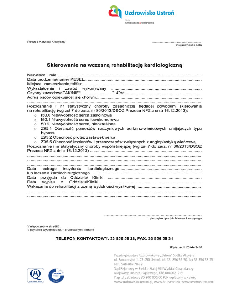 Pieczęć Instytucji Kierującej ......................................................... miejscowość i data Skierowanie na wczesną rehabilitację kardiologiczną Nazwisko i imię .......................................................................................................................... Data urodzenia/numer PESEL.................................................................................................... Miejsce zamieszkania,tel/fax...................................................................................................... Wykształcenie i zawód wykonywany ............................................................................. Czynny zawodowoTAK/NIE*.......................... ”L4”od................................................................. Adres osoby opiekującej się chorym.......................................................................................... .................................................................................................................................................... Rozpoznanie i nr statystyczny choroby zasadniczej będącej powodem skierowania na rehabilitację (wg zał 7 do zarz. nr 80/2013/DSOZ Prezesa NFZ z dnia 16.12.2013): o I50.0 Niewydolność serca zastoinowa o I50.1 Niewydolność serca lewokomorowa o 50.9 Niewydolność serca, nieokreślona o Z95.1 Obecność pomostów naczyniowych aortalno-wieńcowych omijających typu bypass o Z95.2 Obecność protez zastawek serca o Z95.5 Obecność implantów i przeszczepów związanych z angioplastyką wieńcową Rozpoznanie i nr statystyczny choroby współistniejącej (wg zał 7 do zarz. nr 80/2013/DSOZ Prezesa NFZ z dnia 16.12.2013) ............................................................................................... .................................................................................................................................................... .................................................................................................................................................... .................................................................................................................................................... Data ostrego incydentu kardiologicznego...................................................................... lub leczenia kardiochirurgicznego............................................................................................... Data przyjęcia do Oddziału/ Kliniki ................................................................................ Data wypisu z Oddziału/Kliniki........................................................................................ Wskazania do rehabilitacji z oceną wydolności wysiłkowej ....................................................... .................................................................................................................................................... .................................................................................................................................................... ............................................................................ pieczątka i podpis lekarza kierującego */ niepotrzebne skreślić */ czytelnie wypełnić druk – drukowanymi literami TELEFON KONTAKTOWY: 33 856 58 28, FAX: 33 856 58 34 Wydanie III 2014-12-16