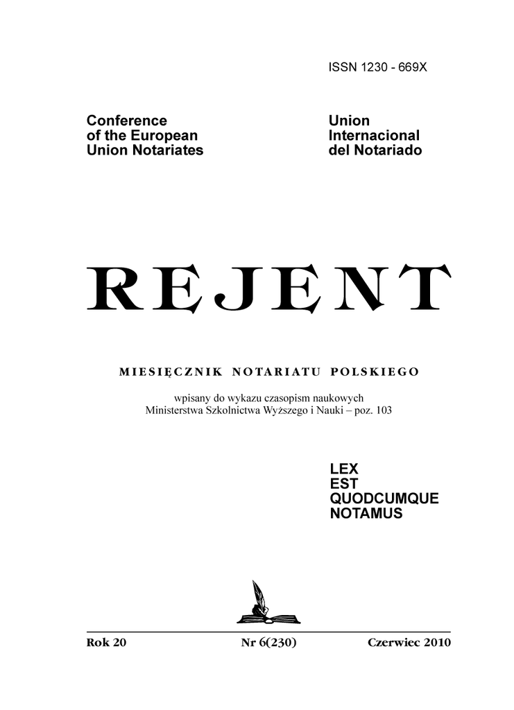 1 2 Miesiêcznik Notariatu Polskiego REJENT Rok 20 Nr 6(230) Czerwiec 2010 Spis treœci Artyku³y Magdalena D u r z y ñ s k a Podzia³ nieruchomoœci a dostêp do drogi publicznej .............. 9 Maria K a c z o r o w s k a Model eurohipoteki w podstawowych wytycznych Fundacji na Rzecz Kredytu Hipotecznego .............................................. 23 El¿bieta K o s z e l Nabycie prawa do spó³dzielczego lokalu mieszkalnego przez rodzinê zmar³ego ............................................................ 39 Alicja J a g i e l s k a - B u r d u k, Krzysztof M u l a r s k i Kurator osoby prawnej. Próba wyk³adni art. 42 k.c. ............. 66 Przemys³aw O l e k Rygoryzm a formalizm w dziedzinie oœwiadczeñ woli ............ 94 Marcin W a l a s i k W kwestii legitymacji procesowej wierzyciela do ¿¹dania uzgodnienia treœci ksiêgi wieczystej z rzeczywistym stanem prawnym ................................................................................ 105 3 Glosa Józef F o r y s t e k Glosa do postanowienia S¹du Najwy¿szego z dnia 26 listopada 2009 r., III CSK 30/09 ........................... 122 Aktualnoœci .............................................................................. 131 Przegl¹d orzecznictwa .......................................................... 142 Przegl¹d prawodawstwa ...................................................... 165 Co pisz¹ inni... ......................................................................... 171 4 Monthly Magazine of the Polish Notariate REJENT (Notary) 20th Year of Publicatio No 6(230) June 2010 Table of contents Articles Magdalena D u r z y ñ s k a Division of property and access to public road ........................ 9 Maria K a c z o r o w s k a Model of the Euromortgage in Basic Guidelines of the Foundation for Mortgage Credit .................................. 23 El¿bieta K o s z e l Acquisition of a right to the cooperative housing unit by the family of the deceased ................................................... 39 Alicja J a g i e l s k a - B u r d u k, Krzysztof M u l a r s k i Curator of the legal person. An attempt to interpret Article. 42 of Civil Code ........................................................... 66 Przemys³aw O l e k The rigorism but the formalism in the field of declarations of intent .................................................................................... 94 Marcin W a l a s i k In the issue of the trial card of the creditor for demanding agreeing on contents of the land and mortgage register with the real legal status ....................................................... 105 5 Gloss Józef F o r y s t e k Gloss on the decision of the Supreme Court of 26th November 2009, III CSK 30/09 ................................ 122 News ........................................................................................... 131 Review of jurisdiction ........................................................... 142 Review of legislation .............................................................. 165 From other publications... ................................................... 171 6 Monatszeitschrift des Polnischen Notariats REJENT (Notar) 20. Jahrgang Nr. 6(230) Juni 2010 Inhaltsverzeichnis Artikel Magdalena D u r z y ñ s k a Aufschlüsselung des Eigentums und den Zugang zu öffentlichen Straßen ............................................................. 9 Maria K a c z o r o w s k a Model der Euro-Hypothek in den Grund Richtlinien der Stiftung für Hypothekarkredite ........................................ 23 El¿bieta K o s z e l Rechtserwerb an die Genossenschaft Wohnung von der Familie des Verstorbenen ........................................... 39 Alicja J a g i e l s k a - B u r d u k, Krzysztof M u l a r s k i Kurator der juristischen Person. Versuch der Auslegung art. 42 des Bürgerliches Gesetzbuches .................................... 66 Przemys³aw O l e k Rigor und Formalismus im Bereich von Willenserklärungen ........................................................... 94 Marcin W a l a s i k In der Frage der Klagebefugnis des Gläubigers den Inhalt des Grundbuches mit dem tatsächlichen Rechtslage zu verabreden fordern ......................................... 105 7 Glosse Józef F o r y s t e k Glosse zum Beschluss des Obersten Gerichts vom 26. November 2009, III CSK 30/09 .............................. 122 Aktuelles ................................................................................... 131 Übersicht der Rechtsprechung ............................................ 142 Übersicht des Rechtswesens ................................................ 165 Aus anderen Quellen... ........................................................... 171 8
