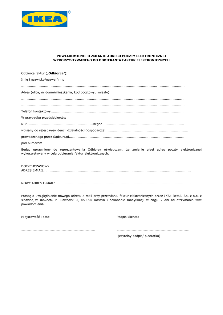 POWIADOMIENIE O ZMIANIE ADRESU POCZTY ELEKTRONICZNEJ WYKORZYSTYWANEGO DO ODBIERANIA FAKTUR ELEKTRONICZNYCH Odbiorca faktur („Odbiorca”): Imię i nazwisko/nazwa firmy ...................................................................................................................................................... Adres (ulica, nr domu/mieszkania, kod pocztowy, miasto) ...................................................................................................................................................... ...................................................................................................................................................... Telefon kontaktowy.......................................................................................................................... W przypadku przedsiębiorców NIP.............................................................Regon........................................................................... wpisany do rejestru/ewidencji działalności gospodarczej............................................................................ prowadzonego przez Sąd/Urząd.......................................................................................................... pod numerem..................................................................................................................................... Będąc uprawniony do reprezentowania Odbiorcy oświadczam, że zmianie uległ adres poczty elektronicznej wykorzystywany w celu odbierania faktur elektronicznych. DOTYCHCZASOWY ADRES E-MAIL: ...................................................................................................................................... NOWY ADRES E-MAIL: ............................................................................................................................ Proszę o uwzględnienie nowego adresu e-mail przy przesyłaniu faktur elektronicznych przez IKEA Retail. Sp. z o.o. z siedzibą w Jankach, Pl. Szwedzki 3, 05-090 Raszyn i dokonanie modyfikacji w ciągu 7 dni od otrzymania w/w powiadomienia. Miejscowość i data: Podpis klienta: ...................................................................................... ...................................................................................... (czytelny podpis/ pieczątka)