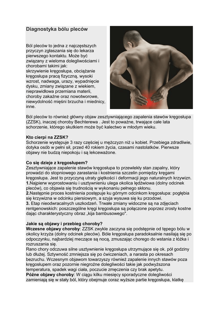 Diagnostyka bólu pleców Ból pleców to jedna z najczęstszych przyczyn zgłaszania się do lekarza pierwszego kontaktu. Może być związany z wieloma dolegliwościami i chorobami takimi jak: skrzywienie kręgosłupa, obciążanie kręgosłupa pracą fizyczną, wysoki wzrost, nadwaga, urazy, wypadnięcie dysku, zmiany związane z wiekiem, nieprawidłowa przemiana materii, choroby zakaźne oraz nowotworowe, niewydolność mięśni brzucha i miednicy, inne. Ból pleców to również główny objaw zesztywniającego zapalenia stawów kręgosłupa (ZZSK), inaczej choroby Bechterewa . Jest to poważne, trwające całe lata schorzenie, którego skutkiem może być kalectwo w młodym wieku. Kto cierpi na ZZSK? Schorzenie występuje 3 razy częściej u mężczyzn niż u kobiet. Przebiega zdradliwie, dotyka osób w pełni sił, przed 40 rokiem życia, czasami nastolatków. Pierwsze objawy nie budzą niepokoju i są lekceważone. Co się dzieje z kręgosłupem? Zesztywniające zapalenie stawów kręgosłupa to przewlekły stan zapalny, który prowadzi do stopniowego zarastania i kostnienia szczelin pomiędzy kręgami kręgosłupa. Jest to przyczyną utraty giętkości i deformacji jego naturalnych krzywizn. 1.Najpierw wyprostowaniu i usztywnieniu ulega okolica lędźwiowa (dolny odcinek pleców), co objawia się trudnością w wykonaniu pełnego skłonu. 2.Następnie proces kostnienia postępuje ku górnym odcinkom kręgosłupa: pogłębia się krzywizna w odcinku piersiowym, a szyja wysuwa się ku przodowi. 3. Etap nieodwracalnych uszkodzeń. Trwałe zmiany widoczne są na zdjęciach rentgenowskich: poszczególne kręgi kręgosłupa są połączone poprzez zrosty kostne dając charakterystyczny obraz „kija bambusowego". Jakie są objawy i przebieg choroby? Wczesne objawy choroby: ZZSK zwykle zaczyna się podstępnie od tępego bólu w okolicy krzyża (dolny odcinek pleców). Bóle kręgosłupa paradoksalnie nasilają się po odpoczynku, najbardziej meczące są nocą, zmuszając chorego do wstania z łóżka i rozruszania się. Rano chory odczuwa silne usztywnienie kręgosłupa utrzymujące się ok. pół godziny lub dłużej. Sztywność zmniejsza się po ćwiczeniach, a narasta po okresach bezruchu. Wczesnym objawom towarzyszy również zapalenie innych stawów poza kręgosłupem oraz pozornie niegroźne dolegliwości takie jak podwyższona temperatura, spadek wagi ciała, poczucie zmęczenia czy brak apetytu. Późne objawy choroby: W ciągu kilku miesięcy sporadyczne dolegliwości zamieniają się w stały ból, który obejmuje coraz wyższe partie kręgosłupa, klatkę piersiową, a także inne duże stawy (ramienne, łokciowe, kolanowe, skokowe, biodrowe, stawy rąk i stóp). Z czasem dochodzi do niemal całkowitego usztywnienia pleców, klatki piersiowej i karku. Chory jest stale przygarbiony, nie może swobodnie wyprostować pleców ani unieść głowy, nie jest w stanie schylić się lub skręcić tułowia, dlatego aby obejrzeć się za siebie musi obrócić całe ciało. Pojawia się tkliwość kości, czyli ból przy ucisku mostka, piszczeli i pięt. Powikłania i choroby towarzyszące Najpoważniejszym powikłaniem jest pęknięcie kręgosłupa, które może być spowodowane nawet niewielkim urazem. Tego typu uszkodzenia, szczególnie w okolicach szyi, mogą spowodować niedowład wszystkich kończyn. Inne choroby występujące u pacjentów z ZZSK: ostre i nawracające zapalenie tęczówki: ból oka, światłowstręt, łzawienie, choroby serca (niedomykalność zastawki aorty i niewydolność krążenia), niewydolność układu oddechowego, zmiany zapalne w jelicie grubym i cienkim, uszkodzenie nerek. Diagnostyka Ból, zesztywnienie kręgosłupa i określone zmiany na zdjęciach rentgenowskich należą do kryteriów rozpoznania ZZSK. Niestety podobne objawy występują w wielu różnych schorzeniach, dlatego właściwe rozpoznanie jest bardzo trudne i czasami ma miejsce dopiero po latach trwania dolegliwości. Typowe zmiany widoczne na zdjęciach rentgenowskich występują dopiero w zaawansowanym stadium, dlatego jedynym sposobem na rozpoznanie choroby we wczesnym okresie jest wykonanie badania genetycznego HLA-B27. Co to jest HLA-B27? HLA-B27 to nazwa genu związanego z występowaniem ZZSK, który znajduje się w genomie 90% - 96% chorych. Posiada 51 wariantów genetycznych, z czego 49 jest charakterystycznych dla tego schorzenia. Dwa pozostałe nie mają znaczenia klinicznego. Test Microarray HLA-B27 1. szybkie i proste badanie, do którego potrzebna jest jedynie próbka krwi 2. wykrywa wszystkie warianty genetyczne HLA-B27 3. różnicuje warianty HLA-B27 związane i nie związane z chorobą 4. daje w 100% pewne wyniki w przeciwieństwie do innych metod (np. badań serologicznych, gdzie błędy zdarzają się w 20%-30% przypadków). Na badania genetyczne nie mają wpływu czynniki mogące zaburzyć wynik (np. wiek pacjenta, dieta, infekcje), dlatego jest to najpewniejsza metoda diagnostyczna.