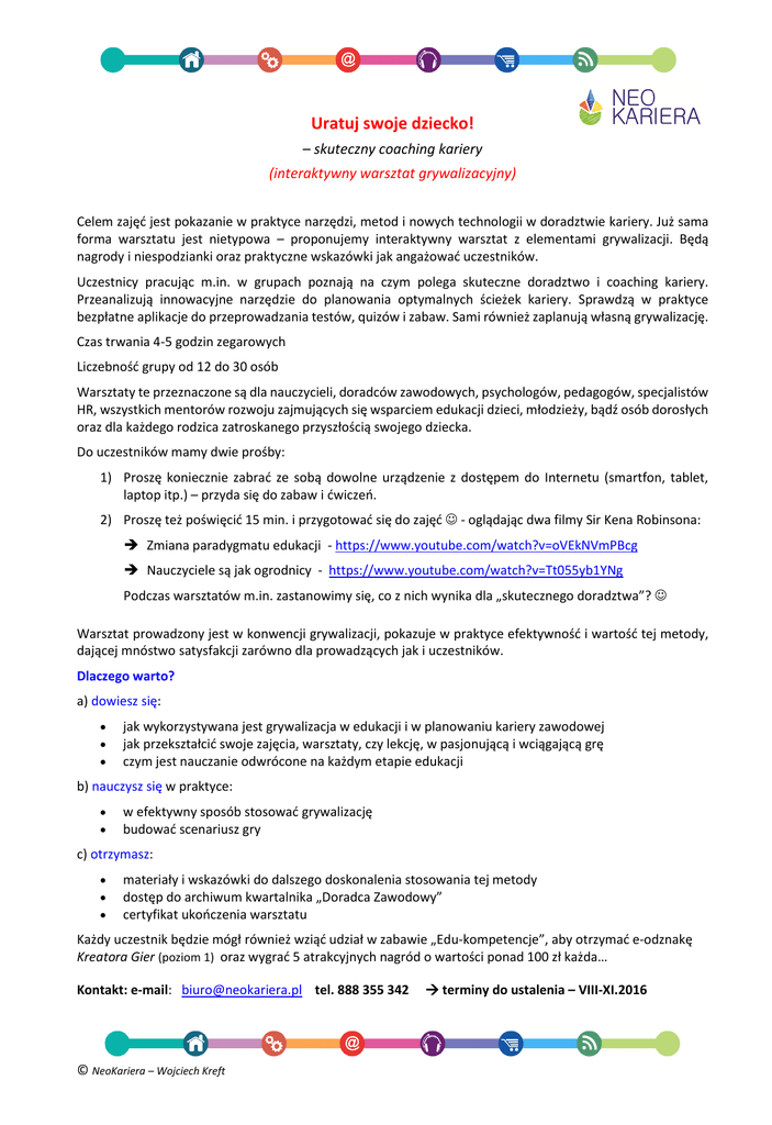 Uratuj swoje dziecko! – skuteczny coaching kariery (interaktywny warsztat grywalizacyjny) Celem zajęć jest pokazanie w praktyce narzędzi, metod i nowych technologii w doradztwie kariery. Już sama forma warsztatu jest nietypowa – proponujemy interaktywny warsztat z elementami grywalizacji. Będą nagrody i niespodzianki oraz praktyczne wskazówki jak angażować uczestników. Uczestnicy pracując m.in. w grupach poznają na czym polega skuteczne doradztwo i coaching kariery. Przeanalizują innowacyjne narzędzie do planowania optymalnych ścieżek kariery. Sprawdzą w praktyce bezpłatne aplikacje do przeprowadzania testów, quizów i zabaw. Sami również zaplanują własną grywalizację. Czas trwania 4-5 godzin zegarowych Liczebność grupy od 12 do 30 osób Warsztaty te przeznaczone są dla nauczycieli, doradców zawodowych, psychologów, pedagogów, specjalistów HR, wszystkich mentorów rozwoju zajmujących się wsparciem edukacji dzieci, młodzieży, bądź osób dorosłych oraz dla każdego rodzica zatroskanego przyszłością swojego dziecka. Do uczestników mamy dwie prośby: 1) Proszę koniecznie zabrać ze sobą dowolne urządzenie z dostępem do Internetu (smartfon, tablet, laptop itp.) – przyda się do zabaw i ćwiczeń. 2) Proszę też poświęcić 15 min. i przygotować się do zajęć - oglądając dwa filmy Sir Kena Robinsona: Zmiana paradygmatu edukacji - https://www.youtube.com/watch?v=oVEkNVmPBcg Nauczyciele są jak ogrodnicy - https://www.youtube.com/watch?v=Tt055yb1YNg Podczas warsztatów m.in. zastanowimy się, co z nich wynika dla „skutecznego doradztwa”? Warsztat prowadzony jest w konwencji grywalizacji, pokazuje w praktyce efektywność i wartość tej metody, dającej mnóstwo satysfakcji zarówno dla prowadzących jak i uczestników. Dlaczego warto? a) dowiesz się: jak wykorzystywana jest grywalizacja w edukacji i w planowaniu kariery zawodowej jak przekształcić swoje zajęcia, warsztaty, czy lekcję, w pasjonującą i wciągającą grę czym jest nauczanie odwrócone na każdym etapie edukacji b) nauczysz się w praktyce: w efektywny sposób stosować grywalizację budować scenariusz gry c) otrzymasz: materiały i wskazówki do dalszego doskonalenia stosowania tej metody dostęp do archiwum kwartalnika „Doradca Zawodowy” certyfikat ukończenia warsztatu Każdy uczestnik będzie mógł również wziąć udział w zabawie „Edu-kompetencje”, aby otrzymać e-odznakę Kreatora Gier (poziom 1) oraz wygrać 5 atrakcyjnych nagród o wartości ponad 100 zł każda… Kontakt: e-mail: [email protected] tel. 888 355 342 © NeoKariera – Wojciech Kreft terminy do ustalenia – VIII-XI.2016