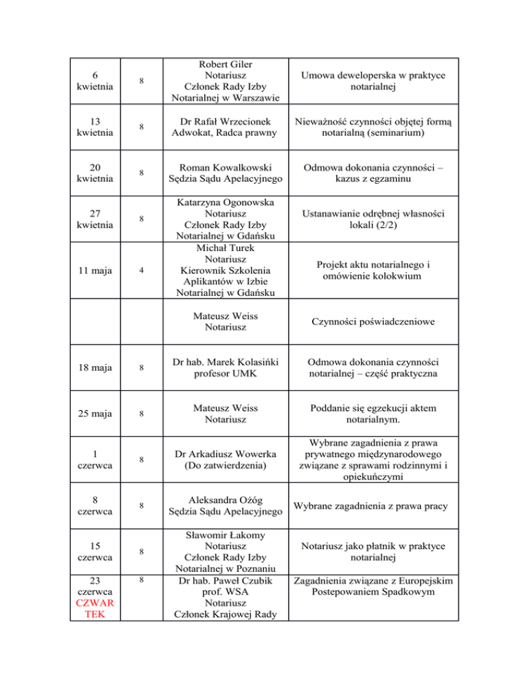 6 kwietnia 8 Robert Giler Notariusz Członek Rady Izby Notarialnej w Warszawie 13 kwietnia 8 Dr Rafał Wrzecionek Adwokat, Radca prawny Nieważność czynności objętej formą notarialną (seminarium) 20 kwietnia 8 Roman Kowalkowski Sędzia Sądu Apelacyjnego Odmowa dokonania czynności – kazus z egzaminu 27 kwietnia 8 11 maja 4 Katarzyna Ogonowska Notariusz Członek Rady Izby Notarialnej w Gdańsku Michał Turek Notariusz Kierownik Szkolenia Aplikantów w Izbie Notarialnej w Gdańsku Umowa deweloperska w praktyce notarialnej Ustanawianie odrębnej własności lokali (2/2) Projekt aktu notarialnego i omówienie kolokwium Mateusz Weiss Notariusz Czynności poświadczeniowe 18 maja 8 Dr hab. Marek Kolasińki profesor UMK Odmowa dokonania czynności notarialnej – część praktyczna 25 maja 8 Mateusz Weiss Notariusz Poddanie się egzekucji aktem notarialnym. 1 czerwca 8 Dr Arkadiusz Wowerka (Do zatwierdzenia) Wybrane zagadnienia z prawa prywatnego międzynarodowego związane z sprawami rodzinnymi i opiekuńczymi 8 czerwca 8 Aleksandra Ożóg Sędzia Sądu Apelacyjnego Wybrane zagadnienia z prawa pracy 15 czerwca 23 czerwca CZWAR TEK 8 8 Sławomir Łakomy Notariusz Członek Rady Izby Notarialnej w Poznaniu Dr hab. Paweł Czubik prof. WSA Notariusz Członek Krajowej Rady Notariusz jako płatnik w praktyce notarialnej Zagadnienia związane z Europejskim Postepowaniem Spadkowym Notarialnej 29 czerwca 8 Tomasz Kot Notariusz (Do zatwierdzenia) Zagadnienia z prawa prywatnego międzynarodowego