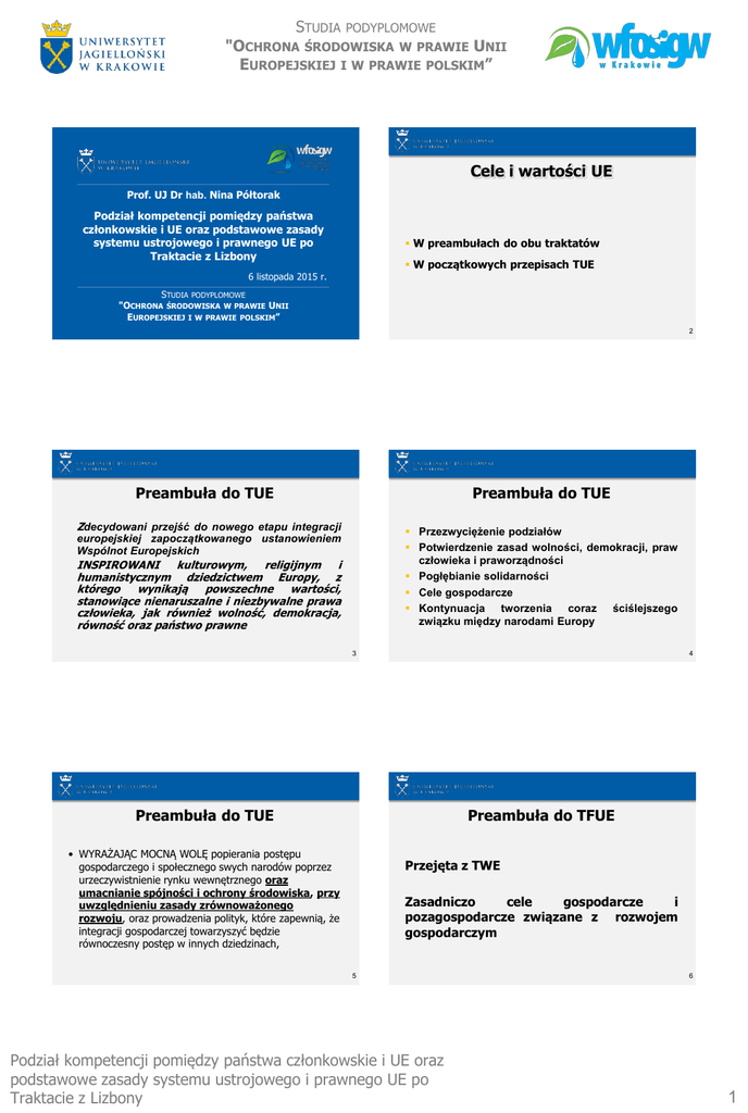 STUDIA PODYPLOMOWE "OCHRONA ŚRODOWISKA W PRAWIE UNII EUROPEJSKIEJ I W PRAWIE POLSKIM” Cele i wartości UE Prof. UJ Dr hab. Nina Półtorak Podział kompetencji pomiędzy państwa członkowskie i UE oraz podstawowe zasady systemu ustrojowego i prawnego UE po Traktacie z Lizbony W preambułach do obu traktatów W początkowych przepisach TUE 6 listopada 2015 r. STUDIA PODYPLOMOWE "OCHRONA ŚRODOWISKA W PRAWIE UNII EUROPEJSKIEJ I W PRAWIE POLSKIM” 2 Preambuła do TUE Preambuła do TUE Zdecydowani przejść do nowego etapu integracji Przezwyciężenie podziałów Potwierdzenie zasad wolności, demokracji, praw człowieka i praworządności Pogłębianie solidarności Cele gospodarcze Kontynuacja tworzenia coraz ściślejszego związku między narodami Europy europejskiej zapoczątkowanego ustanowieniem Wspólnot Europejskich INSPIROWANI kulturowym, religijnym i humanistycznym dziedzictwem Europy, z którego wynikają powszechne wartości, stanowiące nienaruszalne i niezbywalne prawa człowieka, jak również wolność, demokracja, równość oraz państwo prawne 3 4 Preambuła do TUE Preambuła do TFUE • WYRAŻAJĄC MOCNĄ WOLĘ popierania postępu gospodarczego i społecznego swych narodów poprzez urzeczywistnienie rynku wewnętrznego oraz umacnianie spójności i ochrony środowiska, przy uwzględnieniu zasady zrównoważonego rozwoju, oraz prowadzenia polityk, które zapewnią, że integracji gospodarczej towarzyszyć będzie równoczesny postęp w innych dziedzinach, Przejęta z TWE Zasadniczo cele gospodarcze i pozagospodarcze związane z rozwojem gospodarczym 5 Podział kompetencji pomiędzy państwa członkowskie i UE oraz podstawowe zasady systemu ustrojowego i prawnego UE po Traktacie z Lizbony 6 1 STUDIA PODYPLOMOWE "OCHRONA ŚRODOWISKA W PRAWIE UNII EUROPEJSKIEJ I W PRAWIE POLSKIM” Wartości - art. 2 TUE Aksjologia Unii Unia opiera się na wartościach poszanowania godności osoby ludzkiej, wolności, demokracji, równości, państwa prawnego, jak również poszanowania praw człowieka, w tym praw osób należących do mniejszości. Obowiązek przestrzegania wartości przez Unię (jej instytucje i organy) oraz państwa członkowskie Konsekwencje nieprzestrzegania – m.in. art. 7 TUE Art. 49 TUE - poszanowanie wartości jednym z warunków przystąpienia nowego państwa do UE Wartości te są wspólne Państwom Członkowskim w społeczeństwie opartym na pluralizmie, niedyskryminacji, tolerancji, sprawiedliwości, solidarności oraz na równości kobiet i mężczyzn. Poszanowanie praw podstawowych – art. 6 TUE 7 8 Cele i zadania Unii – art. 3 TUE Wspieranie pokoju, wartości i dobrobytu narodów Unii Zapewnienie przestrzeni wolności, bezpieczeństwa i sprawiedliwości bez granic wewnętrznych (polityka migracyjna, współpraca w sprawach cywilnych i karnych) Ustanowienie rynku wewnętrznego, trwałego rozwoju i innych wartości życia gospodarczego Cele i zadania Unii – art. 3 TUE Zwalczanie wykluczenia społecznego i dyskryminacji; wspieranie sprawiedliwości społecznej, ochrony socjalnej, równość kobiet i mężczyzn, solidarności między pokoleniami, praw dziecka Spójność i solidarność Poszanowanie różnorodności kulturowej i językowej Ustanowienie unii gospodarczej i walutowej z walutą euro Propagowanie wartości Unii na zewnątrz, przyczynianie się do pokoju i bezpieczeństwa światowego, przestrzegania i rozwoju prawa międzynarodowego 9 Cele UE – ochrona środowiska 10 Cele UE – ochrona środowiska • Art. 3 ust. 3 TUE: • Unia ustanawia rynek wewnętrzny. Działa na rzecz trwałego rozwoju Europy, którego podstawą jest zrównoważony wzrost gospodarczy oraz stabilność cen, społeczna gospodarka rynkowa o wysokiej konkurencyjności zmierzająca do pełnego zatrudnienia i postępu społecznego oraz wysoki poziom ochrony i poprawy jakości środowiska. Wspiera postęp naukowo-techniczny • • • • • Karta Praw Podstawowych TYTUŁ IV SOLIDARNOŚĆ Artykuł 37 Ochrona środowiska Wysoki poziom ochrony środowiska i poprawa jego jakości muszą być zintegrowane z politykami Unii i zapewnione zgodnie z zasadą zrównoważonego rozwoju. 11 Podział kompetencji pomiędzy państwa członkowskie i UE oraz podstawowe zasady systemu ustrojowego i prawnego UE po Traktacie z Lizbony 12 2 STUDIA PODYPLOMOWE "OCHRONA ŚRODOWISKA W PRAWIE UNII EUROPEJSKIEJ I W PRAWIE POLSKIM” Zasada przyznania Podział kompetencji - Zasada przyznania Zasada przyznania – art. 5 TUE Granice kompetencji Unii wyznacza zasada przyznania (…) Zgodnie z zasadą przyznania Unia działa wyłącznie w granicach kompetencji przyznanych jej przez Państwa Członkowskie w Traktatach do osiągnięcia określonych w nich celów. Wszelkie kompetencje nieprzyznane Unii w Traktatach należą do Państw Członkowskich. Art. 4 ust. 1 Zgodnie z artykułem 5 wszelkie kompetencje nieprzyznane Unii w Traktatach należą do Państw Członkowskich. • Art. 1 TUE Niniejszym Traktatem WYSOKIE UMAWIAJĄCE SIĘ STRONY ustanawiają między sobą UNIĘ EUROPEJSKĄ, zwaną dalej „Unią”, której Państwa Członkowskie przyznają kompetencje do osiągnięcia ich wspólnych celów 13 14 Zasada przyznania - podział kompetencji Zasada równości państw i poszanowania ich tożsamości narodowej Kompetencje UE (zakres pochodzą od państw Art. 4 ust. 2 TUE: Unia szanuje równość Państw Członkowskich wobec Traktatów, jak również ich tożsamość narodową, nierozerwalnie związaną z ich podstawowymi strukturami politycznymi i konstytucyjnymi, w tym w odniesieniu do samorządu regionalnego i lokalnego. Szanuje podstawowe funkcje państwa, zwłaszcza funkcje mające na celu zapewnienie jego integralności terytorialnej, utrzymanie porządku publicznego oraz ochronę bezpieczeństwa narodowego. W szczególności bezpieczeństwo narodowe pozostaje w zakresie wyłącznej odpowiedzialności każdego Państwa Członkowskiego. jej działania) członkowskich UE nie może samodzielnie pos