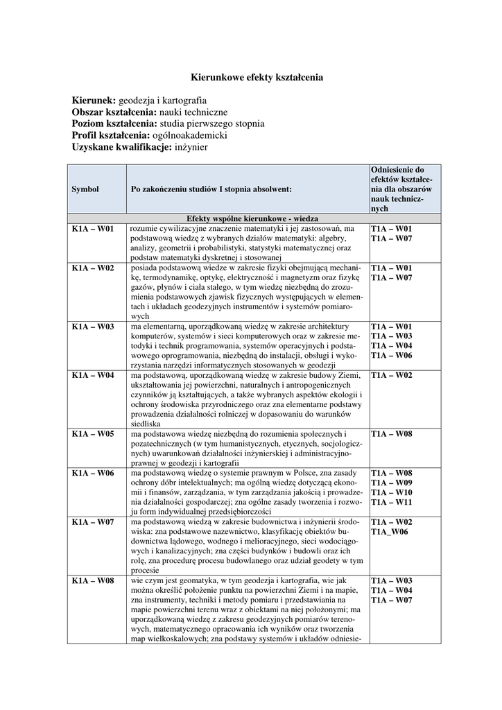 Kierunkowe efekty kształcenia Kierunek: geodezja i kartografia