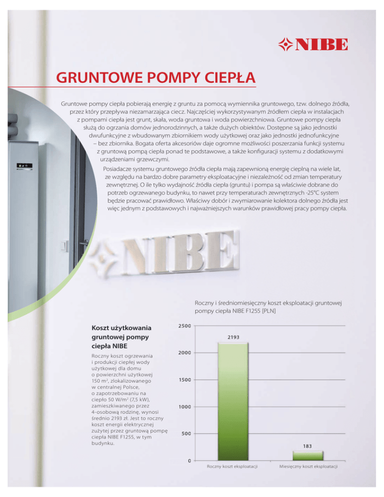 GRUNTOWE POMPY CIEPŁA Gruntowe pompy ciepła pobierają energię z gruntu za pomocą wymiennika gruntowego, tzw. dolnego źródła, przez który przepływa niezamarzająca ciecz. Najczęściej wykorzystywanym źródłem ciepła w instalacjach z pompami ciepła jest grunt, skała, woda gruntowa i woda powierzchniowa. Gruntowe pompy ciepła służą do ogrzania domów jednorodzinnych, a także dużych obiektów. Dostępne są jako jednostki dwufunkcyjne z wbudowanym zbiornikiem wody użytkowej oraz jako jednostki jednofunkcyjne – bez zbiornika. Bogata oferta akcesoriów daje ogromne możliwości poszerzania funkcji systemu z gruntową pompą ciepła ponad te podstawowe, a także konfiguracji systemu z dodatkowymi urządzeniami grzewczymi. Posiadacze systemu gruntowego źródła ciepła mają zapewnioną energię cieplną na wiele lat, ze względu na bardzo dobre parametry eksploatacyjne i niezależność od zmian temperatury zewnętrznej. O ile tylko wydajność źródła ciepła (gruntu) i pompa są właściwie dobrane do potrzeb ogrzewanego budynku, to nawet przy temperaturach zewnętrznych -25°C system będzie pracować prawidłowo. Właściwy dobór i zwymiarowanie kolektora dolnego źródła jest więc jednym z podstawowych i najważniejszych warunków prawidłowej pracy pompy ciepła. Roczny i średniomiesięczny koszt eksploatacji gruntowej pompy ciepła NIBE F1255 [PLN] Koszt użytkowania gruntowej pompy ciepła NIBE Roczny koszt ogrzewania i produkcji ciepłej wody użytkowej dla domu o powierzchni użytkowej 150 m 2, zlokalizowanego w centralnej Polsce, o zapotrzebowaniu na ciepło 50 W/m 2 (7,5 kW), zamieszkiwanego przez 4-osobową rodzinę, wynosi średnio 2193 zł. Jest to roczny koszt energii elektrycznej zużytej przez gruntową pompę ciepła NIBE F1255, w tym budynku. 2500 2193 2000 1500 1000 500 183 0 Roczny koszt eksploatacji Miesięczny koszt eksploatacji GRUNTOWE POMPY CIEPŁA NIBE F1126/1226 Pompy ciepła typu solanka/woda lub woda/woda zaprojektowane do oszczędnego i ekologicznego ogrzewania i produkcji c.w.u. w domach jedno- i wielorodzinnych. Pompa ciepła NIBE F1126 umożliwia podłączenie zewnętrznego zbiornika c.w.u. różnej budowy i pojemności. Z kolei NIBE F1226 to pompa dwufunkcyjna ze zintegrowanym wężownicowym zasobnikiem c.w.u. o pojemności 180 litrów. • wysoka temperatura zasilania c.o. 63o C (sprężarka) • monochromatyczny wyświetlacz LCD • wbudowane gniazdo USB do aktualizacji oprogramowania i przesyłu danych • wbudowany moduł miękkiego startu • elektroniczne pompy obiegowe z płynną regulacją prędkości • wysuwany moduł chłodniczy, co ułatwia transport i serwis • zintegrowany zbiornik c.w.u. ze stali nierdzewnej o poj. 180 litrów (dot. F1226) • SCOP 4,8 (dot. FXX26-8 kW, klimat chłodny, 35 C) o • COP 4,46 (dot. FXX26-8 kW, przy B0/W35 wg EN14511) • cicha praca (poziom ciśnienia akustycznego A++ KLASA ENERGETYCZNA 63°C TEMPERATURA ZASILANIA C.O. SCOP WYSOKI WSPÓŁCZYNNIK SPRAWNOŚCI 4,8 MODUŁOWA BUDOWA od 28 dB(A) przy B0/W35 w odl. 1 m wg EN 11203) • wbudowany moduł elektryczny 9 kW • zasilanie 3x400 V • klasa energetyczna A++ (zgodnie z Dyrektywą ErP, przy temp. zasilania 55 o C) • gwarancja do 5 lat* Budowa wewnętrzna NIBE F1226 NIBE F1126/1226 Sterownik pompy ciepła NIBE F1126 * Warunkiem obowiązywania gwarancji na pompy ciepła NIBE jest wykonanie przez Autoryzowanego Serwisanta / Instalatora „Pierwszego uruchomienia”. Koszt „Pierwszego Uruchomienia” obowiązujący w dniu wydania cennika wynosi 500 zł brutto + koszt dojazdu. Sprawdź aktualne warunki gwarancji i koszty na www.nibe.pl 6 | SYSTEMY Z POMPAMI CIEPŁA NIBE – Katalog z cennikiem GRUNTOWE POMPY CIEPŁA NIBE F1126/1226 Gruntowe pompy ciepła NIBE F1126 Parametry techniczne Jedn. F1126 6 kW F1126 8 kW F1126 12 kW Pobór mocy elektrycznej (wg EN 14511, przy B0/W35) kW 1,31 1,65 2,68 Moc grzewcza (wg EN 14511, przy B0/W35) kW 5,49 7,37 11,52 COP (wg EN 14511, przy B0/W35) SCOP (klimat chłodny, 35o) - 4,17 4,5 4,46 4,8 4,30 4,6 Klasa energetyczna (zgodnie z ErP, przy temp. zasilania 55oC) - A++ A++ A++ C 63 kW kg 0,9 9 (2/4/6/9) R407C 1,1 Maks. temp. zasilania górnego źródła (sprężarka) Moduł elektryczny Czynnik chłodniczy Ilość czynnika chłodniczego Poziom ciśnienia akustycznego (wg EN 11203, przy B0/W35 w odl. 1m) Masa o 1,2 dB(A) 28 29 29 kg 160 170 175 NIBE F1126 Gruntowe pompy ciepła NIBE F1226 Parametry techniczne Jedn. F1226 6 kW F1226 8 kW F1226 12 kW Pobór mocy elektrycznej (wg EN 14511, przy B0/W35) kW 1,31 1,65 2,68 Moc grzewcza (wg EN 14511, przy B0/W35) kW 5,49 7,37 11,52 COP (wg EN 14511, przy B0/W35) SCOP (klimat chłodny, 35o) - 4,17 4,5 4,46 4,8 4,30 4,6 Klasa energetyczna (zgodnie z ErP, przy temp. zasilania 55oC) - A++ A++ A++ Maks. temp. zasilania górnego źródła (sprężarka) Moduł elektryczny Czynnik chłodniczy Ilość czynnika chłodniczego Pojemność zbiornika c.w.u. Poziom ciśnienia akustycznego (wg EN 11203, przy B0/W35 w odl. 1m) Masa C 63 kW kg l 9 (2/4/6/9) R407C 1,1 180 0 0,9 1,2 dB(A) 28 29 29 kg 215 225 235 NIBE F1226 Ceny katalogowe Kod wyrobu Typ 065235 065236 065237 065228 065229 065230 F1126 6 kW F1126 8 kW F1126 12 kW F1226 6 kW F1226 8 kW F1226 12 kW Cena netto [PLN] Cena brutto [PLN] 20 500,00 21 500,00 24 000,00 24 600,00 25 700,00 27 700,00 25 215,00 26 445,00 29 520,00 30 258,00 31 611,00 34 071,00 www.nibe.pl | 7 GRUNTOWE POMPY CIEPŁA NIBE F1145/1245 Pompy ciepła nowej generacji typu solanka/woda lub woda/woda zaprojektowane do oszczędnego i ekologicznego ogrzewania oraz produkcji ciepłej wody użytkowej w domach jedno- i wielorodzinnych. Nowa generacja pomp ciepła NIBE to jeszcze wyższa efektywność, niższe koszty ogrzewania, a także przyjazny dla użytkownika system sterowania pracą urządzenia. Pompa ciepła NIBE F1145 umożliwia podłączenie zewnętrznego zbiornika c.w.u. różnej budowy i pojemności. Z kolei NIBE F1245 to pompa dwufunkcyjna