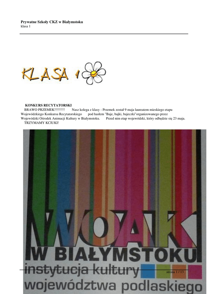 Prywatne Szkoły CKZ w Białymstoku klasa 1 KONKURS RECYTATORSKI BRAWO PRZEMEK!!!!!!!!! Nasz kolega z klasy - Przemek został 9 maja laureatem mieskiego etapu Wojewódzkiego Konkursu Recytatorskiego pod hasłem "Baje, bajki, bajeczki"organizowanego przez Wojewódzki Ośrodek Animacji Kultury w Białymstoku. Przed nim etap wojewódzki, który odbędzie się 23 maja. TRZYMAMY KCIUKI! strona 1 / 13 Prywatne Szkoły CKZ w Białymstoku klasa 1 strona 2 / 13 Prywatne Szkoły CKZ w Białymstoku klasa 1 strona 3 / 13 Prywatne Szkoły CKZ w Białymstoku klasa 1 SPOTKANIE Z PISARKĄ Majowe Dni Kultury rozpoczęło spotkanie z autorką opowiadań i bajek – panią Elżbietą Janikowską. Pisarka opowiedziała nam o swojej niełatwej pracy oraz przeczytała jedną ze swoich bajek. Nie była to jednak tylko zwykła strona 4 / 13 Prywatne Szkoły CKZ w Białymstoku klasa 1 bajka. Przypomniała nam o tym, jak należy opiekować się naszymi domowymi pupilami. Wiemy, że to nie tylko przyjemność, ale i obowiązek. Na koniec spotkania każdy zrobił pieska techniką orgiami. Może ktoś z nas też kiedyś zostanie pisarzem… strona 5 / 13 Prywatne Szkoły CKZ w Białymstoku klasa 1 strona 6 / 13 Prywatne Szkoły CKZ w Białymstoku klasa 1 strona 7 / 13 Prywatne Szkoły CKZ w Białymstoku klasa 1 DZIEŃ ZIEMI Kwietniowy Dzień Ziemi poświęciliśmy w naszej klasie RECYKLINGOWI. To bardzo trudne, ale ważne słowo. Już wiemy, że oznacza segregowanie, przetworzenie i ponowne wykorzystanie zużytych przedmiotów. Cały dzień rozmawialiśmy o tym, że bez naszej pomocy świat sam sobie nie da rady. Zajęcia zakończyliśmy demonstracją (to kolejne trudne słowo). Każdy miał transparent z hasłem. Domagaliśmy się czystego środowiska! strona 8 / 13 Prywatne Szkoły CKZ w Białymstoku klasa 1 strona 9 / 13 Prywatne Szkoły CKZ w Białymstoku klasa 1 WIELKANOC Już niedługo Wielkanoc. My także się do niej przygotowujemy. Zrobiliśmy nie tylko świąteczne ozdoby, ale też śmieszne baranki z twarogu i warzyw. Pycha!!! WESOŁYCH ŚWIĄT:) strona 10 / 13 Prywatne Szkoły CKZ w Białymstoku klasa 1 strona 11 / 13 Prywatne Szkoły CKZ w Białymstoku klasa 1 strona 12 / 13 Prywatne Szkoły CKZ w Białymstoku klasa 1 strona 13 / 13