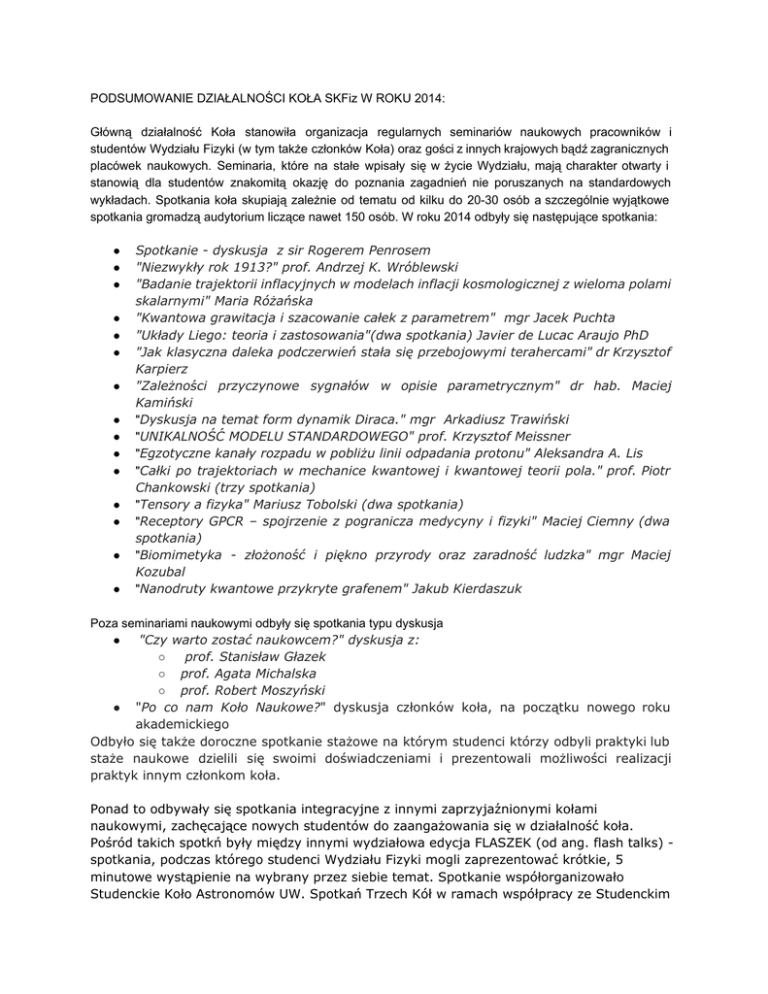 PODSUMOWANIE DZIAŁALNOŚCI KOŁA SKFiz W ROKU 2014: Główną działalność Koła stanowiła organizacja regularnych seminariów naukowych pracowników i studentów Wydziału Fizyki (w tym także członków Koła) oraz gości z innych krajowych bądź zagranicznych placówek naukowych. Seminaria, które na stałe wpisały się w życie Wydziału, mają charakter otwarty i stanowią dla studentów znakomitą okazję do poznania zagadnień nie poruszanych na standardowych wykładach. Spotkania koła skupiają zależnie od tematu od kilku do 2030 osób a szczególnie wyjątkowe spotkania gromadzą audytorium liczące nawet 150 osób. W roku 2014 odbyły się następujące spotkania: ● Spotkanie dyskusja z sir Rogerem Penrosem ● "Niezwykły rok 1913?" prof. Andrzej K. Wróblewski ● "Badanie trajektorii inflacyjnych w modelach inflacji kosmologicznej z wieloma polami skalarnymi" Maria Różańska ● "Kwantowa grawitacja i szacowanie całek z parametrem" mgr Jacek Puchta ● "Układy Liego: teoria i zastosowania"(dwa spotkania) Javier de Lucac Araujo PhD ● "Jak klasyczna daleka podczerwień stała się przebojowymi terahercami" dr Krzysztof Karpierz ● "Zależności przyczynowe sygnałów w opisie parametrycznym" dr hab. Maciej Kamiński ● " Dyskusja na temat form dynamik Diraca." mgr Arkadiusz Trawiński ● " UNIKALNOŚĆ MODELU STANDARDOWEGO" prof. Krzysztof Meissner ● " Egzotyczne kanały rozpadu w pobliżu linii odpadania protonu" Aleksandra A. Lis ● " Całki po trajektoriach w mechanice kwantowej i kwantowej teorii pola." prof. Piotr Chankowski (trzy spotkania) ● " Tensory a fizyka" Mariusz Tobolski (dwa spotkania) ● " Receptory GPCR – spojrzenie z pogranicza medycyny i fizyki" Maciej Ciemny (dwa spotkania) ● " Biomimetyka złożoność i piękno przyrody oraz zaradność ludzka" mgr Maciej Kozubal ● " Nanodruty kwantowe przykryte grafenem" Jakub Kierdaszuk Poza seminariami naukowymi odbyły się spotkania typu dyskusja ● "Czy warto zostać naukowcem?" dyskusja z: ○ prof. Stanisław Głazek ○ prof. Agata Michalska ○ prof. Robert Moszyński ● " Po co nam Koło Naukowe? " dyskusja członków koła, na początku nowego roku akademickiego Odbyło się także doroczne spotkanie stażowe na którym studenci którzy odbyli praktyki lub staże naukowe dzielili się swoimi doświadczeniami i prezentowali możliwości realizacji praktyk innym członkom koła. Ponad to odbywały się spotkania integracyjne z innymi zaprzyjaźnionymi kołami naukowymi, zachęcające nowych studentów do zaangażowania się w działalność koła. Pośród takich spotkń były między innymi wydziałowa edycja FLASZEK (od ang. flash talks) spotkania, podczas którego studenci Wydziału Fizyki mogli zaprezentować krótkie, 5 minutowe wystąpienie na wybrany przez siebie temat. Spotkanie współorganizowało Studenckie Koło Astronomów UW. Spotkań Trzech Kół w ramach współpracy ze Studenckim Kołem Nanotechnologii "Nanorurki" oraz Studenckim Kołem Astronomów. Podczas spotkania wybrany przedstawiciel z danego koła sygłaszał seminarium, 5minutowe wystąpienie lub prezentował najświeższe wiadomości z dziedziny związanej z działalnością danego koła naukowego. Nową działalnością koła są spotkania "Lektury prac ważnych" odbywające się co tydzień i polegające na spotkaniach w małym gronie zainteresowanych członków koła celem lektury ważnych historycznych prac które był przełomowe dla fizyki. Coroczny obóz naukowy SKFiz odbył się w Bukowinie Tatrzańskiej. Każdy z uczestników, w tym Opiekun Koła, prof. Stanisław Głazek wygłosił referat na wybrany przez siebie temat. Poziom naukowy Obozu jak zwykle był wysoki i świadczy o istotnej roli SKFiz dla naukowego rozwoju jego członków. W roku 2014 w ramach realizacji założeń statutowych Koło prowadziło działalność popularyzatorską wyrażoną poprzez działalność pokazową i organizację warsztatów. Do największych przedsięwzięć należy udział w XVIII Pikniku Naukowym w Warszawie na którym zaprezentowaliśmy się wieloma pokazami, wśród których znalazły się pokazy z ciekłym azotem, wysokimi napięciami, promieniowaniem jonizującym. Podobne doświadczenia popularyzujące fizykę prezentowaliśmy też na Dniu Fizyka organizowanym przez Wydział Fizyki UW.