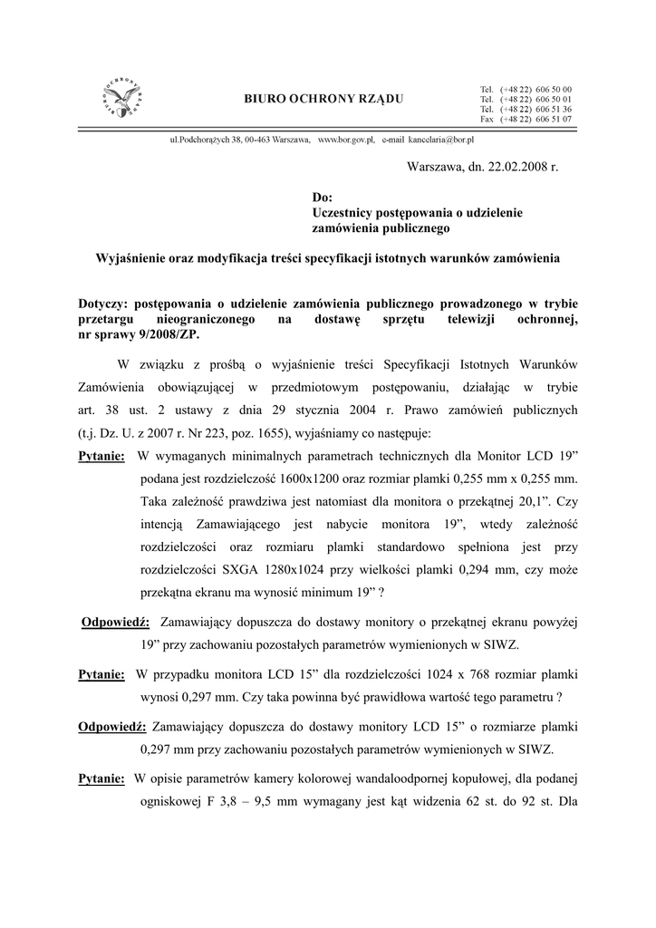 Warszawa, dn. 22.02.2008 r. Do: Uczestnicy postępowania o udzielenie zamówienia publicznego Wyjaśnienie oraz modyfikacja treści specyfikacji istotnych warunków zamówienia Dotyczy: postępowania o udzielenie zamówienia publicznego prowadzonego w trybie przetargu nieograniczonego na dostawę sprzętu telewizji ochronnej, nr sprawy 9/2008/ZP. W związku z prośbą o wyjaśnienie treści Specyfikacji Istotnych Warunków Zamówienia obowiązującej w przedmiotowym postępowaniu, działając w trybie art. 38 ust. 2 ustawy z dnia 29 stycznia 2004 r. Prawo zamówień publicznych (t.j. Dz. U. z 2007 r. Nr 223, poz. 1655), wyjaśniamy co następuje: Pytanie: W wymaganych minimalnych parametrach technicznych dla Monitor LCD 19” podana jest rozdzielczość 1600x1200 oraz rozmiar plamki 0,255 mm x 0,255 mm. Taka zaleŜność prawdziwa jest natomiast dla monitora o przekątnej 20,1”. Czy intencją Zamawiającego rozdzielczości oraz jest nabycie rozmiaru plamki monitora 19”, standardowo wtedy spełniona zaleŜność jest przy rozdzielczości SXGA 1280x1024 przy wielkości plamki 0,294 mm, czy moŜe przekątna ekranu ma wynosić minimum 19” ? Odpowiedź: Zamawiający dopuszcza do dostawy monitory o przekątnej ekranu powyŜej 19” przy zachowaniu pozostałych parametrów wymienionych w SIWZ. Pytanie: W przypadku monitora LCD 15” dla rozdzielczości 1024 x 768 rozmiar plamki wynosi 0,297 mm. Czy taka powinna być prawidłowa wartość tego parametru ? Odpowiedź: Zamawiający dopuszcza do dostawy monitory LCD 15” o rozmiarze plamki 0,297 mm przy zachowaniu pozostałych parametrów wymienionych w SIWZ. Pytanie: W opisie parametrów kamery kolorowej wandaloodpornej kopułowej, dla podanej ogniskowej F 3,8 – 9,5 mm wymagany jest kąt widzenia 62 st. do 92 st. Dla przetwornika 1/3” oraz ogniskowej F 3,8 – 9,5 mm zakres kątów widzenia wynosi 62 – 29 stopni, czy taki zakres jest wymagany ? Odpowiedź: Zamawiający zainteresowany jest dostawą kamery kolorowej wandaloodpornej kopułowej posiadającej kąt widzenia 62 º – 29 º przy zachowaniu pozostałych parametrów wymienionych w SIWZ. Jednocześnie na podstawie art. 38 ust. 4 ustawy z dnia 29 stycznia 2004 r. Prawo zamówień publicznych (t.j. Dz. U.z 2007 r. Nr 223, poz. 1655), Zamawiający modyfikuje treść Specyfikacji Istotnych Warunków Zamówienia w nw. zakresie: 1. W załączniku nr 2 do SIWZ, w wierszu nr 3 (Kamera kolorowa wandaloodporna kopułowa), w kolumnie nr 3 (Wymagane parametry techniczne) skreśla się wyraŜenie o treści: „Poziomy kąt widzenia obiektywu: 62 º – 92 º ” i w to miejsce wpisuje się nowe wyraŜenie o treści: „Poziomy kąt widzenia obiektywu: 62 º – 29 º ”. 2. W załączniku nr 2 do SIWZ, w wierszu nr 4 (Monitor LCD 19”), w kolumnie nr 3 (Wymagane parametry techniczne), po wyraŜeniu o treści: „Typ matrycy: 19” ” wpisuje się wyraŜenie: „(lub większa)” 3. W załączniku nr 2 do SIWZ, w wierszu nr 5 (Monitor LCD 15”), w kolumnie nr 3 (Wymagane parametry techniczne), po wyraŜeniu o treści: „Rozmiar plamki: 0.264 x 0.264” wpisuje się wyraŜenie: „lub 0.297 x 0.297”. W celu umoŜliwienia Państwu wprowadzenia w ofertach zmian wynikających z modyfikacji treści Specyfikacji Istotnych Warunków Zamówienia, termin składania ofert określony w pkt. 12 ppkt. 1 SIWZ ulega przedłuŜeniu i upływa dnia 27.02.2008 r. o godz. 10.00. Otwarcie ofert, o którym mowa w pkt. 12 ppkt. 3 SIWZ nastąpi dnia 27.02.2008 r. o godz. 11.00. PowyŜsze zmiany terminów mają zastosowanie do wszystkich postanowień SIWZ, które odnoszą się do terminów składania i otwarcia ofert.