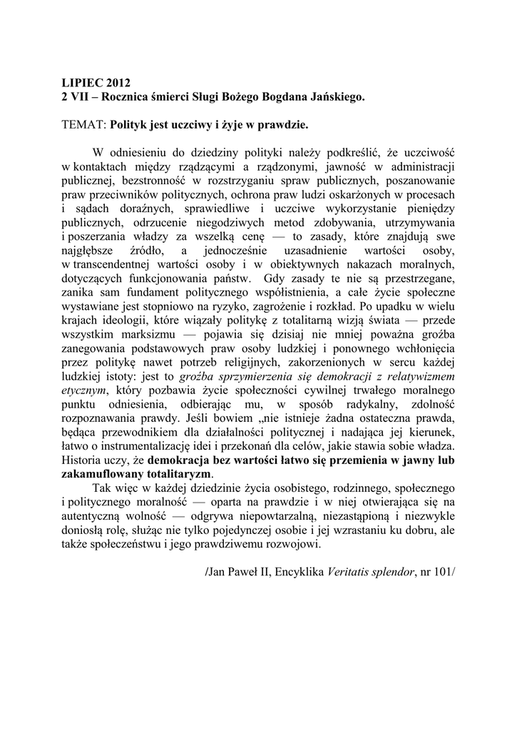 LIPIEC 2012 2 VII – Rocznica śmierci Sługi Bożego Bogdana Jańskiego. TEMAT: Polityk jest uczciwy i żyje w prawdzie. W odniesieniu do dziedziny polityki należy podkreślić, że uczciwość w kontaktach między rządzącymi a rządzonymi, jawność w administracji publicznej, bezstronność w rozstrzyganiu spraw publicznych, poszanowanie praw przeciwników politycznych, ochrona praw ludzi oskarżonych w procesach i sądach doraźnych, sprawiedliwe i uczciwe wykorzystanie pieniędzy publicznych, odrzucenie niegodziwych metod zdobywania, utrzymywania i poszerzania władzy za wszelką cenę — to zasady, które znajdują swe najgłębsze źródło, a jednocześnie uzasadnienie wartości osoby, w transcendentnej wartości osoby i w obiektywnych nakazach moralnych, dotyczących funkcjonowania państw. Gdy zasady te nie są przestrzegane, zanika sam fundament politycznego współistnienia, a całe życie społeczne wystawiane jest stopniowo na ryzyko, zagrożenie i rozkład. Po upadku w wielu krajach ideologii, które wiązały politykę z totalitarną wizją świata — przede wszystkim marksizmu — pojawia się dzisiaj nie mniej poważna groźba zanegowania podstawowych praw osoby ludzkiej i ponownego wchłonięcia przez politykę nawet potrzeb religijnych, zakorzenionych w sercu każdej ludzkiej istoty: jest to groźba sprzymierzenia się demokracji z relatywizmem etycznym, który pozbawia życie społeczności cywilnej trwałego moralnego punktu odniesienia, odbierając mu, w sposób radykalny, zdolność rozpoznawania prawdy. Jeśli bowiem „nie istnieje żadna ostateczna prawda, będąca przewodnikiem dla działalności politycznej i nadająca jej kierunek, łatwo o instrumentalizację idei i przekonań dla celów, jakie stawia sobie władza. Historia uczy, że demokracja bez wartości łatwo się przemienia w jawny lub zakamuflowany totalitaryzm. Tak więc w każdej dziedzinie życia osobistego, rodzinnego, społecznego i politycznego moralność — oparta na prawdzie i w niej otwierająca się na autentyczną wolność — odgrywa niepowtarzalną, niezastąpioną i niezwykle doniosłą rolę, służąc nie tylko pojedynczej osobie i jej wzrastaniu ku dobru, ale także społeczeństwu i jego prawdziwemu rozwojowi. /Jan Paweł II, Encyklika Veritatis splendor, nr 101/ ks. dr Zbigniew Prusiński Szkoła Wyższa im. Bogdana Jańskiego Warszawa Wydaje się, że uczciwość nie idzie w parze z człowiekiem, szczególnie w takim środowisku jak scena polityczna. Oczywiście nie oznacza to, że w polityce działają zatwardziali oszuści, którym wszystko jedno co i jak osiągną. Ważne, że na tym zyskają oni, a przy okazji też ci, z którymi razem tworzą dane ugrupowanie. Nie bez przyczyny osoby, które w polityce funkcjonują, czasem przyznają, że mają spory problem z tym, by spojrzeć w lustro i powiedzieć, że jest się w porządku i nie złamało swoich przyrzeczeń. Oczywiście to, że ktoś działa w polityce nie powinno być usprawiedliwieniem tego, że łamie swoje zasady z coraz większą łatwością. Takie postępowanie rodzi niebezpieczeństwo, że nie tylko wobec siebie człowiek będzie nieszczery, ale też nieuczciwość wkradnie się w jego normalne działania, związane z tym, jakie stanowisko zajmuje. Politycy, którzy będą całkowicie uczciwi, w dużym stopniu też przyczyniają się do tego, że poprawie ulegnie właśnie jakość życia politycznego. Ta kwestia jest od lat poruszana i to przez wiele środowisk, niezależnie od siebie. Zatem chyba dobrze by było, żeby coraz więcej ludzi faktycznie uczciwie odpowiadało sobie na pewne pytania, jeszcze na samym początku określonej drogi. Dzięki temu unikną rozczarowań, a przede wszystkim ciężkich rozterek, które mogłyby się cieniem położyć na ich życiu prywatnym. Lepiej zająć się czymś innym, niż polityka jeśli miałoby to być związane z tym, że ktoś się „sprzeda” i potem będzie tego gorzko żałował. Obserwując scenę polityczną w dowolnym kraju, możemy bardzo łatwo się przekonać, jak wielu umiejętności wymaga od ludzi, którzy chcą na nią wkroczyć. Wśród wielu cech, jakie wydają się być potrzebnymi, czy wręcz niezbędnymi, kontrowersje niezmiennie wzbudza jedna - prawdomówność. Podobnie jak w życiu codziennym tak i w polityce, mówienie prawdy i tylko prawdy, nie zawsze wychodzi i słuchaczom, i mówcy na dobre. Nie jest też łatwe i nie zawsze przyjemne, ale ma jedną główną i niepodważalną zaletę - jest uczciwe. W przypadku polityków uczciwość wydaje się być niezbędna, ale czy na pewno? Przywykliśmy do tego, że politycy z przeciwnych sobie ugrupowań, często zarzucają sobie mówienie nieprawdy, przedstawianie zafałszowanego obrazu rzeczywistości, stronniczą interpretację faktów etc. Zazwyczaj druga strona odpowiada tym samym. Najprostszy wniosek nakazuje sądzić, że jedna ze stron kłamie. Niestety, z perspektywy zwykłego zjadacza chleba, jednoznaczne wskazanie tego, kto mija się z prawdą, jest dość trudne, żeby nie rzec niemożliwe. Nie tylko dlatego, że politycy to często mistrzowie w ukrywaniu emocji. Nie zdradzają swoich intencji oczywistymi gestami. Ludzie patrzący z różnych perspektyw, na to samo wydarzenie, mogą je zinterpretować zupełnie inaczej. Tym bardziej, że politycy właściwie wszystko potrafią zinterpretować na swoją korzyść. Gdzie więc jest miejsce na prawdę w polityce? Zapewne gdzieś w kuluarach. Przed obiektywami kamer próżno jej szukać. O tym, co jest prawdą, decyduje program polityczny. Ewentualnie w grę mogą wchodzić bardziej osobiste przekonania, ale to dotyczy polityków niezależnych, choć nadal należących do partii politycznych. Tacy, o dziwo, też się zdarzają. Wszystko jest jednak skrupulatnie prowadzoną grą, gdzie ważne jest każde słowo, niekoniecznie zgodne z prawdą, ale koniecznie musi bliźniaczo ją przypominać. Wyborcy lubią jasność. Szczegól