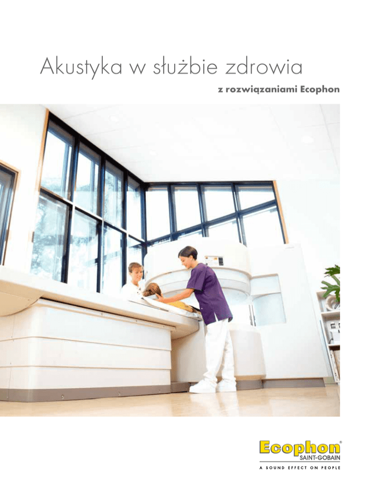 Akustyka w służbie zdrowia z rozwiązaniami Ecophon Publikacja prezentuje rozwiązania Ecophon oraz produkty innych dostawców. Jest to ogólne źródło informacji co do tego, który produkt jest odpowiedni przy uwzględnieniu danych warunków. Przedstawione dane techniczne oparte są na badaniach przeprowadzonych w typowych warunkach oraz na naszym długoletnim doświadczeniu. Opisane właściwości i zastosowania są ważne pod warunkiem postępowania zgodnie ze szkicami montażowymi i instalacyjnymi, zasadami użytkowania i serwisowania produktów oraz innymi zaleceniami. W przypadku odstępstw od zaleceń (np. zastąpienia oryginalnych komponentów systemu lub produktów), Ecophon nie bierze odpowiedzialności za otrzymane właściwości czy funkcjonalność. Wszystkie zawarte tu opisy, zdjęcia, rysunki i wizualizacje stanowią ogólną informację i nie są częścią umowy. Ecophon zastrzega sobie prawo do zmian w ofercie bez wcześniejszej informacji. Ecophon nie bierze odpowiedzialności za błędy w druku. W celu uzyskania najbardziej aktualnych informacji zapraszamy na www.ecophon.pl lub prosimy o kontakt z Doradcą Technicznym Ecophon. © Ecophon Group 2013 Pomysł i opracowanie: Saint-Gobain Ecophon AB. Druk: Skånetryck AB. 2 Przenieś warunki z zewnątrz do wewnątrz i zapewnij dobre samopoczucie Ewoluując przez tysiące lat, nasz słuch dostosował się do warunków akustycznych panujących na zewnątrz, tam też słyszymy najlepiej. Jednak dzisiaj spędzamy od 80 do 90% czasu we wnętrzach budynków. Od ponad 50 lat szerzymy wiedzę na temat tego, jak tworzyć warunki wewnątrz pomieszczeń, podobne do tych, które panują na zewnątrz. Nasze innowacyjne systemy dźwiękochłonne umożliwiają zaprojektowanie pomieszczenia o najwyższym komforcie akustycznym pomagającym ludziom w pracy, nauce, rekonwalescencji i odpoczynku. Chcemy być pewni, że systemy Ecophon są najlepszej jakości, dlatego poddajemy je niezależnym testom i pomiarom akustycznym. Przyjazne dla oka, ucha i umysłu Nasze systemy akustyczne znajdują zastosowanie we wszystkich rodzajach pomieszczeń, od małych sal konferencyjnych do zakładów służby zdrowia o podwyższonych wymaganiach higienicznych. Mimo, iż skupiamy się głównie na słuchu, istotny pozostaje komfort dla oczu oraz umysłu. Dlatego oferujemy bogatą kolekcję sufitów wypełniających przestrzeń od ściany do ściany, wolnowiszących paneli akustycznych, paneli ściennych oraz ekranów – wszystko po to, aby umożliwić stworzenie przyjaznej atmosfery dla ucha, oka i umysłu. W trosce o środowisko Wszelkie nasze działania skupiają się wokół ludzi. Jest zatem dla nas zupełnie naturalne, aby ograniczać wpływ na środowisko. Systemy Ecophon w 100% nadają się do powtórnego przetworzenia. Wełna szklana, z której produkowane są nasze systemy pochodzi w ponad 70% z przetworzonego szkła użytku domowego w połączeniu ze spoiwem pochodzenia roślinnego. Nasze absorbery odznaczają się wyjątkowo niską wagą, co oznacza mniejsze spalanie paliwa podczas transportu. W fabrykach wykorzystujemy odnawialne źródła energii. Nie dodajemy szkodliwych substancji do naszej farby na bazie wody. Z odpadów produkcyjnych udało nam się stworzyć biodegradowalny granulat drenujący. Ecophon – dźwięk wpływa na ludzi. 3 Rozwiązania akustyczne a wymagania higieniczne Podstawową funkcją systemów Ecophon jest poprawa akustyki wnętrz. Od właściwości akustycznych konkretnego rozwiązania zależy, jaka będzie w pomieszczeniu propagacja dźwięku oraz jego głośność i wyrazistość. Od rodzaju zastosowanych materiałów zależy też pogłosowość pomieszczenia. Dbając o akustykę w placówkach służby zdrowia należy wziąć pod uwagę wymagania higieniczne, które w zależności od rodzaju pomieszczenia mogą się różnić. I oczywiście się różnią. Jest dla nas zupełnie naturalnym, że rozwiązania Ecophon powinny uwzględniać wysokie wymagania higieniczne w produktach przeznaczonych do pomieszczeń służby zdrowia. Łatwo można dobrać odpowiedni rodzaj systemów do projektowania różnych pomieszczeń szpitalnych, centrów medycznych, zakładów opieki medycznych, gabinetów stomatologicznych lub innych pomieszczeń służby zdrowia. Sześć kategorii higienicznych, przedstawionych na następnej stronie, oparte jest na brytyjskim standardzie HBN00-10, francuskiej normie NF S90-351 oraz naszym doświadczeniu i wiedzy. 4 Kategorie higieniczne a system akustyczny Przedstawiamy sześć, łatwych do sklasyfikowania, kategorii higienicznych. Zaczynając od dołu, zastanów się, jakie wymagania higieniczne musi spełniać rozwiązanie akustyczne w pomieszczeniach służby zdrowia. Czy ma być czyszczone na sucho, czy przecierane na mokro, posiadać klasę ISO 5 czy coś więcej? Przekonaj się, że systemy Ecophon spełniają wszelkie wymagania. Wszystkie systemy z rodziny Ecophon Hygiene spełniają wymagania ISO 5 i są odporne na HPV (para nadtlenku wodoru). + ISO 3 i codzienna dezynfekcja Hygiene Advance A C3 Hygiene Advance Wall C3 + Szczelność gazowa Hygiene LabotecAir A C1 + Odpychanie cząsteczek Hygiene Labotec Ds C1 Hygiene Protec A C1 + Dezynfekcja Hygiene Meditec A C1 Hygiene Meditec E C1 Hygiene Performance A C1 + ISO 5 i HPV Hygiene Clinic A C1 Hygiene Clinic E C1 1 + Przecieranie na sucho i na mokro Focus A Focus Ds Focus E Doskonała akustyka wnętrz Ecophon 2 3 4 5 6 5 Fakty i certyfikaty Ecophon akustyka oraz wymagania higieniczne ”Podczas gdy impregnowane produkty przeciwdrobnoustrojowe (jak powłoki powierzchniowe, farby czy zasłony) oraz substancje przeciwbakteryjne są ogólnie dostępne, nie ma w chwili obecnej ostatecznych danych potwierdzających ich skuteczność w zmniejszaniu infekcji w służbie zdrowia.” Health Building Note 00-10 (HBN00-10) Odpowiednia akustyka w pomieszczeniach służby zdrowia jest bardzo ważna zarówno dla pacjentów, jak i personelu. Badania wykazu