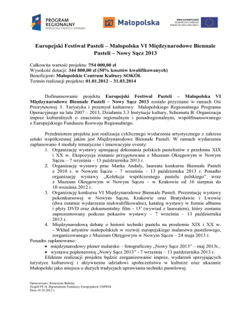 Europejski Festiwal Pasteli – Małopolska VI Międzynarodowe Biennale Pasteli – Nowy Sącz 2013 Całkowita wartość projektu: 754 000,00 zł Wysokość dotacji: 344 800,00 zł (50% kosztów kwalifikowanych) Beneficjent: Małopolskie Centrum Kultury SOKÓŁ Termin realizacji projektu: 01.01.2012 – 31.03.2014 Dofinansowanie projektu Europejski Festiwal Pasteli – Małopolska VI Międzynarodowe Biennale Pasteli – Nowy Sącz 2013 zostało przyznane w ramach Osi Priorytetowej 3. Turystyka i przemysł kulturowy Małopolskiego Regionalnego Programu Operacyjnego na lata 2007 – 2013, Działania 3.3 Instytucje kultury, Schematu B: Organizacja imprez kulturalnych o znaczeniu regionalnym i ponadregionalnym, współfinansowanego z Europejskiego Funduszu Rozwoju Regionalnego. Przedmiotem projektu jest realizacja cyklicznego wydarzenia artystycznego z zakresu sztuki współczesnej jakim jest Międzynarodowe Biennale Pasteli. W ramach wydarzenia zaplanowano 4 moduły tematyczne i innowacyjne eventy: 1. Organizację wystawy ujmującej dokonania polskich pastelistów z przełomu XIX i XX w. Ekspozycja zostanie przygotowana z Muzeum Okręgowym w Nowym Sączu – 7 września – 13 października 2013 r. 2. Organizację wystawy prac Marka Andały, laureata konkursu Biennale Pasteli z 2010 r. w Nowym Sączu – 7 września – 13 października 2013 r. Ponadto organizację wystawy „Kolekcja współczesnego pastelu polskiego” wraz z Muzeum Okręgowym w Nowym Sączu – w Krakowie od 16 sierpnia do 10 września 2012 r. 3. Organizację konkursu VI Międzynarodowe Biennale Pasteli. Prezentację wystawy pokonkursowej w Nowym Sączu, Krakowie oraz Bratysławie i Lwowie (dwa ostatnie wydarzenia niekwalifikowalne), katalog wystawy w formie albumu i płyty DVD oraz dokumentalny film - 15' (wywiad z laureatem), który zostanie zaprezentowany podczas pokazów wystawy – 7 września – 13 października 2013 r. 4. Międzynarodową debatę o historii techniki pastelu na przełomie XIX i XX w. - Wkład artystów małopolskich w rozwój europejskiego malarstwa pastelowego, zorganizowanego z Muzeum Okręgowym w Nowym Sączu – 24 maja 2013 r. Ponadto zaplanowano: międzynarodowy plener malarsko – fotograficzny „Nowy Sącz 2013” – maj 2013r., wystawa poplenerową „Nowy Sącz 2013” - 7 września – 13 października 2013 r. Efektem realizacji projektu będzie zorganizowanie imprez, wydarzeń sprzyjających turystyce kulturowej i aktywnemu udziałowi społeczeństwa w kulturze oraz ukazanie Małopolski jako miejsca o dużych tradycjach uprawiania techniki pastelowej. Opracowanie: Katarzyna Balicka Zespół FE II, Departament Funduszy Europejskich UMWM Dnia 10.10.2012 r.