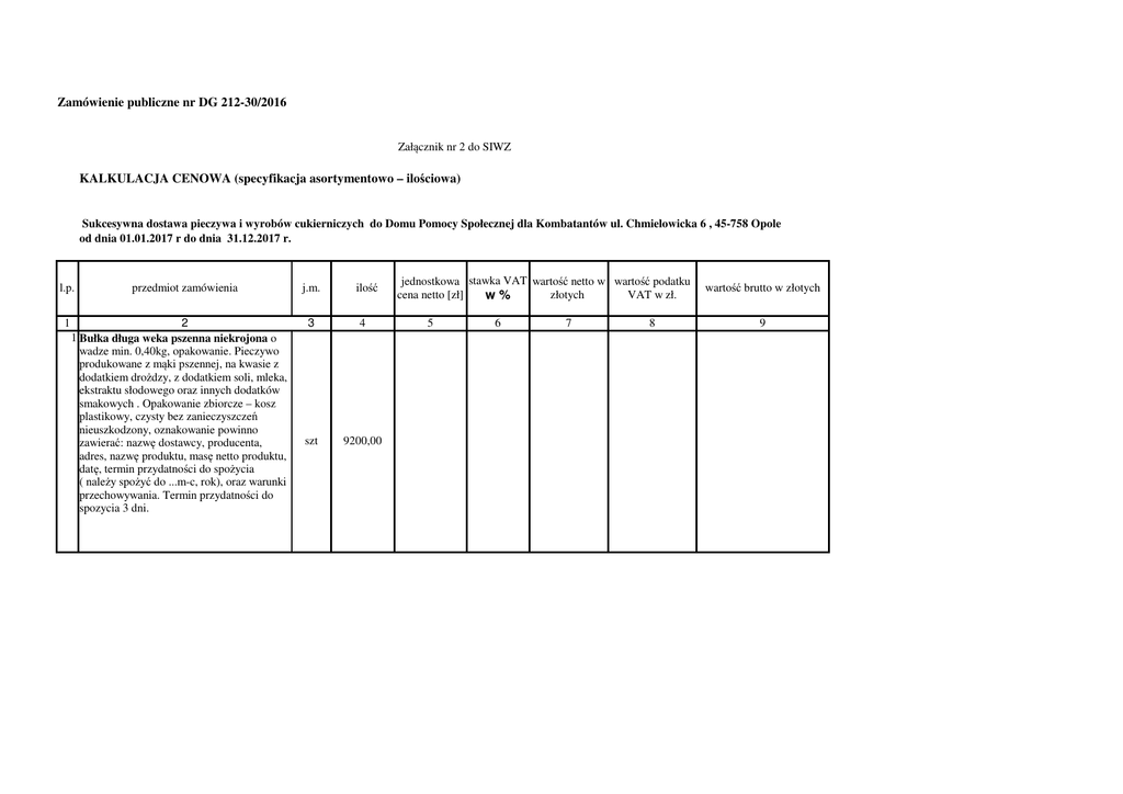 Zamówienie publiczne nr DG 212-30/2016 Załącznik nr 2 do SIWZ KALKULACJA CENOWA (specyfikacja asortymentowo – ilościowa) Sukcesywna dostawa pieczywa i wyrobów cukierniczych do Domu Pomocy Społecznej dla Kombatantów ul. Chmielowicka 6 , 45-758 Opole od dnia 01.01.2017 r do dnia 31.12.2017 r. l.p. 1 przedmiot zamówienia 2 1 Bułka długa weka pszenna niekrojona o wadze min. 0,40kg, opakowanie. Pieczywo produkowane z mąki pszennej, na kwasie z dodatkiem drożdzy, z dodatkiem soli, mleka, ekstraktu słodowego oraz innych dodatków smakowych . Opakowanie zbiorcze – kosz plastikowy, czysty bez zanieczyszczeń nieuszkodzony, oznakowanie powinno zawierać: nazwę dostawcy, producenta, adres, nazwę produktu, masę netto produktu, datę, termin przydatności do spożycia ( należy spożyć do ...m-c, rok), oraz warunki przechowywania. Termin przydatności do spozycia 3 dni. j.m. ilość 3 4 szt 9200,00 jednostkowa stawka VAT wartość netto w wartość podatku cena netto [zł] złotych VAT w zł. w% 5 6 7 8 wartość brutto w złotych 9 2 Bułka poznańska pszenna o wadze 0,10kg,pieczywo produkowane z mąki pszennej, na kwasie, z dodatkiem drożdży lub na drożdżach, z dodatkiem soli, mleka, ekstraktu słodowego oraz innych dodatków smakowych. Bułka okrągła, lekko chropowata w miejscu podziału, bez wgnieceń, bez uszkodzeń mechanicznych. Opakowanie zbiorcze – kosz plastikowy, czysty bez zanieczyszczeń nieuszkodzony, oznakowanie powinno zawierać: nazwę dostawcy, producenta, adres, nazwę produktu, masę netto produktu, datę, termin przydatności do spożycia ( należy spożyć do ...m-c, rok), oraz warunki przechowywania. Termin przydatności do spozycia 3 dni. 3 Chleb baltonowski pszenno- żytni zwykły0,70kg, Opakowanie zbiorcze – kosz plastikowy, czysty bez zanieczyszczeń nieuszkodzony, oznakowanie powinno zawierać: nazwę dostawcy, producenta, adres, nazwę produktu, masę netto produktu, datę, termin przydatności do spożycia ( należy spożyć do ...m-c, rok), oraz warunki przechowywania. Termin przydatności do spozycia 3 dni. 4 Chleb graham z mąki pszennej „Graham” foremka -0,40kg, Opakowanie zbiorcze – kosz plastikowy, czysty bez zanieczyszczeń nieuszkodzony, oznakowanie powinno zawierać: nazwę dostawcy, producenta, adres, nazwę produktu, masę netto produktu, datę, termin przydatności do spożycia ( należy spożyć do ...m-c, rok), oraz warunki przechowywania. Termin przydatności do spozycia 3 dni. szt 15500,00 szt 6600,00 szt 6900,00 5 Chleb razowy żytnio- pszenny z mąki z grubego przemiału-0,70kg . Opakowanie zbiorcze – kosz plastikowy, czysty bez zanieczyszczeń nieuszkodzony, oznakowanie powinno zawierać: nazwę dostawcy, producenta, adres, nazwę produktu, masę netto produktu, datę, termin przydatności do spożycia ( należy spożyć do ...m-c, rok), oraz warunki przechowywania. Termin przydatności do spozycia 3 dni. 6 Ciasto kołacz z serem na cieście drożdowym z kruszonką o wysokości minimum 3 cm.Opakowane- luz blacha 7 Ciasto jabłecznik na cieście kruchym pakowane o wysokości minimum 3 cm Opakowanie - luz blacha 8 Ciasto limonka z kruszonką na cieście piaskowym ze skórką pomarańczy wysokość minimum 3 cm / lub murzynek czekoladowy minimum 3 cm - pakowane luz blacha 9 Pączki lukrowane z marmoladą różaną lub owocową wyrób drożdżowy z głębokiego tłuszczu, o wadze minimum 90 g pakowany paletka tekturowa owinięta folią 10 Strucla makowa na bazie ciasta drożdzowego z masą makową o wysokości minimum 5 cm 11 Piernik przekładany marmoladą z polewą czekoladową o wysokości minimum 5 cm pakowany luz blacha 12 Babeczki wielkanocne drożdżowe z rodzynkami małe 80g -ciasto drożdzowe, w foremce o wysokości minimum 4 cm szt 5300,00 kg 114,00 kg 82,00 kg 114,00 szt 276,00 kg 20,00 kg 20 szt 138 13 Ciasto cytrynowe lukrowane piaskowe lub biszkoptowe o wysokości minimum 5 cm kg 82 kg 14 14 Drożdże piekarskie-0,50kg Zamawiający będzie dokonywał zakupów sukcesywnie wg potrzeb. Zamawiajacy zastrzega sobie prawo zamówienia w mniejszej ilości oraz możliwości rezygnacji z niektórych pozycji. Cena podana w formularzu ofertowym ( zał. nr 1) oraz w kalkulacji cenowej (zał. nr 2) jest ceną ostateczną, kompletną, zawierającą wszystkie koszty, które ponosi Zamawiajacy w całym okresie realizacji zamówienia i zostanie wprowadzona do umowy jako obowiązująca strony przez cały okres realizacji zamówienia. CENA OFERTY NETTO …..................................................................................zł (słownie złotych ….............................................................................................) WARTOŚĆ PODATKU VAT …................................................... ............zł (słownie złotych ….............................................................................................) WARTOŚĆ OFERTY BRUTTO.......................................................................zł (słownie złotych ….............................................................................................) …............................................ ( Miejscowość, data) DG 212-30/2016 …..................................................................................................................... Podpis oraz pieczęć osób wskazanych w dokumencie uprawniającym do występowania w obrocien prawnym