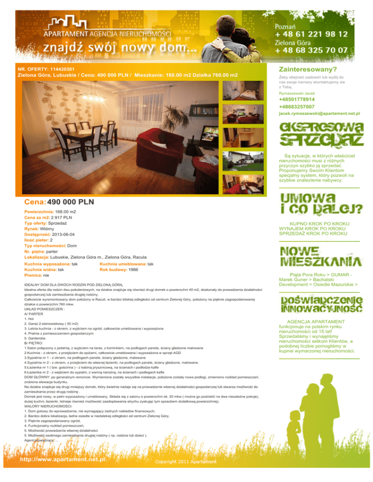Zainteresowany? NR. OFERTY: 114420301 Zielona Góra, Lubuskie / Cena: 490 000 PLN / Mieszkanie: 168.00 m2 Działka 760.00 m2 Żeby obejrzeć zadzwoń lub wyślij do nas swoje namiary skontaktujemy sie z Tobą. Rymaszewski Jacek +48501778914 +48683257007 [email protected] Są sytuacje, w których właściciel nieruchomości musi z różnych przyczyn szybko ją sprzedać. Proponujemy Swoim Klientom specjalny system, który pozwoli na szybkie znalezienie nabywcy. Cena: 490 000 PLN Powierzchnia: 168.00 m2 Cena za m2: 2 917 PLN Typ oferty: Sprzedaż Rynek: Wtórny Dostępność: 2013-06-04 Ilość pieter: 2 Typ nieruchomości: Dom Nr. piętra: parter Lokalizacja: Lubuskie, Zielona Góra m., Zielona Góra, Racula Kuchnia wyposażona: tak Kuchnia widna: tak Piwnica: nie KUPNO KROK PO KROKU WYNAJEM KROK PO KROKU SPRZEDAŻ KROK PO KROKU Kuchnia umeblowana: tak Rok budowy: 1986 IDEALNY DOM DLA DWÓCH RODZIN POD ZIELONĄ GÓRĄ. Idealna oferta dla rodzin dwu pokoleniowych, na działce znajduje się również drugi domek o powierzchni 40 m2, doskonały do prowadzenia działalności gospodarczej lub zamieszkania drugiej rodziny. Całkowicie wyremontowany dom położony w Raculi, w bardzo bliskiej odległości od centrum Zielonej Góry, położony na pięknie zagospodarowanej działce o powierzchni 760 mkw. UKŁAD POMIESZCZEŃ : A/ PARTER 1. Hol 2. Garaż 2-stanowiskowy ( 50 m2) 3. Letnia kuchnia - z oknem, z wyjściem na ogród, całkowicie umeblowana i wyposażona 4. Pralnia z pomieszczeniem gospodarczym 5. Garderoba B/ PIĘTRO: 1.Salon połączony z jadalnią, z wyjściem na taras, z kominkiem, na podłogach panele, ściany gładzone malowane 2.Kuchnia - z oknem, z przejściem do spiżarni, całkowicie umeblowana i wyposażona w sprzęt AGD 3.Sypialnia nr 1 - z oknem, na podłogach panele, ściany gładzone, malowane 4.Sypialnia nr 2 - z oknem, z przejściem do własnej łazienki, na podłogach panele, ściany gładzone, malowane. 5.Łazienka nr 1 ( tzw. gościnna ) - z kabiną prysznicową, na ścianach i podłodze kafle 6.Łazienka nr 2 - z wejściem do sypialni, z wanną narożną, na ścianach i podłogach kafle DOM GŁÓWNY: po generalnym remoncie. Wymienione zostały wszystkie instalacje, położone zostały nowe podłogi, zmieniono rozkład pomieszczeń, zrobiona elewacja budynku. Na działce znajduje się drugi mniejszy domek, który świetnie nadaje się na prowadzenie własnej działalności gospodarczej lub stwarza możliwość do zamieszkania przez drugą rodzinę . Domek jest nowy, w pełni wyposażony i umeblowany. Składa się z salonu o powierzchni ok. 20 mkw ( można go podzielić na dwa niezależne pokoje), dużej kuchni, łazienki. Istnieje również możliwość zaadoptowania strychu zyskując tym sposobem dodatkową powierzchnię). WALORY NIERUCHOMOŚCI: 1. Dom gotowy do wprowadzenia, nie wymagający żadnych nakładów finansowych, 2. Bardzo dobra lokalizacja, ładne osiedle w niedalekiej odległości od centrum Zielonej Góry, 3. Pięknie zagospodarowany ogród, 4. Funkcjonalny rozkład pomieszczeń, 5. Możliwość prowadzenia własnej działalności 5. Możliwość osobnego zamieszkania drugiej rodziny ( np. rodzice lub dzieci ). Agent prowadzący: ... http://www.apartament.net.pl Piąta Pora Roku > GUMAR Marek Guner > Bachalski Development > Osiedle Mazurskie > AGENCJA APARTAMENT funkcjonuje na polskim rynku nieruchomości od 15 lat! Sprzedaliśmy i wynajęliśmy nieruchomości setkom Klientów, a podobnej liczbie pomogliśmy w kupnie wymarzonej nieruchomości.