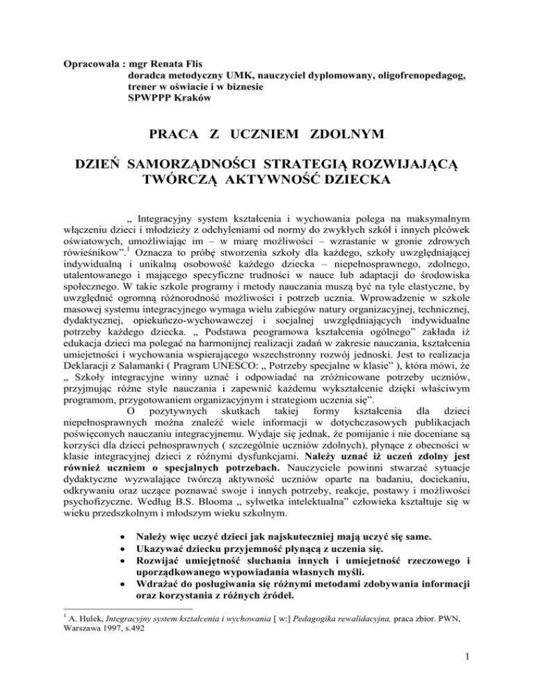 Opracowała : mgr Renata Flis doradca metodyczny UMK, nauczyciel dyplomowany, oligofrenopedagog, trener w oświacie i w biznesie SPWPPP Kraków PRACA Z UCZNIEM ZDOLNYM DZIEŃ SAMORZĄDNOŚCI STRATEGIĄ ROZWIJAJĄCĄ TWÓRCZĄ AKTYWNOŚĆ DZIECKA „ Integracyjny system kształcenia i wychowania polega na maksymalnym włączeniu dzieci i młodzieży z odchyleniami od normy do zwykłych szkół i innych plcówek oświatowych, umożliwiając im – w miarę możliwości – wzrastanie w gronie zdrowych rówieśnikow”.1 Oznacza to próbę stworzenia szkoły dla każdego, szkoły uwzględniającej indywidualną i unikalną osobowość każdego dziecka – niepełnosprawnego, zdolnego, utalentowanego i mającego specyficzne trudności w nauce lub adaptacji do środowiska społecznego. W takie szkole programy i metody nauczania muszą być na tyle elastyczne, by uwzględnić ogromną różnorodność możliwości i potrzeb ucznia. Wprowadzenie w szkole masowej systemu integracyjnego wymaga wielu zabiegów natury organizacyjnej, technicznej, dydaktycznej, opiekuńczo-wychowawczej i socjalnej uwzględniających indywidualne potrzeby każdego dziecka. „ Podstawa peogramowa kształcenia ogólnego” zakłada iż edukacja dzieci ma polegać na harmonijnej realizacji zadań w zakresie nauczania, kształcenia umiejetności i wychowania wspierającego wszechstronny rozwój jednoski. Jest to realizacja Deklaracji z Salamanki ( Pragram UNESCO: „ Potrzeby specjalne w klasie” ), która mówi, że „ Szkoły integracyjne winny uznać i odpowiadać na zróżnicowane potrzeby uczniów, przyjmując różne style nauczania i zapewnić każdemu wykształcenie dzięki właściwym programom, przygotowaniem organizacyjnym i strategiom uczenia się”. O pozytywnych skutkach takiej formy kształcenia dla dzieci niepełnosprawnych można znaleźć wiele informacji w dotychczasowych publikacjach poświęconych nauczaniu integracyjnemu. Wydaje się jednak, że pomijanie i nie doceniane są korzyści dla dzieci pełnosprawnych ( szczególnie uczniów zdolnych), płynące z obecności w klasie integracyjnej dzieci z różnymi dysfunkcjami. Należy uznać iż uczeń zdolny jest również uczniem o specjalnych potrzebach. Nauczyciele powinni stwarzać sytuacje dydaktyczne wyzwalające twórczą aktywność uczniów oparte na badaniu, dociekaniu, odkrywaniu oraz uczące poznawać swoje i innych potrzeby, reakcje, postawy i możliwości psychofizyczne. Według B.S. Blooma „ sylwetka intelektualna” człowieka kształtuje się w wieku przedszkolnym i młodszym wieku szkolnym. Należy więc uczyć dzieci jak najskuteczniej mają uczyć się same. Ukazywać dziecku przyjemność płynącą z uczenia się. Rozwijać umiejętność sluchania innych i umiejetność rzeczowego i uporządkowanego wypowiadania własnych myśli. Wdrażać do posługiwania się różnymi metodami zdobywania informacji oraz korzystania z różnych źródeł. 1 A. Hulek, Integracyjny system kształcenia i wychowania [ w:] Pedagogika rewalidacyjna, praca zbior. PWN, Warszawa 1997, s.492 1 Zachęcać do rozwijania różnych problemów. Od nauczycieli klas integracyjnych wymaga się więc, szczególnie w dziedzinie metodyki, ogromnej gotowości do ustawicznego dokształcania się i szukania ciągle nowych rozwiązań. W swojej pracy zawodowej stosuję szereg różnorodnych metod aktywizujących, modyfikując je lub wymyślam własne , coraz ciekawsze rozwiązania metodyczne, aby zindywidualizować pracę na lekcji i umożliwić zaangażowanie każdemu dziecku. Zapraszam dzieci do zabawy a nie do nauki. Stwarzam sytuacje wyzwalające śmiech, radość i zadowolenie. Uczenie dzieci poprzez zabawę to podstawowy element szkolnej rzeczywistości. Opracowując strategię pracy w klasie wychodzę z założenia iż każde dziecko jest twórcze, a ich aktywność kreatywna ma wszelkie cechy przypisywane działaniom twórczym. Dziecko w sposób naturalny jest twórcą 2 - to opinia R. Glotona i C. Clero oraz psychologów humanistycznych i pedagogów reprezentujących nurty współczesnej pedagogiki. Zajęcia rozwijające twórczą aktywność podtrzymają wzrastającą u dzieci zdolność rozumowania dedukcyjnego, właściwie zmotywują ich do nauki oraz przyczynią się do nawiązania pozytywnych relacji z rówieśnikami. Uczeń wybitnie zdolny osiągnie znaczący status w grupie, stanie się dla innych kreatywnym przewodnikiem, natomiast uczeń niepełnosprawny dzieki zadaniom twórczym wzbogaci i udoskonali mechanizmy obronne, wyrobi pożądane cechy osobowościowe, pobudzi kształtowanie i rozwijanie uzdolnień. Należy bowiem pamiętać o tym iż obowiązkiem nauczyciela jest nauczenie dziecka umiejetności rekompensujacych niepełnosprawność3. „ Scalanie wiedzy uczniów swą najdolrzalszą postać osiąga w projekcie dydaktycznym”4. Opracowana i wdrożona przeze mnie strategia pracy w klasie, którą nazwałam dzień samorządności w swej koncepcji zbliżona jest właśnie do projektu dydaktycznego. Z powodzeniem można wprowadzić tę strategię już od klasy II szkoły podstawowej. Muszą być jednak spełnione określone warunki : 1. Uczniowie są zainteresowani problematyką i chcą zaangażować się w jej opracowanie. 2. Uczniowie mają doświadczenie w pracy w małych, zróżnicowanych grupach. 3. Uczniowie w toku codziennej pracy poznali różne ćwiczenia twórcze i techniki dramy. 4. Rodzice uczniów akceptują spotykanie się uczniów poza lekcjami w celu opracowania zagadnień. W dniu samorządności uczniowie przejmują rolę nauczycieli. Tematyka zajęć uzależniona jest od indywidualnych zainteresowań prowadzących . Ekspertami stają się uczniowie zdolni, to oni proponują tematykę, której zakres treści wykracza poza program nauczania, ale bardzo interesuje wszystkich uczniów. Takimi hitami były : siedem cudów świata, kosmos, życie człowieka jaskiniowego, rycerstwo polskie i inne. Uczniowie tworzą grupę ekspert