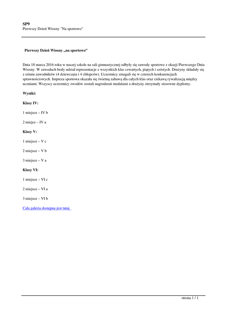 SP9 Pierwszy Dzień Wiosny "Na sportowo" Pierwszy Dzień Wiosny „na sportowo” Dnia 18 marca 2016 roku w naszej szkole na sali gimnastycznej odbyły się zawody sportowe z okazji Pierwszego Dnia Wiosny. W zawodach brały udział reprezentacje z wszystkich klas czwartych, piątych i szóstych. Drużyny składały się z ośmiu zawodników (4 dziewczęta i 4 chłopców). Uczestnicy zmagali się w czterech konkurencjach sprawnościowych. Impreza sportowa okazała się świetną zabawą dla całych klas oraz ciekawą rywalizacją między uczniami. Wszyscy uczestnicy zwodów zostali nagrodzeni medalami a drużyny otrzymały stosowne dyplomy. Wyniki: Klasy IV: 1 miejsce – IV b 2 miejce – IV a Klasy V: 1 miejsce – V c 2 miejsce – V b 3 miejsce – V a Klasy VI: 1 miejsce – VI c 2 miejsce – VI a 3 miejsce – VI b Cała galeria dostępna jest tutaj strona 1 / 1