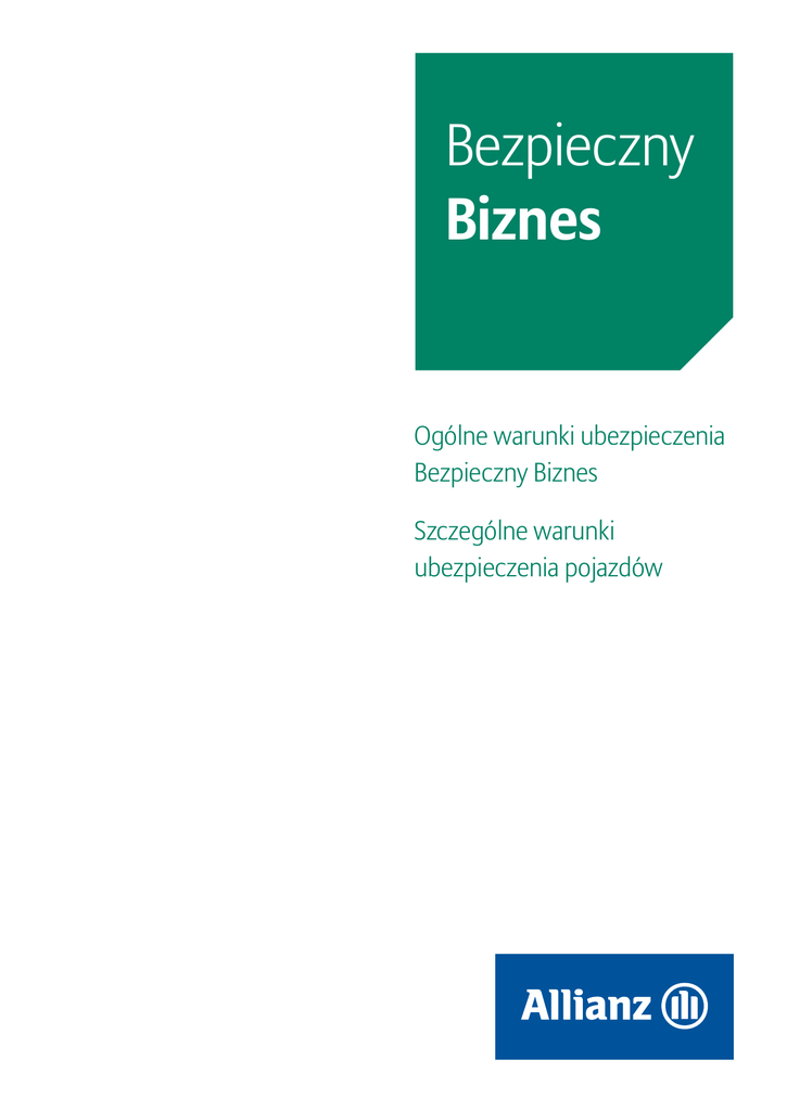 Bezpieczny Biznes Ogólne warunki ubezpieczenia Bezpieczny Biznes Szczególne warunki ubezpieczenia pojazdów Spis treści Ogólne warunki ubezpieczenia Bezpieczny Biznes DZIAŁ I POSTANOWIENIA WSPÓLNE DLA WSZYSTKICH RODZAJÓW UBEZPIECZEŃ . . . . . . . . . . . . . . . . . . . . . . . . . . . . . . . . . . . . . . . . . . . . . . . . . 3 DZIAŁ II M ODUŁ U BEZPIECZENIA MIENIA OD POŻARU I INNYCH ZDARZEŃ LOSOWYCH . . . . . . . . . . . . . . . . . . . . . . . . . . . . . . . . . . . . . . . . . . . . 11 DZIAŁ III MODUŁ U BEZPIECZENIA MIENIA OD KRADZIEŻY Z WŁAMANIEM I RABUNKU . . . . . . . . . . . . . . . . . . . . . . . . . . . . . . . . . . . . . . . . . . . . 15 DZIAŁ IV MODUŁ U BEZPIECZENIE SZYB I INNYCH PRZEDMIOTÓW OD STŁUCZENIA . . . . . . . . . . . . . . . . . . . . . . . . . . . . . . . . . . . . . . . . . . . . . . . 19 DZIAŁ V MODUŁ UBEZPIECZENIE MIENIA W TRANSPORCIE (CARGO) . . . . . . . . . . . . . . . . . . . . . . . . . . . . . . . . . . . . . . . . . . . . . . . . . . . . . . . . . . . . . 19 DZIAŁ VI MODUŁ UBEZPIECZENIE SPRZĘTU ELEKTRONICZNEGO . . . . . . . . . . . . . . . . . . . . . . . . . . . . . . . . . . . . . . . . . . . . . . . . . . . . . . . . . . . . . . . . 21 DZIAŁ VII MODUŁ UBEZPIECZENIA BIZNES ASSISTANCE . . . . . . . . . . . . . . . . . . . . . . . . . . . . . . . . . . . . . . . . . . . . . . . . . . . . . . . . . . . . . . . . . . . . . . . . 23 DZIAŁ VIII MODUŁ UBEZPIECZENIA ASYSTY PRAWNEJ . . . . . . . . . . . . . . . . . . . . . . . . . . . . . . . . . . . . . . . . . . . . . . . . . . . . . . . . . . . . . . . . . . . . . . . . . 25 DZIAŁ IX POSTANOWIENIA KOŃCOWE . . . . . . . . . . . . . . . . . . . . . . . . . . . . . . . . . . . . . . . . . . . . . . . . . . . . . . . . . . . . . . . . . . . . . . . . . . . . . . . . . . . . . . . . 27 ZAŁĄCZNIK NR I KLAUZULE DODATKOWE . . . . . . . . . . . . . . . . . . . . . . . . . . . . . . . . . . . . . . . . . . . . . . . . . . . . . . . . . . . . . . . . . . . . . . . . . . . . . . . . . . . . 28 DZIAŁ I. Klauzule dodatkowe rozszerzające zakres ochrony ubezpieczeniowej bez opłaty dodatkowej składki . . . . . . . . . . . . . . . . . . . . . . . 28 DZIAŁ II. Klauzule dodatkowe rozszerzające zakres ochrony ubezpieczeniowej na wniosek Ubezpieczającego i za opłatą dodatkowej składki . . . . . . . . . . . . . . . . . . . . . . . . . . . . . . . . . . . . . . . . . . . . . . . . . . . . . . . . . . . . . . . . . . . . . . . . . . . . . . . . . . . . . . . . . . . . . . . . . 29 ZAŁĄCZNIK NR II ŚRODKI BEZPIECZEŃSTWA . . . . . . . . . . . . . . . . . . . . . . . . . . . . . . . . . . . . . . . . . . . . . . . . . . . . . . . . . . . . . . . . . . . . . . . . . . . . . . . . . . 36 Szczególne warunki ubezpieczenia pojazdów . . . . . . . . . . . . . . . . . . . . . . . . . . . . . . . . . . . . . . . . . . . . . . . . . . . . . . . . . . . . . . . . . . . . . . . . . . . . . . 39 Ogólne warunki ubezpieczenia Bezpieczny Biznes RODZAJ INFORMACJI NUMER ZAPISU Z WZORCA UMOWNEGO 1.Przesłanki wypłaty odszkodowania i innych świadczeń § 2; § 13 ust. 1-3; § 14; § 17 ust. 2; § 18 ust. 3; § 19 ust. 3; § 20; § 21; § 22; § 23; § 24; § 28 ust. 3; § 34; § 35; § 37; § 38; § 39; § 40; § 41; § 44; § 46; § 50; § 51; § 52; § 53; § 58; § 59; § 60; § 66; § 67; § 68; § 73; § 74; § 75; § 76; § 77; § 79; § 80; § 81; § 82; § 83; § 84; § 85; § 87; § 90; § 92; Załącznik nr I do OWU Bezpieczny Biznes Klauzule nr 1 – 28 Załącznik nr II do OWU – Środki bezpieczeństwa, § 2; § 3; § 5 ust. 7; § 8 ust. 3; § 12 ust. 8; § 13 ust. 1-3; § 14; § 17 ust. 2; § 18 ust. 3; § 19 ust. 3; § 20 ust. 2, 4, 5, 6 i 7; § 21 ust. 2; § 22 ust. 7; § 23 ust. 4; § 24; § 25 ust. 3; § 28 ust. 3; § 30 ust. 1 pkt 1) lit. i) i ust. 2; § 31; § 32 ust. 7; § 33; § 34; § 35; § 37; § 38; § 39; § 41; § 42 ust. 3; § 43; § 44 ust. 6 i 8; § 45; § 46; § 49; § 51 ust. 3; § 52 ust. 3; § 53 ust. 2-4; § 55; § 57; § 58; § 59 ust. 2; § 60; § 62 ust. 1; § 63 ust. 4; § 65; § 66; § 68 ust. 2-4; § 70 ust. 1-4; § 71 ust. 7; § 72; § 73; § 75; § 76 ust. 3-4; § 77 ust. 2-3; § 78 ust. 7; § 79; § 80 ust. 2; § 81 ust. 2-4; § 82 ust. 1; § 83; § 84; § 85; § 86; § 88 ust. 3; § 89 ust. 3, 4, 6 i 7; § 90; § 91; § 92 ust. 3; Załącznik nr I do OWU Bezpieczny Biznes Klauzule nr 1 – 28: Klauzula nr 1 ust. 3-5; Klauzula nr 2 ust. 3, 5, 6, 8 i 9; Klauzula nr 3 ust. 3-4; Klauzula nr 4 ust. 2-6; Klauzula nr 5 ust. 2-4; Klauzula nr 6 ust. 2-3; Klauzula nr 7 ust. 3-5; Klauzula nr 8 ust.2; Klauzula nr 9; Klauzula nr 10 ust. 1 pkt 1)-4); ust. 2-4; Klauzula nr 11 ust. 6-9; Klauzula nr 12 ust. 4-6; Klauzula nr 13 ust. 3-6; Klauzula nr 14 ust. 3, 5-10; Klauzula nr 15 ust. 3; 5-7; Klauzula nr 16 ust. 2-4; Klauzula nr 17 ust. 4-7; Klauzula nr 18 ust. 2-5; Klauzula nr 19 ust. 3-8; Klauzula nr 20 ust. 3-5; Klauzula nr 21; Klauzula nr 22 ust. 3-5; Klauzula nr 23 ust. 2-4; Klauzula nr 24 ust. 2-5; Klauzula nr 25 ust. 3-4; Klauzula nr 26A; Klauzula nr 26B; Klauzula nr 27; Klauzula nr 28 ust. 3-4; Załącznik nr II – Środki bezpieczeństwa BIBB-O03 02/17 2.Ograniczenia oraz wyłączenia odpowiedzialności zakładu ubezpieczeń uprawniające do odmowy wypłaty odszkodowania i innych świadczeń lub ich obniżenia –1– DZIAŁ I POSTANOWIENIA WSPÓLNE DLA WSZYSTKICH RODZAJÓW UBEZPIECZEŃ POSTANOWIENIA WSTĘPNE § 1 1. Ogólne warunki ubezpieczenia Bezpieczny Biznes, zwane dalej „OWU”, stosuje się do Umów ubezpieczenia zawieranych przez Towarzystwo Ubezpieczeń i Reasekuracji Allianz Polska Spółka Akcyjna, zwane dalej „ALLIANZ” z osobami fizycznymi, w tym także osobami fizycznymi prowadzącymi działalność gospodarczą, osobami prawnymi lub innymi jednostkami organizacyjnymi nie będącymi osobami prawnymi, mającymi zdolność do czynności prawnych. 2. Postanowienia niniejszych OWU dotyczące Ubezpieczającego stosuje się odpowiednio do Ubezpiecz