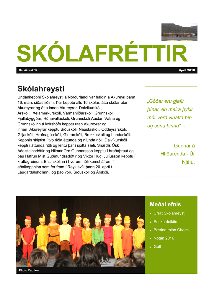 SKÓLAFRÉTTIR Apríl 2016 Dalvíkurskóli Skólahreysti Undankeppni Skólahreysti á Norðurlandi var haldin á Akureyri þann 16. mars síðastliðinn. Þar kepptu alls 16 skólar, átta skólar utan Akureyrar og átta innan Akureyrar. Dalvíkurskóli, Árskóli, Þelamerkurskóli, Varmahlíðarskóli, Grunnskóli Fjallabyggðar, Húnavallaskóli, Grunnskóli Austan Vatna og Grunnskólinn á Þórshöfn kepptu utan Akureyrar og innan Akureyrar kepptu Síðuskóli, Naustaskóli, Oddeyrarskóli, Giljaskóli, Hrafnagilsskóli, Glerárskóli, Brekkuskóli og Lundaskóli. Keppnin skiptist í tvo riðla áttunda og níunda riðil. Dalvíkurskóli keppti í áttunda riðli og lentu þar í sjötta sæti. Snædís Ósk Aðalsteinsdóttir og Hilmar Örn Gunnarsson kepptu í hraðaþraut og þau Hafrún Mist Guðmundssdóttir og Viktor Hugi Júlíusson kepptu í kraftagreinum. Efsti skólinn í hvorum riðli komst áfram í aðalkeppnina sem fer fram í Reykjavík þann 20. apríl í Laugardalshöllinni, og það voru Síðuskóli og Árskóli. „Góðar eru gjafir þínar, en meira þykir mér verð vinátta þín og sona þinna“. - - Gunnar á Hlíðarenda - Úr Njálu. Meðal efnis Photo Caption Úrslit Skólahreysti Enska deildin Bærinn minn Chelm Nótan 2016 Golf Golfferð til Spánar Úr Skilaboðaskjóðunni Chełm-Miasto z ciekawą historią Chełm, położony na pograniczu wschodniej i zachodniej Słowiańszczyzny, w przeszłości był miejscem współistnienia wielu narodowości, wyznań i kultur. Od średniowiecza na ziemi chełmskiej mieszkali prawosławni, katolicy i Żydzi. W wiekach późniejszych wyznaniowo-kulturową mozaikę uzupełnili protestanci i grekokatolicy. W mieście rozbrzmiewały języki: polski, ruski i hebrajski. W świątyniach, szkołach i na wąskich uliczkach dawnego Chełma żyła zgodnie różnojęzyczna społeczność. Pozostałościami barwnej historii i kultury są budowle, obyczaje i niepowtarzalny klimat miasta zachęcający do odwiedzenia i poddania się choćby na chwilę jego urokowi. To miejsce spokoju i szacunku dla turystów. Ci, którzy tutaj przyjadą, na pewno zabiorą ze sobą najpiękniejsze wspomnienia. Jeśli chodzi o dzieje miasta Chełm to jest to gród o ponad 1000-letniej historii, położony na jednym z wyniosłych wzgórz Pagórów Chełmskich. Według danych archeologicznych, to jeden z najstarszych ośrodków regionu zaliczany do Grodów Czerwieńskich. W XIII wieku miasto było stolicą państwa halicko-włodzimierskiego i pełniło funkcję głównej siedziby króla Rusi, Daniela Romanowicza, który zachwycił się urokiem tego miejsca i docenił jego naturalne walory obronne. Po długoletnich walkach między Litwą, Węgrami a Polską, w 1387 roku Chełm i ziemia chełmska zostały włączone przez królową Jadwigę do państwa polskiego. W 1392 roku Chełm otrzymał prawa miejskie z rąk Władysława Jagiełły. Należał wówczas do ważnych ośrodków Polski Jagiellonów. Od XIII wieku rezydował tu biskup prawosławny, a od XV wieku – łaciński, co znacznie podnosiło rangę miasta. Po unii brzeskiej (1596 rok) diecezję prawosławną przekształcono w unicką. Została ona zlikwidowana przez władze carskie w 1875 roku. Liczne wojny, jakie przetaczały się przez kraj w XVII stuleciu, nie oszczędziły Chełma. Oddziały kozackie, szwedzkie i moskiewskie dokonały zniszczeń, które pogrążyły miasto w kryzysie. Po III rozbiorze Polski Chełm znalazł się pod władzą Austrii, a następnie Rosji. Frétt skrifuð af Filip Krakkarnir í golfklúbbnum Hamri fóru til Spánar þann 28. mars og spiluðu golf á hverjum degi fram að 6. apríl. Þau tóku þátt í nokkrum mótum en það var m.a. Texas Scramble mót og tvær punktakeppnir. Völlurinn sem þau voru á heitir Novo Sancti Petri og er gríðarlega vandaður og flottur völlur Atlantshafsmeginn. Hópurinn gisti á hóteli sem heitir Iberostar og er hálfan kílómetra frá vellinum. Það er óhætt að segja að krakkarnir hafi verið að gera góða hluti því að allir unnu til einhvers konar verðlauna í mótunum sem voru haldin. Frétt skrifuð af Amöndu Nýjung í Dalvíkurskóla Dalvíkurskóli býður upp á ávaxtaáskrift og hafragraut á morgnana. Hafragrauturinn er ókeypis en borga þarf 2000 kr. á mánuði. Krakkar frá 1.-6. bekk fá morgunmat frá kl.7:40-8:00 krakkar i 7. -10. bekk fá morgunmat frá kl. 9:009:15. Auk þess er hægt að vera í ávaxtaáskrift og fá einn ávöxt á morgnana. Eftir: Anton, Filip og Ragnar Enska deildin Enska úrvalsdeildin hefur verið mjög skemmtileg í ár. Leicester City trónir á toppinum með fimm stiga forystu á Tottenham sem er í öðru sæti. Þessi tvö lið hafa verið að berjast um titilinn á þessu ári. Leicester City endaði í 17. sæti á síðusu leiktíð en núna lítur allt út fyrir að þeir munu vinna deildina í ár. Arsenal og Manchester City eru í þriðja og fjórða sæti, fyrrnefnda liðið er í þriðja sæti en þessi lið eru að berjast um titilinn. Síðustu leikir hafa ekki farið vel fyrir Arsenal. Jamie Vardy leikmaður Leicester hefur verið einn besti leikmaður tímabilsins. Árið 2012 var hann í utandeildarliðinu Fleetwood Town áður en Leicester keypti hann. Þar hefur aldeilis slegið í gegn hann hefur skorað 19 mörk á tímabilinu og hann var kallaður upp í enska landsliðshópinn og skoraði þar í fyrsta leik sínum fyrir þá. Nótan Undankeppni Nótunnar á Dalvík var haldin þriðjudaginn 23. febrúar í menningarhúsinu Bergi á Dalvík. Áfram komust í Hof Hjörleifur Sveinbjarnarson á harmoniku, Styrmir Þeyr á píanó og Gleðisveit Jóhanns Svarfdælings. Dómarar voru Elfa Dröfn, Einar Arngrímsson og Tónlistakennari úr Fjallabyggð. Svæðistónleikar Nótunnar voru haldnir á fjórum stöðum um allt land. Styrmir Þeyr komst áfram úr Hofi og keppir þá í Eldborgarsal Hörpunnar 10. apríl. Skólafréttir eru skrifaðar