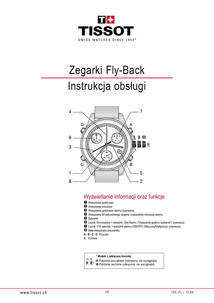 Gratulujemy Państwu wyboru zegarka ze stoperem marki TISSOT ®, jednej z najbardziej prestiżowych marek szwajcarskich na świecie. Staranne wykonanie