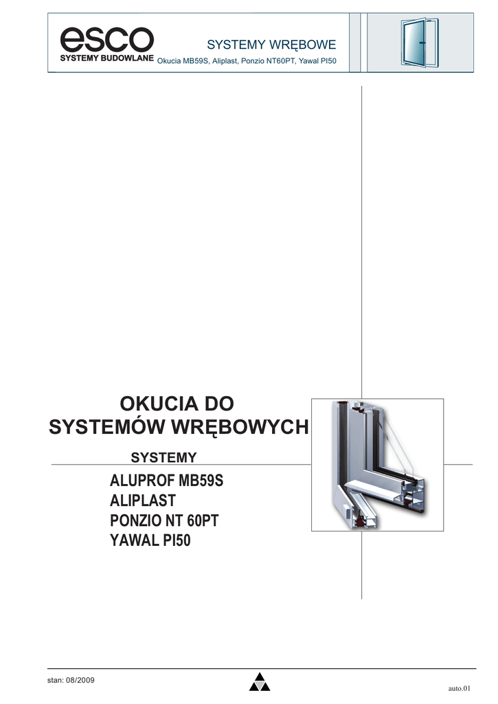 SYSTEMY WRĘBOWE Okucia MB59S, Aliplast, Ponzio NT60PT, Yawal PI50 OKUCIA DO SYSTEMÓW WRĘBOWYCH SYSTEMY ALUPROF MB59S ALIPLAST PONZIO NT 60PT YAWAL PI50 stan: 08/2009 auto.01 SYSTEMY WRĘBOWE MB 59S - Zawiasy ZAWIAS DRZWIOWY WRĘBOWY MECHANICA Zastosowanie: - zawias drzwiowy stosowany do drzwi z profili aluminiowych zlicowanych z rowkiem wrębowym - uniwersalny do drzwi prawych i lewych - niezależna regulacja w 3 płaszczyznach: w poziomie +/- 1,6 mm w pionie -1/+3mm w płaszczyźnie docisku uszczelki +/- 0,5 mm - maksymalne obciążenie do: 2 zawiasy 80 kg 3 zawiasy 100 kg ( w zależności od wykonania profili ) - z płytkami mocującymi i śrubami montażowymi nr esco j.m. DIN kolor informacje dodatkowe 10-788767 szt. L+R Al.-EV1 2-częściowy 10-791121 szt. L+R surowy 2-częściowy 10-791130 szt. L+R brązowy 2-częściowy 10-791148 szt. L+R biały 2-częściowy 10.02 stan: 08/2009 www.esco.com.pl e-mail: [email protected] SYSTEMY WRĘBOWE MB 59S - Zawiasy ZAWIAS DRZWIOWY 60 AT 2-skrzydełkowy Zastosowanie: - zawias drzwiowy stosowany do drzwi z profili aluminiowych zlicowanych - niezależna regulacja w 3 płaszczyznach: w poziomie +/- 2 mm w pionie +3mm /-2 mm w płaszczyźnie docisku uszczelki +/- 0,5 mm - maksymalne obciążenie do 140 kg ( w zależności od wykonania profili ) - z mocowaniem na kołki rozporowe L = 42 mm materiał: stal ocynkowana na żółto nr esco j.m. DIN kolor A B C D 10-691615 szt. L+R surowy 20,5mm 42mm 62,5mm 20mm 10-691623 szt. L+R Al.-EV1 20,5mm 42mm 62,5mm 20mm 10-691631 szt. L+R Al.-c.brąz 20,5mm 42mm 62,5mm 20mm 10-691640 szt. L+R RAL 9016 20,5mm 42mm 62,5mm 20mm 10-691658 szt. L+R surowy 42mm 42mm 84mm 20mm 10-691666 szt. L+R AL.-EV1 42mm 42mm 84mm 20mm 10-691674 szt. L+R Al.-c.brąz 42mm 42mm 84mm 20mm 10-691682 szt. L+R RAL 9016 42mm 42mm 84mm 20mm Uwaga: Do zawias dostępne szablony wiertarskie 91-204013 dla rozstawu C=62,5mm 91-204366 dla rozstawu C=84mm ZAWIAS DRZWIOWY 60 AT 3-skrzydełkowy Zastosowanie: - niezależna regulacja w 3 płaszczyznach: w poziomie +/- 2 mm w pionie +3mm /-2 mm w płaszczyźnie docisku uszczelki +/- 0,5 mm - maksymalne obciążenie do 220 kg ( w zależności od wykonania profili ) - z mocowaniem na kołki rozporowe L = 42 mm materiał: stal ocynkowana na żółto nr esco j.m. DIN kolor A B C D 10-691690 szt. L+R surowy 20,5mm 42mm 62,5mm 20mm 10-691704 szt. L+R Al.-EV1 20,5mm 42mm 62,5mm 20mm 10-691712 szt. L+R Al.-c.brąz 20,5mm 42mm 62,5mm 20mm 10-691720 szt. L+R RAL 9016 20,5mm 42mm 62,5mm 20mm 10-691739 szt. L+R surowy 42mm 42mm 84mm 20mm 10-691747 szt. L+R Al.-EV1 42mm 42mm 84mm 20mm 10-691755 szt. L+R Al.-c.brąz 42mm 42mm 84mm 20mm 10-691763 szt. L+R RAL 9016 42mm 42mm 84mm 20mm Uwaga: Do zawias dostępne szablony wiertarskie 91-254720 dla rozstawu C=62,5mm 91-254711 dla rozstawu C=84mm stan: 08/2009 10.03 SYSTEMY WRĘBOWE MB 59S - Zamki ZAMEK ZAPADKOWO-RYGLOWY Z WYSUWANYM RYGLEM Zastosowanie: - zamek drzwiowy stosowany do drzwi z profili aluminiowych i stalowych - uniwersalny do drzwi prawych i lewych - blacha czołowa zamka płaska - rygiel wysuwany - jednostopniowy obrót rygla - funkcja Wechsel (cofnięcie zapadki przy pomocy klucza) nr esco j.m. DIN A D 21-790001 szt. L+R 32mm 35mm S 23mm ZAMEK ROLKOWO-RYGLOWY Z WYSUWANYM RYGLEM Zastosowanie: - zamek drzwiowy stosowany do drzwi z profili aluminiowych i stalowych - uniwersalny do drzwi prawych i lewych - blacha czołowa zamka płaska - rygiel wysuwany - jednostopniowy obrót rygla nr esco j.m. DIN A D 21-841765 szt. L+R 32mm 35mm S 24mm ZAMEK RYGLOWY Z WYSUWANYM RYGLEM Zastosowanie: - zamek drzwiowy stosowany do drzwi z profili aluminiowych i stalowych - uniwersalny do drzwi prawych i lewych - blacha czołowa zamka płaska - rygiel wysuwany - jednostopniowy obrót rygla nr esco j.m. DIN A D 21-790028 szt. L+R 32mm 35mm 10.04 stan: 08/2009 S 23mm www.esco.com.pl e-mail: [email protected] SYSTEMY WRĘBOWE MB 59S - Blachy zaczepowe BLACHA ZACZEPOWA UNIWERSALNA TYP U Zastosowanie: - do zamków z zapadką max 11mm z ryglem wysuwanym i opuszczanym - do drzwi z profili aluminiowych i stalowych - typ U7x24x2mm nr esco j.m. DIN 21-790516 szt. L+R BLACHA ZACZEPOWA UNIWERSALNA TYP U Zastosowanie: - do zamków ryglowych wysuwanych i opuszczanych - do drzwi z profili aluminiowych i stalowych - typ U7x24x2mm nr esco j.m. DIN 21-790540 szt. L+R stan: 08/2009 10.05 SYSTEMY WRĘBOWE MB 59S - Blachy zaczepowe BLACHA ZACZEPOWA DO ELEKTROZACZEPU TYP U Zastosowanie: - do stosowania z elektrozaczepami o max szerokości 16mm - do drzwi z profili aluminiowych i stalowych - typ U7x24x2mm nr esco j.m. DIN 21-841820 szt. L 21-841838 szt. R PODKŁADKA UNIWERSALNA POD ZAMKI I BLACHY Zastosowanie: - podkładka umożliwia zmniejszenie odległości między zamkiem, a blachą zaczepową - do drzwi prawych lub lewych - materiał: tworzywo sztuczne - kolor czarny - do systemów wrębowych nr esco j.m. DIN 21-841811 szt. L+R 10.06 stan: 08/2009 www.esco.com.pl e-mail: [email protected] SYSTEMY WRĘBOWE Aliplast - Zawiasy ZAWIAS DRZWIOWY WRĘBOWY F-XLR Zastosowanie: - zawias drzwiowy stosowany do drzwi z profili aluminiowych zlicowanych z rowkiem wrębowym - uniwersalny do drzwi prawych i lewych - niezależna regulacja w 3 płaszczyznach: w poziomie +/- 2 mm w pionie -2/+4mm w płaszczyźnie docisku uszczelki +/- 1 mm - maksymalne obciążenie do 120kg w zależności od wymiarów - z płytkami mocującymi i śrubami montażowymi nr esco j.m. DIN kolor informacje dodatkowe 10-840556 szt. L+R RAL 9005 2-częściowy 10-840572 szt. L+R RAL 9016 2-częściowy 10-841676 szt. L+R Al.-EV1 2-częściowy Uwaga: Zawiasy stosować do profili spełniających warunki podane na rysunku. stan: 08/2009 10.07 SYSTEMY WRĘBOWE Aliplast - Zamki ZAMEK ZAPADKOWO-RYGLOWY Z WYSUWANYM RYGLEM Zastosowanie: - zamek drzwiowy stosowany do drzwi z profili aluminiowych i stalowych - uniwersalny do drzwi prawych i lewych - blacha czołowa zamka płaska - rygiel wysuwany - jednostopniowy obrót rygla - funkcja Wechsel (cof