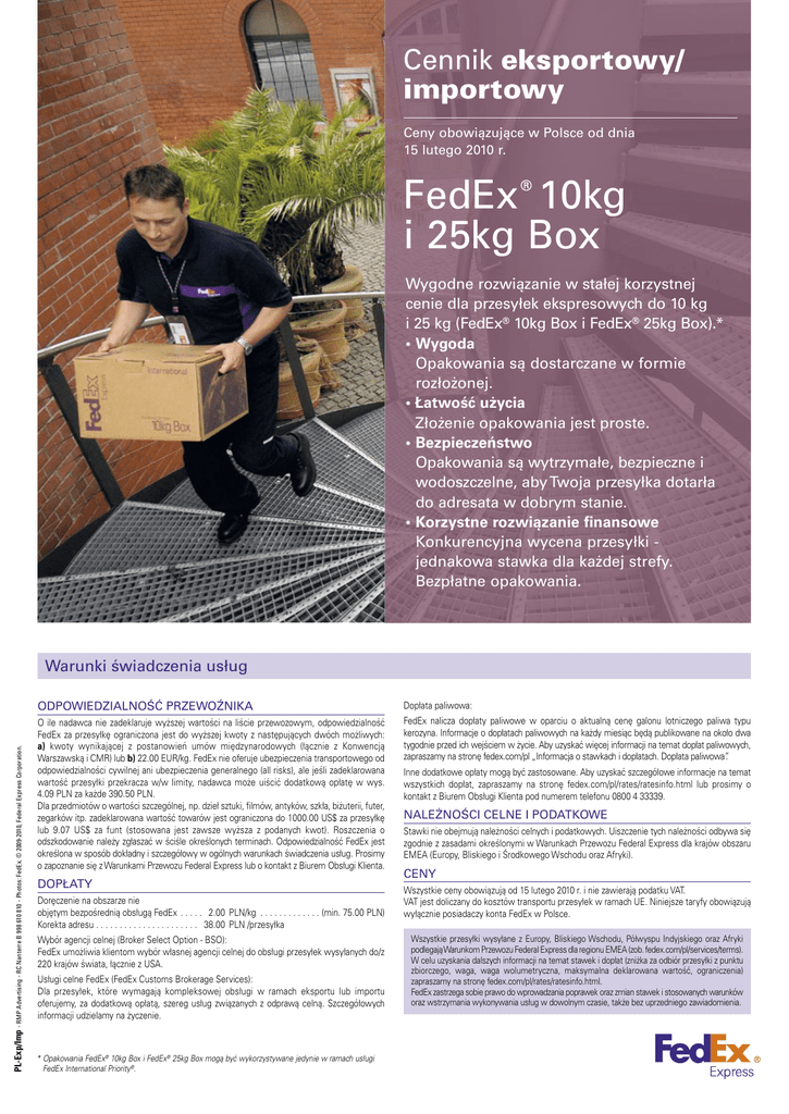 Cennik eksportowy/ importowy Ceny obowiązujące w Polsce od dnia 15 lutego 2010 r. FedEx 10kg i 25kg Box ® Wygodne rozwiązanie w stałej korzystnej cenie dla przesyłek ekspresowych do 10 kg i 25 kg (FedEx® 10kg Box i FedEx® 25kg Box).* • Wygoda Opakowania są dostarczane w formie rozłożonej. • Łatwość użycia Złożenie opakowania jest proste. • Bezpieczeństwo Opakowania są wytrzymałe, bezpieczne i wodoszczelne, aby Twoja przesyłka dotarła do adresata w dobrym stanie. • Korzystne rozwiązanie finansowe Konkurencyjna wycena przesyłki jednakowa stawka dla każdej strefy. Bezpłatne opakowania. PL-Exp/Imp -RMPAdvertising-RCNanterreB998610810-Photos:FedEx.©2009-2010,FederalExpressCorporation. Warunki świadczenia usług ODPOWIEDZIALNOŚĆ PRZEWOŹNIKA Dopłata paliwowa: O ile nadawca nie zadeklaruje wyższej wartości na liście przewozowym, odpowiedzialność FedEx za przesyłkę ograniczona jest do wyższej kwoty z następujących dwóch możliwych: a) kwoty wynikającej z postanowień umów międzynarodowych (łącznie z Konwencją Warszawską i CMR) lub b) 22.00 EUR/kg. FedEx nie oferuje ubezpieczenia transportowego od odpowiedzialności cywilnej ani ubezpieczenia generalnego (all risks), ale jeśli zadeklarowana wartość przesyłki przekracza w/w limity, nadawca może uiścić dodatkową opłatę w wys. 4.09 PLN za każde 390.50 PLN. Dla przedmiotów o wartości szczególnej, np. dzieł sztuki, filmów, antyków, szkła, biżuterii, futer, zegarków itp. zadeklarowana wartość towarów jest ograniczona do 1000.00 US$ za przesyłkę lub 9.07 US$ za funt (stosowana jest zawsze wyższa z podanych kwot). Roszczenia o odszkodowanie należy zgłaszać w ściśle określonych terminach. Odpowiedzialność FedEx jest określona w sposób dokładny i szczegółowy w ogólnych warunkach świadczenia usług. Prosimy o zapoznanie się z Warunkami Przewozu Federal Express lub o kontakt z Biurem Obsługi Klienta. FedEx nalicza dopłaty paliwowe w oparciu o aktualną cenę galonu lotniczego paliwa typu kerozyna. Informacje o dopłatach paliwowych na każdy miesiąc będą publikowane na około dwa tygodnie przed ich wejściem w życie. Aby uzyskać więcej informacji na temat dopłat paliwowych, zapraszamy na stronę fedex.com/pl „Informacja o stawkach i dopłatach. Dopłata paliwowa”. DOPŁATY Doręczenie na obszarze nie objętym bezpośrednią obsługą FedEx . . . . . 2.00 PLN/kg . . . . . . . . . . . . . (min. 75.00 PLN) Korekta adresu . . . . . . . . . . . . . . . . . . . . . . 38.00 PLN /przesyłka Wybór agencji celnej (Broker Select Option - BSO): FedEx umożliwia klientom wybór własnej agencji celnej do obsługi przesyłek wysyłanych do/z 220 krajów świata, łącznie z USA. Usługi celne FedEx (FedEx Customs Brokerage Services): Dla przesyłek, które wymagają kompleksowej obsługi w ramach eksportu lub importu oferujemy, za dodatkową opłatą, szereg usług związanych z odprawą celną. Szczegółowych informacji udzielamy na życzenie. * Opakowania FedEx® 10kg Box i FedEx® 25kg Box mogą być wykorzystywane jedynie w ramach usługi FedEx International Priority®. Inne dodatkowe opłaty mogą być zastosowane. Aby uzyskać szczegółowe informacje na temat wszystkich dopłat, zapraszamy na stronę fedex.com/pl/rates/ratesinfo.html lub prosimy o kontakt z Biurem Obsługi Klienta pod numerem telefonu 0800 4 33339. NALEŻNOŚCI CELNE I PODATKOWE Stawki nie obejmują należności celnych i podatkowych. Uiszczenie tych należności odbywa się zgodnie z zasadami określonymi w Warunkach Przewozu Federal Express dla krajów obszaru EMEA (Europy, Bliskiego i Środkowego Wschodu oraz Afryki). CENY Wszystkie ceny obowiązują od 15 lutego 2010 r. i nie zawierają podatku VAT. VAT jest doliczany do kosztów transportu przesyłek w ramach UE. Niniejsze taryfy obowiązują wyłącznie posiadaczy konta FedEx w Polsce. Wszystkie przesyłki wysyłane z Europy, Bliskiego Wschodu, Półwyspu Indyjskiego oraz Afryki podlegają Warunkom Przewozu Federal Express dla regionu EMEA (zob. fedex.com/pl/services/terms). W celu uzyskania dalszych informacji na temat stawek i dopłat (zniżka za odbiór przesyłki z punktu zbiorczego, waga, waga wolumetryczna, maksymalna deklarowana wartość, ograniczenia) zapraszamy na stronę fedex.com/pl/rates/ratesinfo.html. FedEx zastrzega sobie prawo do wprowadzania poprawek oraz zmian stawek i stosowanych warunków oraz wstrzymania wykonywania usług w dowolnym czasie, także bez uprzedniego zawiadomienia. FedEx 10kg i 25kg Box ® Ceny eksportowe/importowe obowiązujące w Polsce od dnia 15 lutego 2010 r. Europa Kraj Strefa Kraj B A (UE) A Albania Andora Austria Belgia (UE) Białoruś Bośnia i Hercegowina Bułgaria (UE) A B B B Chorwacja Cypr Czarnogóra Czechy B (UE) A B (UE) A Dania (UE) A Estonia (UE) A Strefa Finlandia Francja (UE) A (UE) A Gibraltar Grecja Grenlandia A (UE) A A Hiszpania Holandia (UE) A (UE) A Irlandia Islandia (UE) A Liechtenstein Litwa Łotwa Luksemburg A A (UE) A (UE) A (UE) A Kraj Strefa Macedonia Malta Miasto Watykan Mołdawia Monako B A B A (UE) A Niemcy Norwegia (UE) A Portugalia (UE) A Rosja Rumunia A (UE) B San Marino Serbia Słowacja A A B (UE) A Kraj Strefa Jak korzystać z cennika? Słowenia Szwajcaria Szwecja (UE) A A Turcja A Ukraina B Należy wybrać z poniższej tabeli taryf odpowiednią strefę kraju docelowego lub kraju z którego przesyłka jest wysyłana. A A A A A FedEx® 10kg Box 41 x 33 x 25 cm (UE) A Węgry (UE) Wielka Brytania (UE) Włochy (UE) Wyspy Normandzkie Wyspy Owcze (wymiary wnętrza opakowania) (UE) = część Unii Europejskiej. Świat Strefa Afganistan Algieria Angola Anguilla Antigua Antyle Holenderskie Arabia Saudyjska Argentyna Armenia Aruba Australia Autonomia Palestyńska Azerbejdżan Bahrajn Bangladesz Barbados Barbuda Belize Benin Bermudy Bhutan Boliwia Bonaire Botswana Brazylia Brunei Burkina Faso Burundi Chile Chiny Curaçao Czad Dominika Dominikana Dżibuti Egipt Ekwado