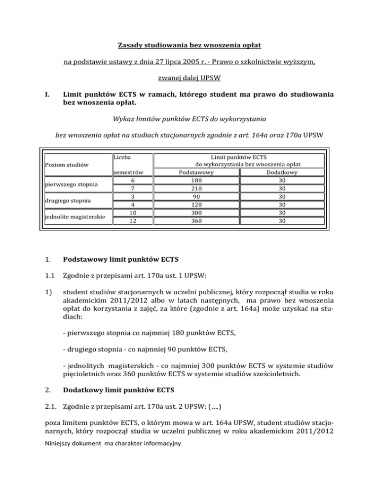 Zasady studiowania bez wnoszenia opłat na podstawie ustawy z dnia 27 lipca 2005 r. - Prawo o szkolnictwie wyższym, zwanej dalej UPSW I. Limit punktów ECTS w ramach, którego student ma prawo do studiowania bez wnoszenia opłat. Wykaz limitów punktów ECTS do wykorzystania bez wnoszenia opłat na studiach stacjonarnych zgodnie z art. 164a oraz 170a UPSW Liczba Poziom studiów pierwszego stopnia drugiego stopnia jednolite magisterskie semestrów 6 7 3 4 10 12 Limit punktów ECTS do wykorzystania bez wnoszenia opłat Podstawowy Dodatkowy 180 30 210 30 90 30 120 30 300 30 360 30 1. Podstawowy limit punktów ECTS 1.1 Zgodnie z przepisami art. 170a ust. 1 UPSW: 1) student studiów stacjonarnych w uczelni publicznej, który rozpoczął studia w roku akademickim 2011/2012 albo w latach następnych, ma prawo bez wnoszenia opłat do korzystania z zajęć, za które (zgodnie z art. 164a) może uzyskać na studiach: - pierwszego stopnia co najmniej 180 punktów ECTS, - drugiego stopnia - co najmniej 90 punktów ECTS, - jednolitych magisterskich - co najmniej 300 punktów ECTS w systemie studiów pięcioletnich oraz 360 punktów ECTS w systemie studiów sześcioletnich. 2. Dodatkowy limit punktów ECTS 2.1. Zgodnie z przepisami art. 170a ust. 2 UPSW: (….) poza limitem punktów ECTS, o którym mowa w art. 164a UPSW, student studiów stacjonarnych, który rozpoczął studia w uczelni publicznej w roku akademickim 2011/2012 Niniejszy dokument ma charakter informacyjny albo w latach następnych, ma prawo bez wnoszenia opłat do korzystania z zajęć na określonym poziomie studiów, za które może uzyskać dodatkowo nie więcej niż 30 punktów ECTS, a student realizujący kształcenie w ramach indywidualnych studiów międzyobszarowych, o których mowa w art. 8 ust. 2 UPSW1 - nie więcej niż 90 punktów ECTS. II. Prawo do podjęcia studiów na drugim kierunku studiów bez wnoszenia opłat 1. Zgodnie art. 99 ust. 1a pkt. 1-3 UPSW opłat za studia na drugim i kolejnym kierunku studiów stacjonarnych nie pobiera się od: 1) studentów, którzy po ukończeniu studiów pierwszego stopnia kontynuują studia do uzyskania tytułu magistra lub równorzędnego, studentów, o których mowa w art. 170a ust. 3 i 4 (którzy w poprzednim roku akademickim spełnili kryteria otrzymywania stypendium rektora dla najlepszych studentów- znaleźli się w liczbie 10% najlepszych studentów danego kierunku studiów), studiujących drugi kierunek studiów na studiach stacjonarnych bez wnoszenia opłat, studentów studiujących na kierunkach, o których mowa w art. 170b ust. 1 (kierunki studiów związane z dyscyplinami artystycznymi); 2) 3) a także zgodnie z art. 29 ust. 2 pkt 2 ustawy z dnia 18 marca 2011 r. o zmianie ustawy - Prawo o szkolnictwie wyższym, ustawy o stopniach naukowych i tytule naukowym oraz o stopniach i tytule w zakresie sztuki oraz o zamianie niektórych innych ustaw (Dz. U. Nr 84, poz. 455 i Nr 112, poz. 654): (…) 4) studentów, przyjętych na studia na ten kierunek przed wejściem w życie nowelizacji lub w roku akademickim 2011/2012. 2. Na podstawie art. 170a ust. 3-9 UPSW: (…) 3) student2 lub absolwent3 pierwszego kierunku studiów stacjonarnych w uczelni publicznej ma prawo podjąć studia na drugim kierunku studiów stacjonarnych w uczelni publicznej bez wnoszenia opłat; do kontynuowania studiów bez wnoszenia opłat w kolejnym roku studiów, o których mowa w pkt. 3, ma prawo student, który w poprzednim roku studiów spełnił kryteria, o których mowa w art. 181 ust. 1 (spełnił kryteria niezbędne do otrzymywania stypendium rektora dla najlepszych studentów), z uwzględnieniem art. 174 ust. 4 (znalazł się w liczbie 10% najlepszych studentów danego kierunku studiów); 4) 1 art. 8 ust. 2 UPSW : Uczelnia, która ma co najmniej cztery uprawnienia do nadawania stopnia naukowego doktora habilitowanego może organizować indywidualne studia międzyobszarowe, obejmujące co najmniej dwa obszary kształcenia i prowadzące do uzyskania dyplomu na co najmniej jednym kierunku studiów, prowadzonym w danej uczelni przez podstawową jednostkę organizacyjną, mającą uprawnienie do nadawania stopnia naukowego doktora w obszarze wiedzy związanym z tym kierunkiem. 2 student, który podjął w uczelni publicznej studia stacjonarne pierwszego albo drugiego stopnia albo jednolite studia magisterskie w roku akademickim 2011/2012 lub w latach następnych (bez względu na ukończone przed dniem 1 października 2011 r. studia stacjonarne w uczelni publicznej bez wnoszenia opłat) i dla którego są to pierwsze studia stacjonarne w uczelni publicznej bez wnoszenia opłat na określonym poziomie kształcenia, na które otrzymał do wykorzystania liczbę punktów ECTS, o których mowa w art. 164a ustawy z dnia 27 lipca 2005 r. — Prawo o szkolnictwie wyższym. – źródło oświadczenie o którym mowa w pkt. III 3 absolwent studiów drugiego stopnia albo jednolitych studiów magisterskich, które były jego pierwszym kierunkiem studiów stacjonarnych w uczelni publicznej bez wnoszenia opłat rozpoczętych w roku akademickim 2011/2012 lub w latach następnych, i który podjął studia na drugim kierunku studiów stacjonarnych w uczelni publicznej bez wnoszenia opłat po dniu 30 września 2012 r. Niniejszy dokument ma charakter informacyjny 5) 6) 7) 8) 9) 3. student, który na pierwszym roku studiów, o których mowa w pkt. 3, nie spełnił kryteriów, o których mowa w art. 181 ust. 1, obowiązany jest wnieść opłaty za pierwszy rok studiów, zgodnie z umową (zawartą między uczelnią a studentem w formie pisemnej) i na zasadach określonych przez senat Uczelni; student, o którym mowa w pkt. 3 i 4, ma prawo bez wnoszenia opłat do korzystania z zajęć, za które może uzyskać po raz drugi limit punktów ECTS, o których mowa w art. 164a (pkt. I niniejszych zasad); uprawnienie, o którym mowa w pkt.3, jest jednorazowe; decyzje dotyczące prawa studenta do korzystania z zajęć bez wnoszenia op