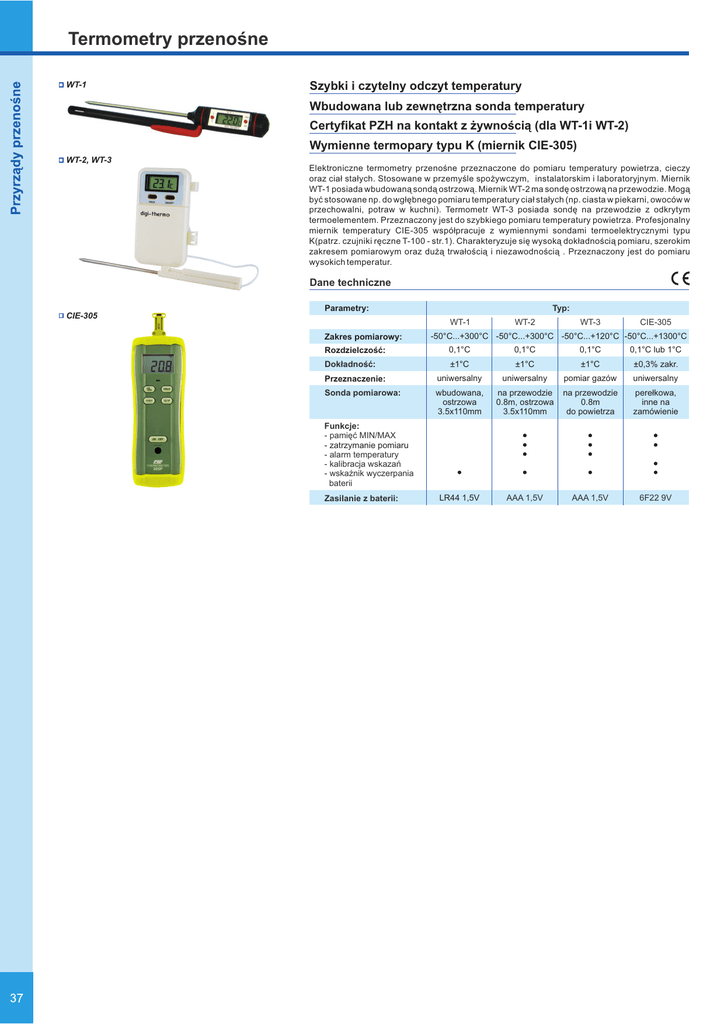Termometry przenoœne WT-1 Szybki i czytelny odczyt temperatury Wbudowana lub zewnêtrzna sonda temperatury Certyfikat PZH na kontakt z ¿ywnoœci¹ (dla WT-1i WT-2) Wymienne termopary typu K (miernik CIE-305) WT-2, WT-3 Elektroniczne termometry przenoœne przeznaczone do pomiaru temperatury powietrza, cieczy oraz cia³ sta³ych. Stosowane w przemyœle spo¿ywczym, instalatorskim i laboratoryjnym. Miernik WT-1 posiada wbudowan¹ sond¹ ostrzow¹. Miernik WT-2 ma sondê ostrzow¹ na przewodzie. Mog¹ byæ stosowane np. do wg³êbnego pomiaru temperatury cia³ sta³ych (np. ciasta w piekarni, owoców w przechowalni, potraw w kuchni). Termometr WT-3 posiada sondê na przewodzie z odkrytym termoelementem. Przeznaczony jest do szybkiego pomiaru temperatury powietrza. Profesjonalny miernik temperatury CIE-305 wspó³pracuje z wymiennymi sondami termoelektrycznymi typu K(patrz. czujniki rêczne T-100 - str.1). Charakteryzuje siê wysok¹ dok³adnoœci¹ pomiaru, szerokim zakresem pomiarowym oraz du¿¹ trwa³oœci¹ i niezawodnoœci¹ . Przeznaczony jest do pomiaru wysokich temperatur. Dane techniczne CIE-305 Typ: Parametry: WT-1 Zakres pomiarowy: WT-2 WT-3 CIE-305 -50°C...+300°C -50°C...+300°C -50°C...+120°C -50°C...+1300°C Rozdzielczoœæ: 0,1°C 0,1°C 0,1°C Dok³adnoœæ: ±1°C ±1°C ±1°C 0,1°C lub 1°C ±0,3% zakr. Przeznaczenie: uniwersalny uniwersalny pomiar gazów uniwersalny Sonda pomiarowa: wbudowana, ostrzowa 3.5x110mm na przewodzie 0.8m, ostrzowa 3.5x110mm na przewodzie 0.8m do powietrza pere³kowa, inne na zamówienie LR44 1,5V AAA 1,5V AAA 1,5V 6F22 9V Funkcje: - pamiêæ MIN/MAX - zatrzymanie pomiaru - alarm temperatury - kalibracja wskazañ - wskaŸnik wyczerpania baterii Zasilanie z baterii: