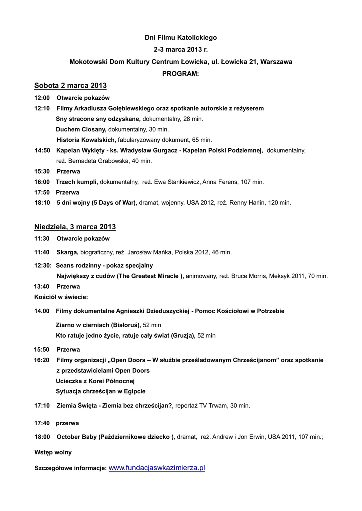 Dni Filmu Katolickiego 2-3 marca 2013 r. Mokotowski Dom Kultury Centrum Łowicka, ul. Łowicka 21, Warszawa PROGRAM: Sobota 2 marca 2013 12:00 Otwarcie pokazów 12:10 Filmy Arkadiusza Gołębiewskiego oraz spotkanie autorskie z reżyserem Sny stracone sny odzyskane, dokumentalny, 28 min. Duchem Ciosany, dokumentalny, 30 min. Historia Kowalskich, fabularyzowany dokument, 65 min. 14:50 Kapelan Wyklęty - ks. Władysław Gurgacz - Kapelan Polski Podziemnej, dokumentalny, reż. Bernadeta Grabowska, 40 min. 15:30 Przerwa 16:00 Trzech kumpli, dokumentalny, reż. Ewa Stankiewicz, Anna Ferens, 107 min. 17:50 Przerwa 18:10 5 dni wojny (5 Days of War), dramat, wojenny, USA 2012, reż. Renny Harlin, 120 min. Niedziela, 3 marca 2013 11:30 Otwarcie pokazów 11:40 Skarga, biograficzny, reż. Jarosław Mańka, Polska 2012, 46 min. 12:30: Seans rodzinny - pokaz specjalny Największy z cudów (The Greatest Miracle ), animowany, reż. Bruce Morris, Meksyk 2011, 70 min. 13:40 Przerwa Kościół w świecie: 14.00 Filmy dokumentalne Agnieszki Dzieduszyckiej - Pomoc Kościołowi w Potrzebie Ziarno w cierniach (Białoruś), 52 min Kto ratuje jedno życie, ratuje cały świat (Gruzja), 52 min 15:50 Przerwa 16:20 Filmy organizacji „Open Doors – W służbie prześladowanym Chrześcijanom” oraz spotkanie z przedstawicielami Open Doors Ucieczka z Korei Północnej Sytuacja chrześcijan w Egipcie 17:10 Ziemia Święta - Ziemia bez chrześcijan?, reportaż TV Trwam, 30 min. 17:40 przerwa 18:00 October Baby (Październikowe dziecko ), dramat, reż. Andrew i Jon Erwin, USA 2011, 107 min.; Wstęp wolny Szczegółowe informacje: www.fundacjaswkazimierza.pl