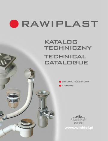 RAWIPLAST KATALOG TECHNICZNY TECHNICAL CATALOGUE SIPHONS www.winkiel.pl Syfony, półsyfony Traps and wastes A11232 Półsyfon butelkowy 32 umywalka, bidet Wash-basin/bidet trap 32 MAX230 - MIN110 MAX 135 MIN 45 G1¼” MAX250 - MIN160 EAN 5903874271789 32 PN-EN 274-1 : 2004 Atest Higieniczny/ Hygienic Certificate: HK/W/0401/01/2011 Technical data Dane techniczne Material : PP, TPE Materiał : PP, TPE Flow rate : 0,6l/s Przepływ wody : 0,6l/s Logistics data Dane logistyczne Weight of product : 0,2 kg Waga produktu : 0,2 kg Package pieces : 50 Opakowanie zbiorcze sztuk : 50 Size of package (mm) : 600x400x450 Wymiary op. zb. (mm) : 600x400x450 A11350 Półsyfon butelkowy 50 umywalka, bidet Wash-basin/bidet trap 50 MAX230 - MIN110 MAX 135 MIN 45 G1¼” MAX250 - MIN160 EAN 5903874271796 50 PN-EN 274-1 : 2004 Atest Higieniczny/ Hygienic Certificate: HK/W/0401/01/2011 Technical data Dane techniczne Material : PP, TPE Materiał : PP, TPE Flow rate : 0,6l/s Przepływ wody : 0,6l/s Logistics data Dane logistyczne Weight of product : 0,23 kg Waga produktu : 0,23 kg Package pieces : 50 Opakowanie zbiorcze sztuk :50 Size of package (mm) : 600x400x450 Wymiary op. zb. (mm) : 600x400x450 Grupa II RAWIPLAST Syfony, półsyfony Traps and wastes A11440 MAX 255 - MIN 165 G1¼” Półsyfon butelkowy 40 umywalka, bidet Wash-basin/bidet trap 40 MAX 230 - MIN 110 MAX 145 MIN 55 EAN 5903874271871 40 PN-EN 274-1 : 2004 Atest Higieniczny/ Hygienic Certificate: HK/W/0401/01/2011 Technical data Dane techniczne Material : PP, TPE Materiał : PP, TPE Flow rate : 0,6l/s Przepływ wody : 0,6l/s Logistics data Dane logistyczne Weight of product : 0,23 kg Waga produktu : 0,23 kg Package pieces : 50 Opakowanie zbiorcze sztuk :50 Size of package (mm) : 600x400x450 Wymiary op. zb. (mm) : 600x400x450 A12032M EAN 5903874271611 G1¼” Półsyfon butelkowy 32 umywalka, bidet Wash-basin/bidet trap 32, 320 - MIN 1 10 MAX 135 MIN 45 MAX MAX 220 - MIN 130 Grupa II RAWIPLAST 32 PN-EN 274-1 : 2004 Atest Higieniczny/ Hygienic Certificate: HK/W/0401/01/2011 Technical data Dane techniczne Material : metal chrome plated, TPE Materiał : metal chromowany, TPE Flow rate : 0,6l/s Przepływ wody : 0,6l/s Logistics data Dane logistyczne Weight of product : 0,33 kg Waga produktu : 0,33 kg Package pieces : 10 Opakowanie zbiorcze sztuk : 10 Size of package (mm) : 400x300x250 Wymiary op. zb. (mm) : 400x300x250 Syfony, półsyfony Traps and wastes A12332M EAN 5903874272472 G1¼” 340 - MIN 110 MAX 160 MIN 75 MIN 135 - MAX 220 MAX 32 Półsyfon butelkowy 32 umywalka, bidet Wash-basin/bidet trap 32, round PN-EN 274-1 : 2004 Atest Higieniczny/ Hygienic Certificate: HK/W/0401/01/2011 Technical data Dane techniczne Material : metal chrome plated, TPE Materiał : metal chromowany, TPE Flow rate : 0,6l/s Przepływ wody : 0,6l/s Logistics data Dane logistyczne Weight of product : 0,75 kg Waga produktu : 0,75 kg Package pieces : 1 Opakowanie zbiorcze sztuk : 1 Packed in blister Pakowane w blister A12832M EAN 5903874274476 G1¼” 340 - MIN 110 MAX 145 MIN 60 MIN 120 - MAX 190 MAX 32 Półsyfon butelkowy 32 umywalka, bidet Wash-basin/bidet trap 32, square PN-EN 274-1 : 2004 Atest Higieniczny/ Hygienic Certificate: HK/W/0401/01/2011 Technical data Dane techniczne Material : metal chrome plated, TPE Materiał : metal chromowany, TPE Flow rate : 0,6l/s Przepływ wody : 0,6l/s Logistics data Dane logistyczne Weight of product : 0,95 kg Waga produktu : 0,95 kg Package pieces : 1 Opakowanie zbiorcze sztuk : 1 Packed in blister Pakowane w blister Grupa II RAWIPLAST Syfony, półsyfony Traps and wastes A12132M EAN 5903874271628 G1¼” Półsyfon rurowy 32 umywalka, bidet Wash-basin/bidet trap 32 MAX 90 MIN 25 MAX200 - MIN 135 260 32 PN-EN 274-1 : 2004 Atest Higieniczny/ Hygienic Certificate: HK/W/0401/01/2011 Technical data Dane techniczne Material : metal chromowany, TPE Materiał : metal chromowany, TPE Flow rate : 0,6l/s Przepływ wody : 0,6l/s Logistics data Dane logistyczne Weight of product : 0,3 kg Waga produktu : 0,3 kg Package pieces : 10 Opakowanie zbiorcze sztuk : 10 Size of package (mm) : 400x300x250 Wymiary op. zb. (mm) : 400x300x250 A11632 Półsyfon rurowy 32 umywalka, bidet Wash-basin/bidet trap 32 280 G1¼” MAX 125 MIN 35 EAN 5903874272571 MAX235 - MIN145 Grupa II RAWIPLAST 32 PN-EN 274-1 : 2004 Atest Higieniczny/ Hygienic Certificate: HK/W/0401/01/2011 Technical data Dane techniczne Material : PP, TPE Materiał : PP, TPE Flow rate : 0,6l/s Przepływ wody : 0,6l/s Logistics data Dane logistyczne Weight of product : 0,2 kg Waga produktu : 0,2 kg Package pieces : 30 Opakowanie zbiorcze sztuk : 30 Size of package (mm) : 400x300x450 Wymiary op. zb. (mm) : 400x300x450 Syfony, półsyfony Traps and wastes A13032 EAN 5903874277804 MAX 220 G1½” MAX 320 -MIN 230 MAX 160-MIN 80 230 Półsyfon butelkowy 32 oszczędzający miejsce Bottle trap 32 PN-EN 274-1:2004 / PN-EN 274-1:2004/Ap1 Atest Higieniczny/ Hygienic Certificate: Dane techniczne Materiał : PP, TPE Przepływ wody : 0,6l/s Dane logistyczne Waga produktu : 0,26 kg Opakowanie zbiorcze sztuk : 24 Wymiary op. zb. (mm) : 400x300x450 32 HK/W/0401/01/2011 Technical data Material : PP, TPE Flow rate : 0,6l/s Logistics data Weight of product : 0,26 kg Package pieces : 24 Size of package (mm) : 400x300x450 A13232 EAN 5903874277828 MAX 220 Półsyfon rurowy 32 oszczędzający miejsce Pipe trap 32 PN-EN 274-1:2004 / PN-EN 274-1:2004/Ap1 Atest Higieniczny/ Hygienic Certificate: Dane techniczne Materiał : PP, TPE Przepływ wody : 0,6l/s Dane logistyczne Waga produktu : 0,26 kg Opakowanie zbiorcze sztuk : 24 Wymiary op. zb. (mm) : 400x300x450 280 MAX 140-MIN 120 MAX 290 -MIN 270 G1½” 32 HK/W/0401/01/2011 Technical data Material : PP, TPE Flow rate : 0,6l/s Logistics data Weight of product : 0,26 kg Package pieces : 24 Size of package (mm) : 400x300x450 Grupa II RAWIPLAST Syfony, półsyfony Traps and wastes A131M32 EAN 5903874277811 MAX 220 MAX 350-MIN 260 MAX 160-MIN 80 230 Syfon butelkowy 32 oszcz