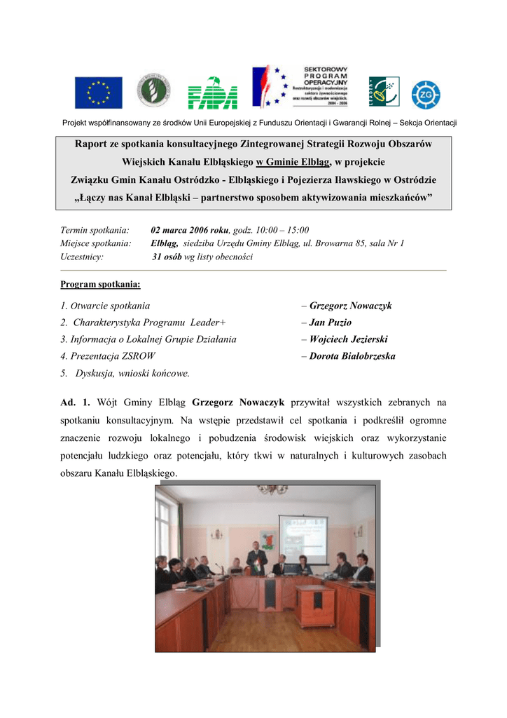 Projekt współfinansowany ze środków Unii Europejskiej z Funduszu Orientacji i Gwarancji Rolnej – Sekcja Orientacji Raport ze spotkania konsultacyjnego Zintegrowanej Strategii Rozwoju Obszarów Wiejskich Kanału Elbląskiego w Gminie Elbląg, w projekcie Związku Gmin Kanału Ostródzko - Elbląskiego i Pojezierza Iławskiego w Ostródzie „Łączy nas Kanał Elbląski – partnerstwo sposobem aktywizowania mieszkańców” Termin spotkania: Miejsce spotkania: Uczestnicy: 02 marca 2006 roku, godz. 10:00 – 15:00 Elbląg, siedziba Urzędu Gminy Elbląg, ul. Browarna 85, sala Nr 1 31 osób wg listy obecności Program spotkania: 1. Otwarcie spotkania – Grzegorz Nowaczyk 2. Charakterystyka Programu Leader+ – Jan Puzio 3. Informacja o Lokalnej Grupie Działania – Wojciech Jezierski 4. Prezentacja ZSROW – Dorota Białobrzeska 5. Dyskusja, wnioski końcowe. Ad. 1. Wójt Gminy Elbląg Grzegorz Nowaczyk przywitał wszystkich zebranych na spotkaniu konsultacyjnym. Na wstępie przedstawił cel spotkania i podkreślił ogromne znaczenie rozwoju lokalnego i pobudzenia środowisk wiejskich oraz wykorzystanie potencjału ludzkiego oraz potencjału, który tkwi w naturalnych i kulturowych zasobach obszaru Kanału Elbląskiego. Ad. 2. Po krótkim wstępie głos oddano Zastępcy Wójta Janowi Puzio, który jako koordynator gminny programu omówił szczegółowo program spotkania oraz ideę Pilotażowego Programu Leader+. Ad. 3. Wojciech Jezierski, jako członek komitetu założycielskiego Stowarzyszenia Łączy nas Kanał Elbląski LGD poinformował wszystkich zebranych, że nad opracowaniem strategii oraz ideą założenia Stowarzyszenia pracowały rzesze osób z trzech powiatów na organizowanych warsztatach i konsultacjach. Projekt obejmuje 10 gmin z 3 powiatów: elbląskiego, ostródzkiego i iławskiego. Pierwsze spotkanie informacyjne odbyło się w listopadzie w Starostwie Powiatowym w Elblągu. Tam przedstawiono ideę Programu Leader+ i tam wyłoniły się pierwsze osoby - liderzy ze środowisk wiejskich, które później wyraziły wolę dalszej współpracy. W Schemacie I Pilotażowego Programu Leader+ są do wykonania dwa podstawowe zadania: utworzenie i zarejestrowanie Lokalnej Grupy Działania oraz opracowanie Zintegrowanej Strategii Rozwoju Obszarów Wiejskich. I właśnie w tym celu spotykaliśmy się kilkakrotnie w Ostródzie, Iławie, Pasłęku. Dnia 18 stycznia 2006 r. odbyło się I Walne Zgromadzenie członków założycieli Stowarzyszenia Łączy Nas Kanał Elbląski LGD, które wówczas liczyło 34 osoby. Dnia 22 lutego 2006 roku Stowarzyszenie zostało zarejestrowane w sądzie i dziś 02 marca 2006 roku uprawomocniło się. Deklaracje udziału w Stowarzyszeniu zgłosiło 11 samorządów gminnych, 2 powiaty oraz 4 stowarzyszenia ponadto Związek Gmin Kanału Ostródzko - Elbląskiego i Pojezierza Iławskiego oraz Powiatowy Urząd Pracy w Elblągu. Zakładamy, że stowarzyszenie liczyć będzie docelowo około 70 osób. Jak wspominano drugim zadaniem w Schemacie I jest opracowanie ZSROW. Część planistyczna strategii została przygotowana podczas spotkań szkoleniowo - warsztatowych i teraz do 14 marca 2006 roku trwają konsultacje w poszczególnych samorządach. Ad. 4. Dorota Białobrzeska – jako koordynator gminny przedstawiła na wstępie osoby z gminy Elbląg, które współpracowały czynnie na warsztatach i konsultacjach: w grupie odnowy wsi Panie Jadwiga Ciszewska i Celina Sokołowska oraz przy opracowywaniu strategii radny Włodzimierz Żuk. Następnie w formie prezentacji multimedialnej przedstawiono część planistyczną Zintegrowanej Strategii Rozwoju Obszarów Wiejskich. Omówiono w szczegółach: v Charakterystykę Lokalnej Grupy Działania; v Diagnozę obszaru, która ukazuje spójność obszaru pod względem historycznym, kulturowym, ekonomicznym i przyrodniczym. Wskazano cechy wspólne obszaru; v Analizę SWOT, gdzie poddano ocenie mocne i słabe strony oraz szanse i zagrożenia obszaru LGD. W podsumowaniu analizy SWOT warte podkreślenia było stwierdzenie, że słabe strony należy wzmacniać, opierać się na mocnych stronach, wykorzystywać szanse, a zagrożeń unikać, aby nie wpływały na nas negatywnie. D. Białobrzeska w dalszej części przedstawiła wizję zawartą w ZSROW, która odnosi się do całego obszaru LGD i odpowiada na pytanie: co chcemy osiągnąć? Wizja: „Obszar Kanału Elbląskiego otwarty na świat”. Uczestnicy spotkania uznali, że wizja jest słuszna i trzeba dążyć do tego, by ta otwartość obszaru Kanału Elbląskiego odzwierciedlała się w różnych aspektach. Następnie poddano ocenie misję LGD: „Jesteśmy po to, żeby zaktywizować społeczność na rzecz wdrożenia zintegrowanej strategii rozwoju obszarów wiejskich Kanału Elbląskiego”. D. Białobrzeska wyjaśniła, że misja ta opisuje sposób działania LGD w dążeniu do realizacji wizji i stanowi swoiste credo wyrażające filozofię działania LGD. v Przedstawiono tematy strategii oraz analizę problemów i analizę celów; v Zapoznano zebranych z zadaniami sieciowymi przewidzianymi do realizacji w ramach projektu „Łączy nas Kanał Elbląski” oraz z zadaniami gmin na lata 2007-2013. Z zadań sieciowym każda gmina jest odpowiedzialna za jedno zadanie i Gmina Elbląg odpowiada za zadanie „oznakowanie obiektów przyrodniczo-kulturowych”. Zadania gminne ujęte do strategii to remont i rozbudowa kompleksu sportowego w Lisowie, budowa kompleksu sportowo-rekreacyjnego w Gronowie Górnym, budowa 5 plenerowych miejsc integracji mieszkańców gminy Elbląg, sporządzenie wizualnej informacji turystycznej gminy Elbląg, adaptacja budynku komunalnego na świetlicę wiejską w Nowakowie i jako partner w realizacji zadania budowa repliki osady Truso nad jeziorem Druzno. Poinformowano zebranych, że grupa odnowy wsi przygotowała także swoje projekty. Z Gminy Elbląg przygotowano dwie fiszki projektowe: 1. Kurs obsługi komputera dla mieszkańców ws