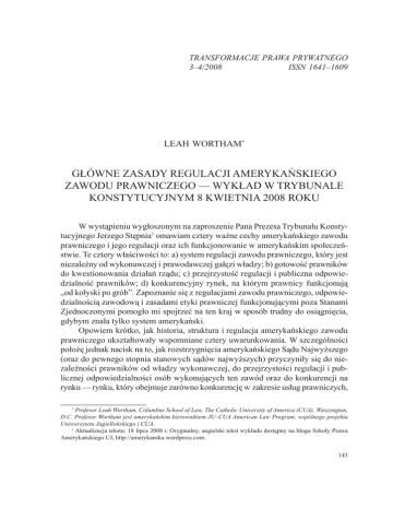 Transformacje Prawa Prywatnego 3–4/2008 ISSN 1641–1609 Leah Wortham* GŁÓWNE ZASADY REGULACJI AMERYKAŃSKIEGO ZAWODU PRAWNICZEGO — WYKŁAD W TRYBUNALE KONSTYTUCYJNYM 8 KWIETNIA 2008 roku W wystąpieniu wygłoszonym na zaproszenie Pana Prezesa Trybunału Konstytucyjnego Jerzego Stępnia omawiam cztery ważne cechy amerykańskiego zawodu prawniczego i jego regulacji oraz ich funkcjonowanie w amerykańskim społeczeństwie. Te cztery właściwości to: a) system regulacji zawodu prawniczego, który jest niezależny od wykonawczej i prawodawczej gałęzi władzy; b) gotowość prawników do kwestionowania działań rządu; c) przejrzystość regulacji i publiczna odpowiedzialność prawników; d) konkurencyjny rynek, na którym prawnicy funkcjonują „od kołyski po grób”. Zapoznanie się z regulacjami zawodu prawniczego, odpowiedzialnością zawodową i zasadami etyki prawniczej funkcjonującymi poza Stanami Zjednoczonymi pomogło mi spojrzeć na ten kraj w sposób trudny do osiągnięcia, gdybym znała tylko system amerykański. Opowiem krótko, jak historia, struktura i regulacja amerykańskiego zawodu prawniczego ukształtowały wspomniane cztery uwarunkowania. W szczególności położę jednak nacisk na to, jak rozstrzygnięcia amerykańskiego Sądu Najwyższego (oraz do pewnego stopnia stanowych sądów najwyższych) przyczyniły się do niezależności prawników od władzy wykonawczej, do przejrzystości regulacji i publicznej odpowiedzialności osób wykonujących ten zawód oraz do konkurencji na rynku — rynku, który obejmuje zarówno konkurencję w zakresie usług prawniczych, * Profesor Leah Wortham, Columbus School of Law, The Catholic University of America (CUA), Waszyngton, D.C. Profesor Wortham jest amerykańskim kierownikiem JU–CUA American Law Program, wspólnego projektu Uniwersytetu Jagiellońskiego i CUA. Aktualizacja tekstu: 18 lipca 2008 r. Oryginalny, angielski tekst wykładu dostępny na blogu Szkoły Prawa Amerykańskiego UJ, http://amerykanska.wordpress.com. 143 Transformacje Prawa Prywatnego 3–4/2008 jak i konkurencję między prawnikami o zatrudnienie. Amerykańscy prawnicy manifestowali podobne poglądy i preferencje do tych, które zauważam w innych krajach: wśród nich ograniczenie dostępu do zawodu, utrzymanie postępowania dyscyplinarnego za zamkniętymi drzwiami, ograniczenia reklamy. Rozstrzygnięcia amerykańskiego Sądu Najwyższego poddały kontroli samorząd prawników w sposób, który miał głęboki wpływ na naturę zawodu, jego regulację i rynek usług prawniczych. I. CZTERY CECHY AMERYKAŃSKIEGO ZAWODU PRAWNICZEGO, JEGO REGULACJI I FUNKCJONOWANIA W SPOŁECZEŃSTWIE A i B. Niezależność prawników od władz wykonawczej i prawodawczej, gotowość prawników do kwestionowania działań rządu Amerykański zawód prawniczy jest niezależny od władzy wykonawczej i prawodawczej. Nasza regulacja tego zawodu (zasady dopuszczania do zawodu i wykonywania go oraz postępowanie dyscyplinarne) prawie we wszystkich stanach należy do kompetencji najwyższego sądu w danym systemie. Nadzór ze strony władzy sądowniczej raczej nie tworzy nacisków na prawników, które odwodziłyby prawników od agresywnego kwestionowania działań rządu albo dochodzenia praw klientów. Widzę następujące przyczyny gotowości kwestionowania działań rządu. Osoby wykonujące zawód prawniczy to ponad milion prawników, którzy przeszli raczej zuniformizowany proces edukacji prawniczej i uzyskania uprawnień zawodowych. Mimo że między samymi prawnikami występują liczne różnice zdań, „prawnicy” — jako grupa — mogą wspólnie występować w kwestiach niezależności, zwłaszcza że mają wiele wspólnych przekonań co do funkcjonowania systemu prawnego i ich roli w nim. Rozmiar tej grupy zawodowej i częsty udział w życiu publicznym dają prawnikom potężną siłę. Dzięki członkom skupionym w organizacjach możliwe jest przeprowadzenie dokładnych rozważań na temat tego, jak powinna funkcjonować regulacja zawodu prawniczego. Ogólnokrajowe stowarzyszenie prawników (American Bar Association) zapewnia profesjonalną obsługę i infrastrukturę wielu prawnikom woluntariuszom, którzy pracują nad modelowymi zasadami postępowania zawodowego (Model Rules of Professional Conduct), kształtem postępowania dyscyplinarnego oraz nad innymi badaniami i modelami. Dla stanowych samorządów prawniczych ten dorobek jest punktem wyjścia przy rozważaniu zagadnień z zakresu regulacji zawodu prawniczego. Również inne zawodowe organizacje, jak na przykład Krajowa Konferencja Egzaminatorów Prawniczych (National Conference of Bar Exa144 Leah Wortham: Główne zasady regulacji amerykańskiego zawodu prawniczego — wykład w Trybunale… miners), Amerykańskie Stowarzyszenie Prawników Procesowych (American Trial Lawyers Association), Krajowe Stowarzyszenie Obrońców (National Association of Criminal Defense Lawyers), Amerykańskie Stowarzyszenie Prawników Korporacyjnych (American Corporate Counsel Association) zapewniają personel i struktury potrzebne do prowadzenia badań, pracy nad wspólnymi stanowiskami i reprezentacji interesu prawników. Sama liczebność i otwarty dostęp do zawodu powodują, że istnieje pośród prawników szerokie zróżnicowanie w zakresie poglądów politycznych i punktów widzenia na wszelkie inne sprawy. Zatem prawnicy również różnią się w dużej mierze co do tego, które działania i strategie rządu powinny być kontestowane. Jednak w ramach całej grupy zawodowej z reguły da się znaleźć jakichś prawników gotowych zakwestionować każde działanie rządu, co do którego można argumentować, że jest nielegalne albo stanowi nadużycie władzy rządu. Ponieważ w Stanach Zjednoczonych dostęp do pomocy prawnej dla osób, które mają mało pieniędzy, jest istotnym problemem, myślę, że każdy punkt widzenia może znaleźć swoich zwolenników, o ile istnieją fundusze potrzebne do wsparci