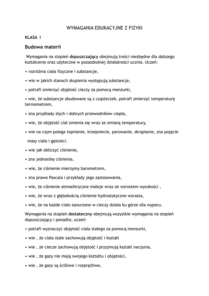 WYMAGANIA EDUKACYJNE Z FIZYKI KLASA I Budowa materii Wymagania na stopień dopuszczający obejmują treści niezbędne dla dalszego kształcenia oraz użyteczne w pozaszkolnej działalności ucznia. Uczeń: • rozróżnia ciała fizyczne i substancje, • wie w jakich stanach skupienia występują substancje, • potrafi zmierzyć objętość cieczy za pomocą menzurki, • wie, że substancje zbudowane są z cząsteczek, potrafi zmierzyć temperaturę termometrem, • zna przykłady złych i dobrych przewodników ciepła, • wie, że objętość ciał zmienia się wraz ze zmianą temperatury, • wie na czym polega topnienie, krzepniecie, parowanie, skraplanie, zna pojęcie masy ciała i gęstości. • wie jak obliczyć ciśnienie, • zna jednostkę ciśnienia, • wie, że ciśnienie mierzymy barometrem, • zna prawo Pascala i przykłady jego zastosowania, • wie, że ciśnienie atmosferyczne maleje wraz ze wzrostem wysokości , • wie, że wraz z głębokością ciśnienie hydrostatyczne wzrasta, • wie, że na każde ciało zanurzone w cieczy działa ku górze siła wyporu. Wymagania na stopień dostateczny obejmują wszystkie wymagania na stopień dopuszczający i ponadto, uczeń: • potrafi wyznaczyć objętość ciała stałego za pomocą menzurki, • wie , że ciała stałe zachowują objętość i kształt • wie , że ciecze zachowują objętość i przyjmują kształt naczynia, • wie , że gazy nie mają swojego kształtu i objętości, • wie , że gazy są ściśliwe i rozprężliwe, • wie , że istnieją różne skalę temperatur, • wie , że w wyższej temperaturze cząsteczki poruszają się szybciej, • potrafi obliczyć różnicę temperatur, • potrafi odczytać gęstość substancji z tablic , • zna jednostkę ciepła • zna definicję ciepła , • wie, kiedy ciepło jest przekazywane miedzy ciałami , • wie, że ruch cząsteczek gazu jest przyczyną wywierania przez niego ciśnienia, • wie, że ciśnienie gazu zależy od objętości zbiornika i jego temperatury, • wie, od czego zależy ciśnienie hydrostatyczne, • wie w jakich warunkach ciało pływa a w jakich tonie, • rozumie prawo Archimedesa, Wymagania na stopień dobry obejmują wszystkie wymagania na stopień dostateczny i ponadto, uczeń: • potrafi udowodnić doświadczalnie, że ciecze łatwo zmieniają swój kształt, • wie, że detergenty niszczą życie biologiczne, • potrafi udowodnić doświadczalnie, że zmiana kształtu ciała stałego nie wpływa na, zmianę objętości, • umie przeliczać temperatury w różnych skalach, • rozumie, że masa jest miarą ilości substancji, • rozumie pojęcie gęstości, • zna jednostki gęstości, • potrafi rozwiązywać zadania rachunkowe przekształcając wzór na gęstość, • zna składniki energii wewnętrznej, • wie, że energia wewnętrzna zależy od masy ciała - suma energii cząsteczek ciała, • stosuje pierwszą zasadę termodynamiki w prostych przykładach, • dostrzega znaczenie złego i dobrego przewodnictwa substancji • rozumie , że zmiana objętości ciała powoduje zmianę jego gęstości. Wymagania na stopień bardzo dobry obejmują wszystkie wymagania na stopień dobry i ponadto, uczeń: • potrafi wytłumaczyć dlaczego ciała stałe i ciecze są nieściśliwe w oparciu o budowę, cząsteczkową substancji, • potrafi wskazać zjawiska świadczące o występowaniu sił międzycząsteczkowych, • potrafi sporządzić wykres zależności m(V) do znajdywania gęstości , • umie posługiwać się powyższym wykresem, • potrafi zamieniać jednostki gęstości, • potrafi rozwiązywać zadania rachunkowe i problemowe, • potrafi rozwiązywać zadania problemowe i rachunkowe dotyczące I zasady termodynamiki, • zna sposoby przekazywania energii wewnętrznej, • rozwiązuje problemy związane z zjawiskiem rozszerzalności, • rozumie sens fizyczny pojęcia ciśnienia, • potrafi objaśnić prawo Pascala na podstawie teorii kinetyczno-cząsteczkowej, • potrafi objaśnić zasadę działania podnośnika i hamulca hydraulicznego, • potrafi rozwiązywać zadania rachunkowe z zastosowaniem wzoru na ciśnienie, • zna i rozumie warunki pływania ciał, • potrafi określić warunki pływania ciał. Ocenę celującą otrzymuje uczeń, który: • bez problemu opisuje właściwości materii, biegle rozwiązuje zadania problemowe i rachunkowe dotyczące:, masy i gęstości i ciśnienia hydrostatycznego. • potrafi rozwiązywać złożone problemy wymagające dobrej znajomości kilku zjawisk lub praw, • potrafi odszukać informacje w literaturze popularnonaukowej i zaprezentować je. Ruch Wymagania na stopień dopuszczający obejmują treści niezbędne dla dalszego kształcenia oraz użyteczne w pozaszkolnej działalności ucznia Uczeń: • wie, jak obliczać prędkość w ruchu jednostajnym, • wie, jakie są jednostki prędkości, • wie, jak obliczać przyspieszenie w ruchu jednostajnie przyspieszonym, • zna jednostkę przyspieszenia, • wie, z jakim przyspieszeniem spadają na ziemię ciała, • odróżnia ruch krzywoliniowy od prostoliniowego, jednostajny od niejednostajnego oraz przyspieszony od opóźnionego, Wymagania na stopień dostateczny obejmują wszystkie wymagania na stopień dopuszczający i ponadto, uczeń: • potrafi odróżnić oddziaływanie, elektryczne, magnetyczne i grawitacyjne, • potrafi nazwać substancje z których ciało jest zbudowane, • rozumie różnicę pomiędzy prędkością średnią a chwilową, • rozumie, czym jest przyspieszenie, • potrafi podać przykład jednostki przyspieszenia i objaśnić jej sens, • rozumie, co oznaczają wartości dodatnie i ujemne przyspieszenia, • umie sporządzić wykres położenia w zależności od czasu, Wymagania na stopień dobry obejmują wszystkie wymagania na stopień dostateczny i ponadto, uczeń: • umie przeliczać jednostki prędkości, • rozumie, co oznacza zerowa wartość przyspiesze