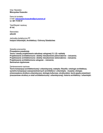 Imię i Nazwisko Mieczysław Kozaczko Dane do kontaktu e mail: [email protected] tel: 601 75 95 57 Tytuł/Stopień naukowy dr inż. Stanowisko adiunkt Jednostka dydaktyczna PP Instytut Urbanistyki, Architektury i Ochrony Dziedzictwa Sylwetka pracownika Prowadzone przedmioty Teoria i zasady projektowania zabudowy usługowej (1) i (2)- wykłady Projektowanie architektoniczne: obiekty mieszkaniowe jednorodzinne – ćwiczenia; Projektowanie architektoniczne: obiekty mieszkaniowe wielorodzinne – ćwiczenia; Projektowanie architektoniczne usługowe – ćwiczenia; Seminarium dyplomowe Zainteresowania naukowe Teoria kompozycji architektonicznej i urbanistycznej; estetyka; filozofia; ontologia architektury; symetria kompozycji czasoprzestrzennych (architektura i urbanistyka - muzyka); etologia; zrównoważona struktura urbanistyczna; ekologia kulturowa; strukturalizm; teoria języka przestrzeni (znaczeniowe struktury w skali architektonicznej i urbanistycznej); historia architektury i urbanistyki.
