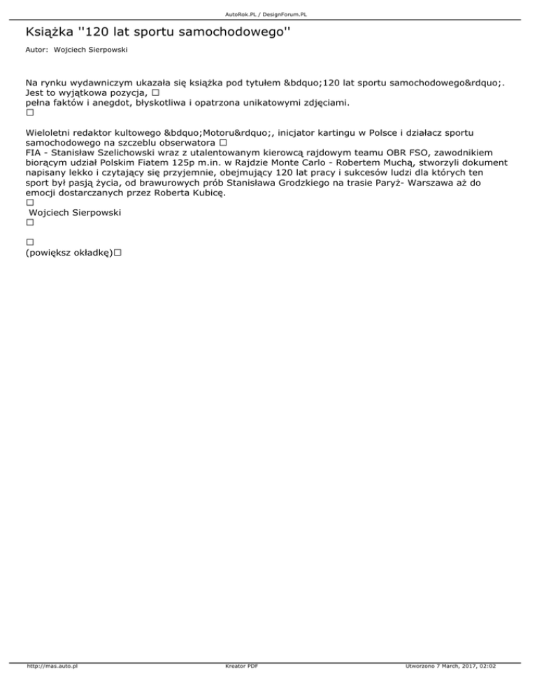 AutoRok.PL / DesignForum.PL Książka ''120 lat sportu samochodowego'' Autor: Wojciech Sierpowski Na rynku wydawniczym ukazała się książka pod tytułem „120 lat sportu samochodowego”. Jest to wyjątkowa pozycja, pełna faktów i anegdot, błyskotliwa i opatrzona unikatowymi zdjęciami. Wieloletni redaktor kultowego „Motoru”, inicjator kartingu w Polsce i działacz sportu samochodowego na szczeblu obserwatora FIA - Stanisław Szelichowski wraz z utalentowanym kierowcą rajdowym teamu OBR FSO, zawodnikiem biorącym udział Polskim Fiatem 125p m.in. w Rajdzie Monte Carlo - Robertem Muchą, stworzyli dokument napisany lekko i czytający się przyjemnie, obejmujący 120 lat pracy i sukcesów ludzi dla których ten sport był pasją życia, od brawurowych prób Stanisława Grodzkiego na trasie Paryż- Warszawa aż do emocji dostarczanych przez Roberta Kubicę. Wojciech Sierpowski (powiększ okładkę) http://mas.auto.pl Kreator PDF Utworzono 7 March, 2017, 02:02
