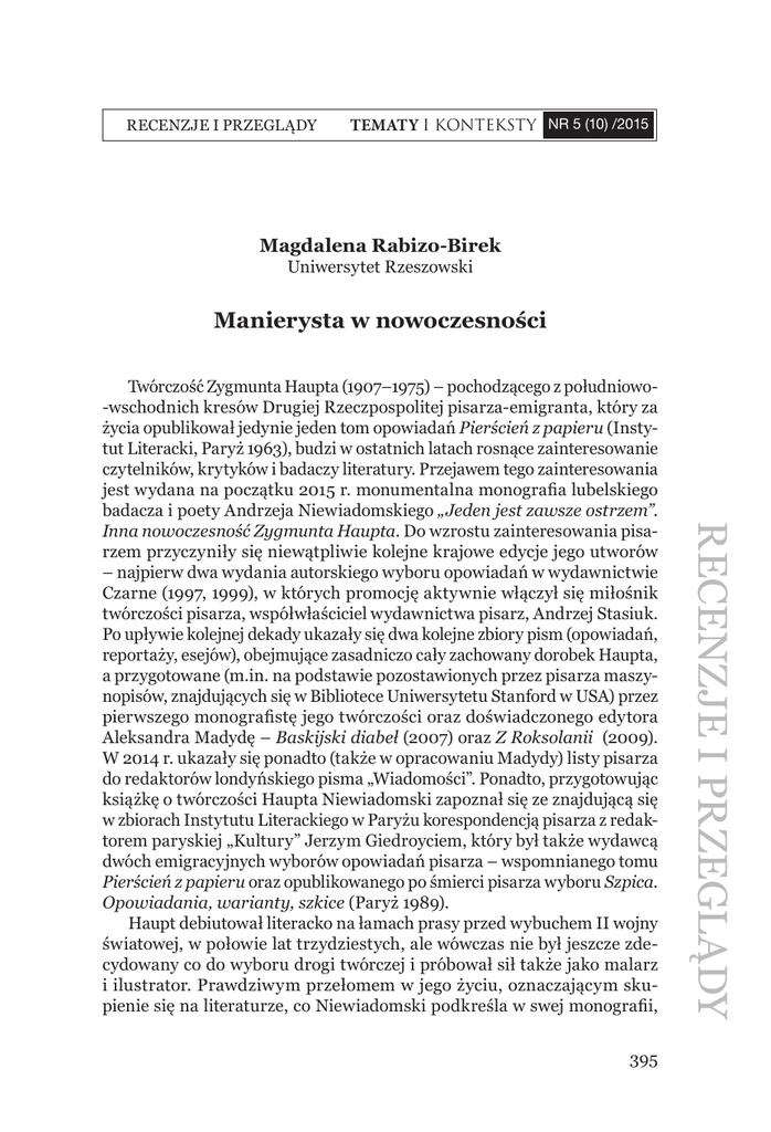 RECENZJE I PRZEGLĄDY TEMATY I KONTEKSTY NR 5 (10) /2015 Magdalena Rabizo-Birek Uniwersytet Rzeszowski Manierysta w nowoczesności 395 RECENZJE I PRZEGLĄDY Twórczość Zygmunta Haupta (1907–1975) – pochodzącego z południowo-wschodnich kresów Drugiej Rzeczpospolitej pisarza-emigranta, który za życia opublikował jedynie jeden tom opowiadań Pierścień z papieru (Instytut Literacki, Paryż 1963), budzi w ostatnich latach rosnące zainteresowanie czytelników, krytyków i badaczy literatury. Przejawem tego zainteresowania jest wydana na początku 2015 r. monumentalna monografia lubelskiego badacza i poety Andrzeja Niewiadomskiego „Jeden jest zawsze ostrzem”. Inna nowoczesność Zygmunta Haupta. Do wzrostu zainteresowania pisarzem przyczyniły się niewątpliwie kolejne krajowe edycje jego utworów – najpierw dwa wydania autorskiego wyboru opowiadań w wydawnictwie Czarne (1997, 1999), w których promocję aktywnie włączył się miłośnik twórczości pisarza, współwłaściciel wydawnictwa pisarz, Andrzej Stasiuk. Po upływie kolejnej dekady ukazały się dwa kolejne zbiory pism (opowiadań, reportaży, esejów), obejmujące zasadniczo cały zachowany dorobek Haupta, a przygotowane (m.in. na podstawie pozostawionych przez pisarza maszynopisów, znajdujących się w Bibliotece Uniwersytetu Stanford w USA) przez pierwszego monografistę jego twórczości oraz doświadczonego edytora Aleksandra Madydę – Baskijski diabeł (2007) oraz Z Roksolanii (2009). W 2014 r. ukazały się ponadto (także w opracowaniu Madydy) listy pisarza do redaktorów londyńskiego pisma „Wiadomości”. Ponadto, przygotowując książkę o twórczości Haupta Niewiadomski zapoznał się ze znajdującą się w zbiorach Instytutu Literackiego w Paryżu korespondencją pisarza z redaktorem paryskiej „Kultury” Jerzym Giedroyciem, który był także wydawcą dwóch emigracyjnych wyborów opowiadań pisarza – wspomnianego tomu Pierścień z papieru oraz opublikowanego po śmierci pisarza wyboru Szpica. Opowiadania, warianty, szkice (Paryż 1989). Haupt debiutował literacko na łamach prasy przed wybuchem II wojny światowej, w połowie lat trzydziestych, ale wówczas nie był jeszcze zdecydowany co do wyboru drogi twórczej i próbował sił także jako malarz i ilustrator. Prawdziwym przełomem w jego życiu, oznaczającym skupienie się na literaturze, co Niewiadomski podkreśla w swej monografii, Magdalena Rabizo-Birek było doświadczenie wojenne, czynny udział w randze oficera w kampanii wrześniowej, opuszczenie po agresji ZSRR 17 września 1939 r. na zawsze ojczystego kraju, przedostanie się na Zachód – najpierw do Francji, gdzie uczestniczył w formowaniu się polskich sił zbrojnych, a po jej kapitulacji w 1941 r. do Wielkiej Brytanii, i w końcu, tuż po zakończeniu wojny, przenosiny z rodziną do USA. W latach wojny Haupt napisał kilkanaście opowiadań, które, choć w części były publikowane w pismach żołnierskich, a w 1946 r. przygotowane przez pisarza w formie zbioru, nigdy się w tak zaprojektowanej formie nie ukazały. Podobnie zresztą jak nie został opublikowany zaplanowany przez niego tak zwany Ostatni zbiór opowiadań. Wspominam o tych znamiennych faktach, ponieważ jednym z zagadnień, które Niewiadomski porusza w swojej monografii – w rozdziale czwartym zatytułowanym Jak należałoby wydawać (i czytać) prozę Zygmunta Haupta? – jest problem najwłaściwszej formy edycji zachowanego dorobku pisarza. Nasuwa się paralela z dziejami twórczości Cypriana Norwida, którego pisma w pełnej postaci ukazały się dopiero w latach osiemdziesiątych XX wieku. Propozycja Niewiadomskiego, krytykującego arbitralnie wartościujące wybory utworów Haupta przygotowane przez Madydę (choć podkreślającego jednocześnie jego edytorską sumienność i badawczą wnikliwość), zmierza w kierunku wytyczonym przez takie edycje dzieł zebranych, w których utwory są zamieszczone wedle uprawianych przez pisarzy rodzajów i gatunków twórczości, z zachowaniem integralności zredagowanych przez nich tomów, jeśli takowe wersje się zachowały. Przyznam, że propozycja przygotowania i wydania w taki sposób dzieł zebranych Haupta, w której znalazłby się także tom z wariantami utworów oraz zawierający jego ilustracje prasowe, projekty graficzne, reprodukcje zachowanych rysunków, grafik i obrazów, wydaje mi się bardzo fortunna i potrzebna. Wiele bowiem wskazuje na to, że Haupt, choć nie stał się jeszcze, a może nigdy nie stanie z powodu trudnej oryginalności i nowatorstwa, autorem popularnym i masowo czytanym, jest w zgodnej opinii krytyków i literaturoznawców twórcą wybitnym, prekursorem wielu nurtów współczesnej (i najnowszej) polskiej literatury, godnym pozycji jej klasyka. Miarodajna w tym względzie wydaje mi się przekazana mi w prywatnym liście opinia Henryka Berezy, który po krajowej publikacji Pierścienia z papieru napisał, że Haupt jest najwybitniejszym po Gombrowiczu emigracyjnym prozaikiem. A zważmy, że jego „konkurentami” w tym rodzaju literackim są takie postaci, jak Józef Mackiewicz, Gustaw Herling-Grudziński, Andrzej Bobkowski i Zofia Romanowiczowa, by wymienić tylko najwybitniejszych emigracyjnych prozaików z generacji wojennej. Niewiadomski nie formułuje w swojej książce jednoznacznie wartościującej opinii na temat pisarstwa Haupta, choć z pewnością najwyższe uznanie dla jego dorobku – sugerowane choćby w cytacie wybranym jako jej tytuł – leży u źródeł podjętego przez niego imponującego, poznawczego wysiłku. Ukazuje wielkość autora Szpicy przez badawczą skrupulatność 396 Manierysta w nowoczesności i interpretacyjno-analityczną wnikliwość, pozwalającą mu w kolejnych rozdziałach odsłaniać misterną konstrukcję formalną oraz ściśle z nią powiązaną złożoność znaczeniową omawianych utworów. Konfrontuje jego pisarstwo z dziełami mistrzów polskiego modernizmu: Miciń