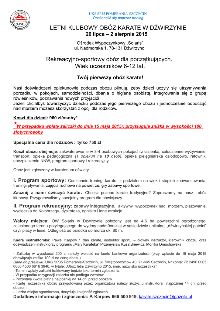 UKS SP35 POMERANIA-SZCZECIN Doskonalić się poprzez trening LETNI KLUBOWY OBÓZ KARATE W DŹWIRZYNIE 26 lipca – 2 sierpnia 2015 Ośrodek Wypoczynkowy „Solaris” ul. Nadmorska 1, 78-131 Dźwirzyno Rekreacyjno-sportowy obóz dla początkujących. Wiek uczestników 6-12 lat. Twój pierwszy obóz karate! Nasi doświadczeni opiekunowie podczas obozu pilnują, żeby dzieci uczyły się utrzymywania porządku w pokojach, samodzielności, dbania o higienę osobistą, integrowania się z grupą rówieśników, poznawania nowych przyjaciół. Jeżeli chciałbyś towarzyszyć dziecku podczas jego pierwszego obozu i jednocześnie odpocząć nad morzem możesz skorzystać z opcji dla rodziców. Koszt dla dzieci: 960 zł/osoby* *W przypadku wpłaty zaliczki do dnia 15 maja 2015r. przysługuje zniżka w wysokości 100 złotych/osoby Specjalna cena dla rodziców: tylko 750 zł Koszt obozu obejmuje: zakwaterowanie w 3-4 osobowych pokojach z łazienką, całodzienne wyżywienie, transport, opieka pedagogiczna (1 opiekun na 10 osób), opieka pielęgniarska całodobowo, ratownik, ubezpieczenie NNW, program sportowy i rekreacyjny. Obóz jest zgłoszony w kuratorium oświaty. I. Program sportowy: Codziennie treningi karate z podziałem na wiek i stopień zaawansowania, treningi pływania, zajęcia ruchowe na powietrzu, gry zabawy sportowe. Zacznij z nami ćwiczyć karate. Chcesz poznać karate tradycyjne? Zapraszamy na nasz obóz klubowy. Przygotowaliśmy specjalny program dla nowicjuszy. II. Program rekreacyjny: zabawy integracyjne, aktywny wypoczynek nad morzem, plażowanie, wycieczka do Kołobrzegu, dyskoteka, ognisko i inne atrakcje. Walory miejsca: OW Solaris w Dźwirzynie położony jest na 4,6 ha powierzchni ogrodzonego, zalesionego terenu przylegającego do wydmy nadm0orskiej w sąsiedztwie unikalnej „dźwirzyńskiej patelni” czyli plaży w lesie. Odległość od osrodka do morza ok. 80 m. Kadra instruktorska: Paweł Karpow 1 dan karate, instruktor sportu – główny instruktor, kierownik obozu, oraz doświadczeni instruktorzy programu „Mały Karateka” Przemysław Kusztykiewicz, Monika Dmochowska - Zaliczkę w wysokości 200 zł należy wpłacić na konto bankowe organizatora (przy wpłacie do 15 maja 2015 obowiązuje zniżka 100 zł na cenę obozu) Dane do przelewu: UKS SP35 Pomerania-Szczecin, ul. Świętoborzyców 40, 71-665 Szczecin, Nr konta: 72 2490 0005 0000 4500 6616 3946, w tytule: „Obóz letni Dźwirzyno 2015, imię, nazwisko uczestnika” - Termin wpłaty zaliczki traktowany będzie jako termin zgłoszenia. - W przypadku rezygnacji zaliczka nie podlega zwrotowi. - Pozostała kwota płatna najpóźniej na 14 dni przed obozem. - Kartę uczestnika obozu przygotowaną przez organizatora należy złożyć u instruktora najpóźniej 14 dni przed obozem. - Liczba miejsc ograniczona, decyduje kolejność zgłoszeń. Dodatkowe informacje i zgłoszenia: P. Karpow 666 500 919, [email protected]