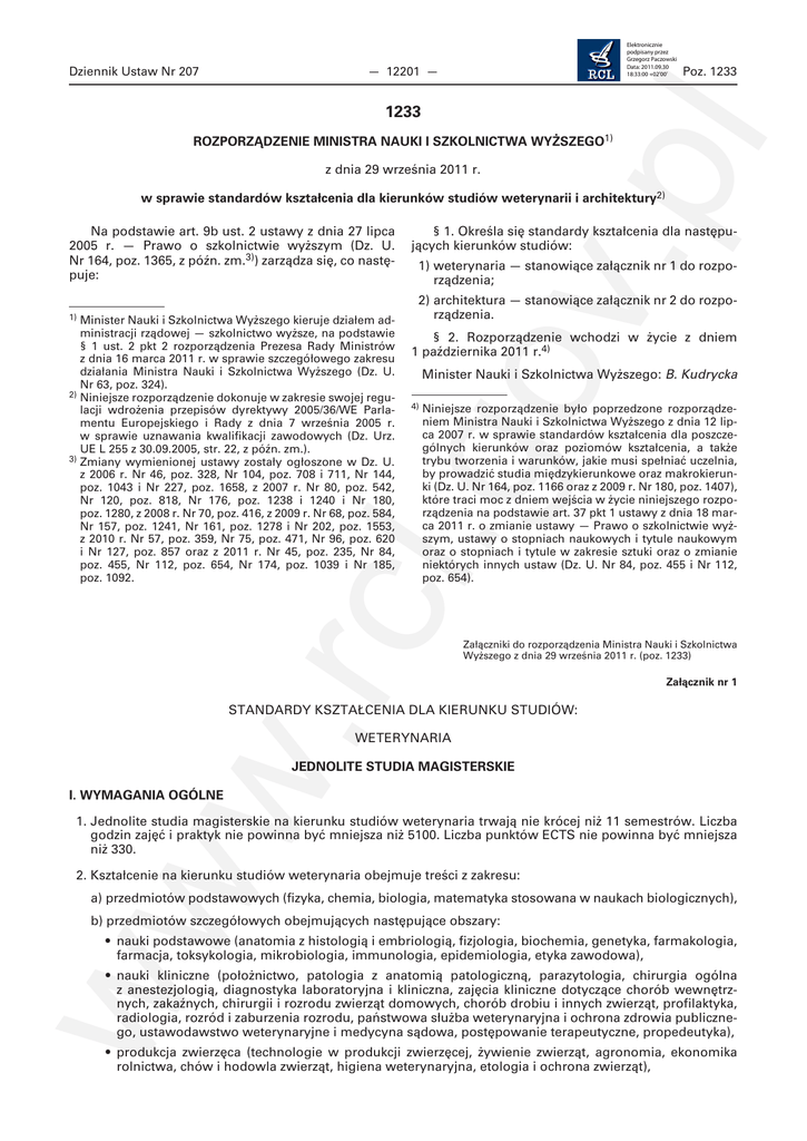 Dziennik Ustaw Nr 207 Elektronicznie podpisany przez Grzegorz Paczowski Data: 2011.09.30 18:33:00 +02'00' — 12201 — Poz. 1233 .go v.p l 1233 ROZPORZĄDZENIE MINISTRA NAUKI I SZKOLNICTWA WYŻSZEGO1) z dnia 29 września 2011 r. w sprawie standardów kształcenia dla kierunków studiów weterynarii i architektury2) Na podstawie art. 9b ust. 2 ustawy z dnia 27 lipca 2005 r. — Prawo o szkolnictwie wyższym (Dz. U. Nr 164, poz. 1365, z późn. zm.3)) zarządza się, co następuje: 1) 1) weterynaria — stanowiące załącznik nr 1 do rozporządzenia; 2) architektura — stanowiące załącznik nr 2 do rozporządzenia. § 2. Rozporządzenie wchodzi w życie z dniem 1 października 2011 r.4) Minister Nauki i Szkolnictwa Wyższego: B. Kudrycka 4) Niniejsze rozporządzenie było poprzedzone rozporządzeniem Ministra Nauki i Szkolnictwa Wyższego z dnia 12 lipca 2007 r. w sprawie standardów kształcenia dla poszczególnych kierunków oraz poziomów kształcenia, a także trybu tworzenia i warunków, jakie musi spełniać uczelnia, by prowadzić studia międzykierunkowe oraz makrokierunki (Dz. U. Nr 164, poz. 1166 oraz z 2009 r. Nr 180, poz. 1407), które traci moc z dniem wejścia w życie niniejszego rozporządzenia na podstawie art. 37 pkt 1 ustawy z dnia 18 marca 2011 r. o zmianie ustawy — Prawo o szkolnictwie wyższym, ustawy o stopniach naukowych i tytule naukowym oraz o stopniach i tytule w zakresie sztuki oraz o zmianie niektórych innych ustaw (Dz. U. Nr 84, poz. 455 i Nr 112, poz. 654). rcl Minister Nauki i Szkolnictwa Wyższego kieruje działem administracji rządowej — szkolnictwo wyższe, na podstawie § 1 ust. 2 pkt 2 rozporządzenia Prezesa Rady Ministrów z dnia 16 marca 2011 r. w sprawie szczegółowego zakresu działania Ministra Nauki i Szkolnictwa Wyższego (Dz. U. Nr 63, poz. 324). 2) Niniejsze rozporządzenie dokonuje w zakresie swojej regulacji wdrożenia przepisów dyrektywy 2005/36/WE Parlamentu Europejskiego i Rady z dnia 7 września 2005 r. w sprawie uznawania kwalifikacji zawodowych (Dz. Urz. UE L 255 z 30.09.2005, str. 22, z późn. zm.). 3) Zmiany wymienionej ustawy zostały ogłoszone w Dz. U. z 2006 r. Nr 46, poz. 328, Nr 104, poz. 708 i 711, Nr 144, poz. 1043 i Nr 227, poz. 1658, z 2007 r. Nr 80, poz. 542, Nr 120, poz. 818, Nr 176, poz. 1238 i 1240 i Nr 180, poz. 1280, z 2008 r. Nr 70, poz. 416, z 2009 r. Nr 68, poz. 584, Nr 157, poz. 1241, Nr 161, poz. 1278 i Nr 202, poz. 1553, z 2010 r. Nr 57, poz. 359, Nr 75, poz. 471, Nr 96, poz. 620 i Nr 127, poz. 857 oraz z 2011 r. Nr 45, poz. 235, Nr 84, poz. 455, Nr 112, poz. 654, Nr 174, poz. 1039 i Nr 185, poz. 1092. § 1. Określa się standardy kształcenia dla następujących kierunków studiów: Załączniki do rozporządzenia Ministra Nauki i Szkolnictwa Wyższego z dnia 29 września 2011 r. (poz. 1233) Załącznik nr 1 w. STANDARDY KSZTAŁCENIA DLA KIERUNKU STUDIÓW: WETERYNARIA JEDNOLITE STUDIA MAGISTERSKIE I. WYMAGANIA OGÓLNE ww 1. Jednolite studia magisterskie na kierunku studiów weterynaria trwają nie krócej niż 11 semestrów. Liczba godzin zajęć i praktyk nie powinna być mniejsza niż 5100. Liczba punktów ECTS nie powinna być mniejsza niż 330. 2. Kształcenie na kierunku studiów weterynaria obejmuje treści z zakresu: a) przedmiotów podstawowych (fizyka, chemia, biologia, matematyka stosowana w naukach biologicznych), b) przedmiotów szczegółowych obejmujących następujące obszary: ~ ] PdZX_^SbcPf^fTP]Pc^\XPiñWXbc^[^VXöXñT\QaX^[^VXöUXiY^[^VXPQX^RWT\XPVT]TchZPUPa\PZ^[^VXP farmacja, toksykologia, mikrobiologia, immunologia, epidemiologia, etyka zawodowa), ~ ]PdZX Z[X]XRi]T _^^ú]XRcf^ _Pc^[^VXP iñ P]Pc^\Xö _Pc^[^VXRi]ö _PaPihc^[^VXP RWXadaVXP ^VÙ[]P z anestezjologią, diagnostyka laboratoryjna i kliniczna, zajęcia kliniczne dotyczące chorób wewnętrznych, zakaźnych, chirurgii i rozrodu zwierząt domowych, chorób drobiu i innych zwierząt, profilaktyka, radiologia, rozród i zaburzenia rozrodu, państwowa służba weterynaryjna i ochrona zdrowia publicznego, ustawodawstwo weterynaryjne i medycyna sądowa, postępowanie terapeutyczne, propedeutyka), ~ _a^SdZRYP ifXTaiĐRP cTRW]^[^VXT fñ _a^SdZRYX ifXTaiĐRTY úhfXT]XT ifXTaiöc PVa^]^\XP TZ^]^\XZP rolnictwa, chów i hodowla zwierząt, higiena weterynaryjna, etologia i ochrona zwierząt), Dziennik Ustaw Nr 207 — 12202 — Poz. 1233 c) przedmiotów dodatkowych: .go v.p l ~ W XVXT]Púhf]^îRXX]b_TZRYPXñZ^]ca^[Pîa^SZÙfúhfXT]XPifXTaiöc^aPiîa^SZÙfb_^úhfRihRW_^RW^dzenia zwierzęcego, higiena i technologia żywności, kształcenie praktyczne, w tym w ubojniach i zakładach przetwórczych środków spożywczych pochodzenia zwierzęcego), ~ YĐihZPPRXĔbZXTV^YĐihZP^QRTV^]^f^úhc]TV^Xñ_aiTS\X^cÙfWd\P]XbchRi]hRW ~ _^SbcPfX]U^a\PchZX ~ fhRW^fP]XPUXihRi]TV^ Nauczanie jednego lub kilku z tych przedmiotów w obrębie każdego obszaru może się odbywać w ramach lub w związku z innymi przedmiotami. Kształcenie praktyczne może przybierać formę stażu realizowanego pod bezpośrednim nadzorem nauczyciela akademickiego. Nauczanie teoretyczne i praktyczne w poszczególnych obszarach powinno być rozłożone, zrównoważone i skoordynowane w taki sposób, aby nabyte wiadomości i umiejętności pozwalały lekarzowi weterynarii na realizację wszystkich powierzonych zadań. Kierunek studiów weterynaria mieści się w całości w obszarze kształcenia z zakresu nauk rolniczych, leśnych i weterynaryjnych. II. RAMOWE TREŚCI KSZTAŁCENIA 1. GRUPY TREŚCI KSZTAŁCENIA, MINIMALNA LICZBA GODZIN ZAJĘĆ ZORGANIZOWANYCH ORAZ MINIMALNA LICZBA PUNKTÓW ECTS TREŚCI KSZTAŁCENIA ECTS A. GRUPA TREŚCI PODSTAWOWYCH 1185 87 B. GRUPA TREŚCI KIERUNKOWYCH 1785 130 2970 217 Razem rcl Godziny 2. SKŁADNIKI TREŚCI KSZTAŁCENIA W GRUPACH, MINIMALNA LICZBA GODZIN ZAJĘĆ ZORGANIZOWANYCH ORAZ MINIMALNA LICZBA PUNKTÓW ECTS TREŚCI KSZTAŁCENIA A. GRUPA TREŚCI PODSTAWOWYCH Treści kształcenia w zakresie: w. 1. Biologii Godziny ECTS 1185 87 30 30 3.