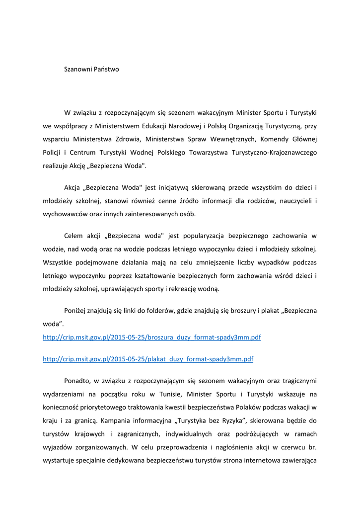 Szanowni Państwo W związku z rozpoczynającym się sezonem wakacyjnym Minister Sportu i Turystyki we współpracy z Ministerstwem Edukacji Narodowej i Polską Organizacją Turystyczną, przy wsparciu Ministerstwa Zdrowia, Ministerstwa Spraw Wewnętrznych, Komendy Głównej Policji i Centrum Turystyki Wodnej Polskiego Towarzystwa Turystyczno-Krajoznawczego realizuje Akcję „Bezpieczna Woda". Akcja „Bezpieczna Woda" jest inicjatywą skierowaną przede wszystkim do dzieci i młodzieży szkolnej, stanowi również cenne źródło informacji dla rodziców, nauczycieli i wychowawców oraz innych zainteresowanych osób. Celem akcji „Bezpieczna woda" jest popularyzacja bezpiecznego zachowania w wodzie, nad wodą oraz na wodzie podczas letniego wypoczynku dzieci i młodzieży szkolnej. Wszystkie podejmowane działania mają na celu zmniejszenie liczby wypadków podczas letniego wypoczynku poprzez kształtowanie bezpiecznych form zachowania wśród dzieci i młodzieży szkolnej, uprawiających sporty i rekreację wodną. Poniżej znajdują się linki do folderów, gdzie znajdują się broszury i plakat „Bezpieczna woda”. http://crip.msit.gov.pl/2015-05-25/broszura_duzy_format-spady3mm.pdf http://crip.msit.gov.pl/2015-05-25/plakat_duzy_format-spady3mm.pdf Ponadto, w związku z rozpoczynającym się sezonem wakacyjnym oraz tragicznymi wydarzeniami na początku roku w Tunisie, Minister Sportu i Turystyki wskazuje na konieczność priorytetowego traktowania kwestii bezpieczeństwa Polaków podczas wakacji w kraju i za granicą. Kampania informacyjna „Turystyka bez Ryzyka”, skierowana będzie do turystów krajowych i zagranicznych, indywidualnych oraz podróżujących w ramach wyjazdów zorganizowanych. W celu przeprowadzenia i nagłośnienia akcji w czerwcu br. wystartuje specjalnie dedykowana bezpieczeństwu turystów strona internetowa zawierająca najważniejsze informacje dla podróżujących, w tym także informacje dotyczące m.in. planowania wyjazdu, transportu, bagażu w podróży, zdrowia i ubezpieczenia, wiz, paszportów, wypoczynku dzieci i młodzieży, informacje dotyczące podpisywania umów oraz trudnych sytuacji w podróży. Na stronie www.turystykabezryzyka.gov.pl. znajdą się odnośniki i linki, kierujące bezpośrednio do konkretnego problemu (np. zapoznaj się z przepisami celnymi i wymogami sanitarnymi obowiązującymi przy przekraczaniu granic). Ponadto, każdy obywatel może zgłosić swoją podróż w serwisie Ministerstwa Spraw Zagranicznych „Odyseusz” https://odyseusz.msz.gov.pl/. Dzięki rejestracji w przypadku wystąpienia sytuacji nadzwyczajnych za granicą, Ministerstwo Spraw Zagranicznych będzie mogło nawiązać kontakt z osobami wpisanymi do serwisu. Jednocześnie, uprzejmie informujemy, że Ministerstwo Spraw Zagranicznych, w ramach prowadzonej działalności informacyjnej skierowanej do obywateli polskich, na stronie Ministerstwa Spraw Zagranicznych, zamieściło m.in.: - poradnik pn. „Polak za granicą”, - zakładkę „Bezpieczne Wakacje”, - zakładkę „Ostrzeżenia dla podróżnych”. Zamieszczone na stronie Ministerstwa Spraw Zagranicznych, wiadomości stanowią źródło ważnych i pomocnych informacji dla Polaków wyjeżdżających na wypoczynek za granicę oraz odpowiednich wskazówek, jak zachować się w różnych nieprzewidzianych sytuacjach, jakie mogą zaistnieć podczas pobytu za granicą. Działalność informacyjną prowadzi również Straż Graniczna, która na stronie głównej w zakładce „Dla podróżnych” zamieszcza poradnik „Dziecko w podróży” oraz inne ważne informacje związane z organizacją wypoczynku