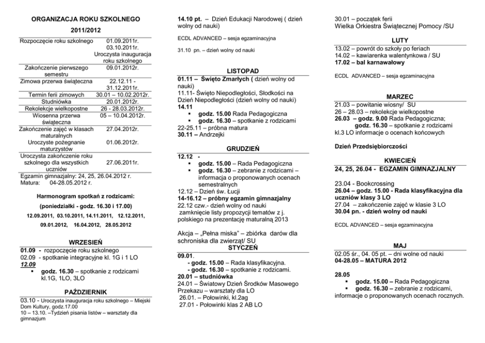 ORGANIZACJA ROKU SZKOLNEGO 2011/2012 Rozpoczęcie roku szkolnego Zakończenie pierwszego semestru Zimowa przerwa świąteczna 01.09.2011r. 03.10.2011r. Uroczysta inauguracja roku szkolnego 09.01.2012r. 22.12.11 31.12.2011r. 30.01 – 10.02.2012r. 20.01.2012r. 26 - 28.03.2012r. 05 – 10.04.2012r. Termin ferii zimowych Studniówka Rekolekcje wielkopostne Wiosenna przerwa świątecznaEgzamin Zakończenie zajęć w klasach 27.04.2012r. maturalnych Uroczyste pożegnanie 01.06.2012r. maturzystów Uroczysta zakończenie roku szkolnego dla wszystkich 27.06.2011r. uczniów Egzamin gimnazjalny: 24, 25, 26.04.2012 r. Matura: 04-28.05.2012 r. Harmonogram spotkań z rodzicami: (poniedziałki - godz. 16.30 i 17.00) 12.09.2011, 03.10.2011, 14.11.2011, 12.12.2011, 09.01.2012, 14.10 pt. – Dzień Edukacji Narodowej ( dzień wolny od nauki) ECDL ADVANCED – sesja egzaminacyjna 31.10 pn. – dzień wolny od nauki LISTOPAD 01.11 – Święto Zmarłych ( dzień wolny od nauki) 11.11- Święto Niepodległości, Słodkości na Dzień Niepodległości (dzień wolny od nauki) 14.11 godz. 15.00 Rada Pedagogiczna godz. 16.30 – spotkanie z rodzicami 22-25.11 – próbna matura 30.11 – Andrzejki GRUDZIEŃ 12.12 godz. 15.00 – Rada Pedagogiczna godz. 16.30 – zebranie z rodzicami – informacja o proponowanych ocenach semestralnych 12.12 – Dzień św. Łucji 14-16.12 – próbny egzamin gimnazjalny 22.12 czw.- dzień wolny od nauki zamknięcie listy propozycji tematów z j. polskiego na prezentację maturalną 2013 16.04.2012, 28.05.2012 WRZESIEŃ 01.09 - rozpoczęcie roku szkolnego 02.09 - spotkanie integracyjne kl. 1G i 1 LO 12.09 godz. 16.30 – spotkanie z rodzicami kl.1G, 1LO, 3LO PAŹDZIERNIK 03.10 - Uroczysta inauguracja roku szkolnego – Miejski Dom Kultury, godz.17.00 10 – 13.10. –Tydzień pisania listów – warsztaty dla gimnazjum Akcja – „Pełna miska” – zbiórka darów dla schroniska dla zwierząt/ SU STYCZEŃ 09.01. - godz. 15.00 – Rada klasyfikacyjna. - godz. 16.30 – spotkanie z rodzicami. 20.01 – studniówka 24.01 – Światowy Dzień Środków Masowego Przekazu – warsztaty dla LO 26.01. – Połowinki, kl.2ag 27.01 - Połowinki klas 2 AB LO 30.01 – początek ferii Wielka Orkiestra Świątecznej Pomocy /SU LUTY 13.02 – powrót do szkoły po feriach 14.02 – kawiarenka walentynkowa / SU 17.02 – bal karnawałowy ECDL ADVANCED – sesja egzaminacyjna MARZEC 21.03 – powitanie wiosny/ SU 26 – 28.03 – rekolekcje wielkopostne 26.03 – godz. 9.00 Rada Pedagogiczna; godz. 16.30 – spotkanie z rodzicami kl.3 LO informacje o ocenach końcowych Dzień Przedsiębiorczości KWIECIEŃ 24, 25, 26.04 - EGZAMIN GIMNAZJALNY 23.04 - Bookcrossing 26.04 – godz. 15.00 - Rada klasyfikacyjna dla uczniów klasy 3 LO 27.04 – zakończenie zajęć w klasie 3 LO 30.04 pn. - dzień wolny od nauki ECDL ADVANCED – sesja egzaminacyjna MAJ 02.05 śr., 04. 05 pt. – dni wolne od nauki 04-28.05 – MATURA 2012 28.05 godz. 15.00 – Rada Pedagogiczna godz. 16.30 – zebranie z rodzicami, informacje o proponowanych ocenach rocznych. CZERWIEC 01.06 - uroczyste pożegnanie maturzystów 21.06– godz. 15.00 – Rada klasyfikacyjna 27.06 - uroczyste zakończenie roku szkolnego 28.06 – godz.9.00 plenarne posiedzenie Rady Pedagogicznej 29.06 - dzień wolny – wycieczki edukacyjne Szkoła w roku szkolnym 2011/12 realizuje następujące projekty współfinansowane ze środków Europejskiego Funduszu Społecznego: „e-Akademia przyszłości” „Szkoła spełnionych marzeń” „Nasze jezioro – nasza sprawa” Nietypowe środy w gimnazjum: Warsztaty przyrodnicze, fizyczne chemiczne i geograficzne wg opracowanego harmonogramu. Prawa zwierząt – wizyta w schronisku. Wolontariat – zajęcia w hospicjum. Wandzin – Szkoła życia. Spotkania profilaktyczne w poradni „K”. Inne proponowane wydarzenia i przedsięwzięcia szkolne: Gazetki tematyczne i okolicznościowe. Cykliczne wyjazdy do teatru. Wycieczki rowerowe, kuligi, spływy kajakowe. Wyjścia na basen. Akcja „Góra grosza”/ SU. Adres szkoły: Zespół Szkół Społecznych Społecznego Towarzystwa Oświatowego Im. Jana Nowaka -Jeziorańskiego ul. Jana III Sobieskiego 7A 77-300 Człuchów Nr konta szkoły: 11124037961111000030744006 tel./fax: 59 8341174 e-mail sekretariatu: [email protected] e-mail dyrektora: [email protected] www.losto.net www.losto.net/ki Dyrektor szkoły - Maria Danuta Kordykiewicz Kalendarz szkolny 2011 / 2012 Wicedyrektor – Mirosława Podgórska Główna księgowa – Józefa Ławro Sekretarz szkoły – Sabina Bednarz Organ prowadzący szkołę: Zarząd Samodzielnego Koła Terenowego nr 131 Społecznego Towarzystwa Oświatowego w Człuchowie Prezes – Krystyna Gierszewska Nadzór pedagogiczny: Kuratorium Oświaty w Gdańsku 80-853 Gdańsk, ul. Wały Jagiellońskie 24 Zespół wizytacyjny: ul. Szczecińska 20, 77-300 Człuchów Zespół Szkół Społecznych Społecznego Towarzystwa Oświatowego im. Jana Nowaka - Jeziorańskiego w Człuchowie