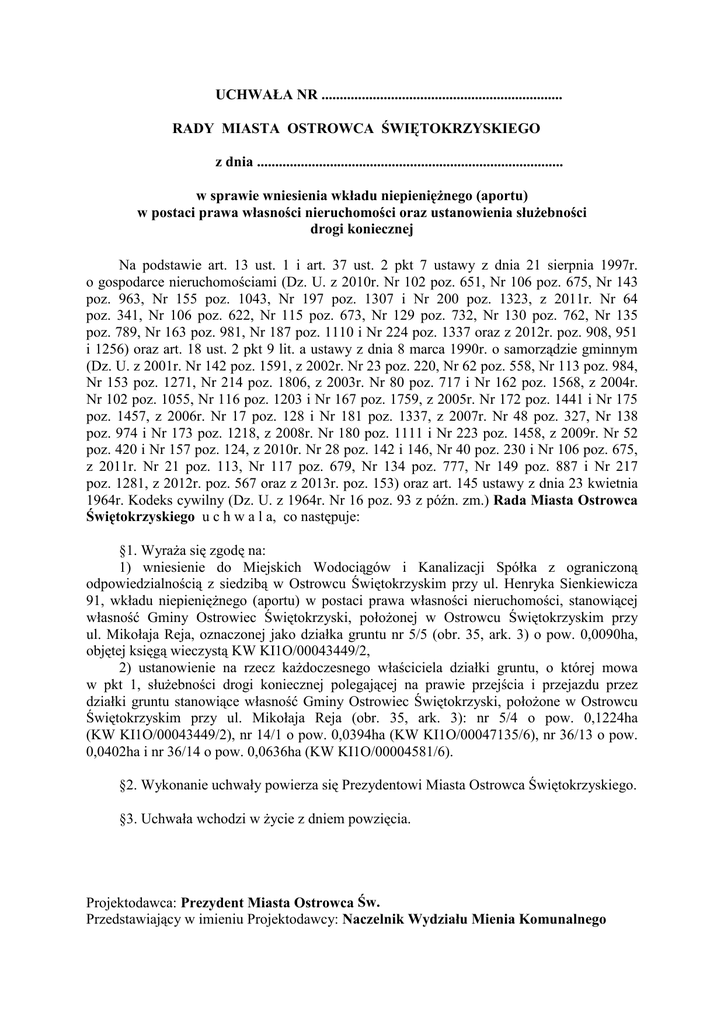 UCHWAŁA NR .................................................................. RADY MIASTA OSTROWCA ŚWIĘTOKRZYSKIEGO z dnia .................................................................................... w sprawie wniesienia wkładu niepieniężnego (aportu) w postaci prawa własności nieruchomości oraz ustanowienia służebności drogi koniecznej Na podstawie art. 13 ust. 1 i art. 37 ust. 2 pkt 7 ustawy z dnia 21 sierpnia 1997r. o gospodarce nieruchomościami (Dz. U. z 2010r. Nr 102 poz. 651, Nr 106 poz. 675, Nr 143 poz. 963, Nr 155 poz. 1043, Nr 197 poz. 1307 i Nr 200 poz. 1323, z 2011r. Nr 64 poz. 341, Nr 106 poz. 622, Nr 115 poz. 673, Nr 129 poz. 732, Nr 130 poz. 762, Nr 135 poz. 789, Nr 163 poz. 981, Nr 187 poz. 1110 i Nr 224 poz. 1337 oraz z 2012r. poz. 908, 951 i 1256) oraz art. 18 ust. 2 pkt 9 lit. a ustawy z dnia 8 marca 1990r. o samorządzie gminnym (Dz. U. z 2001r. Nr 142 poz. 1591, z 2002r. Nr 23 poz. 220, Nr 62 poz. 558, Nr 113 poz. 984, Nr 153 poz. 1271, Nr 214 poz. 1806, z 2003r. Nr 80 poz. 717 i Nr 162 poz. 1568, z 2004r. Nr 102 poz. 1055, Nr 116 poz. 1203 i Nr 167 poz. 1759, z 2005r. Nr 172 poz. 1441 i Nr 175 poz. 1457, z 2006r. Nr 17 poz. 128 i Nr 181 poz. 1337, z 2007r. Nr 48 poz. 327, Nr 138 poz. 974 i Nr 173 poz. 1218, z 2008r. Nr 180 poz. 1111 i Nr 223 poz. 1458, z 2009r. Nr 52 poz. 420 i Nr 157 poz. 124, z 2010r. Nr 28 poz. 142 i 146, Nr 40 poz. 230 i Nr 106 poz. 675, z 2011r. Nr 21 poz. 113, Nr 117 poz. 679, Nr 134 poz. 777, Nr 149 poz. 887 i Nr 217 poz. 1281, z 2012r. poz. 567 oraz z 2013r. poz. 153) oraz art. 145 ustawy z dnia 23 kwietnia 1964r. Kodeks cywilny (Dz. U. z 1964r. Nr 16 poz. 93 z późn. zm.) Rada Miasta Ostrowca Świętokrzyskiego u c h w a l a, co następuje: §1. Wyraża się zgodę na: 1) wniesienie do Miejskich Wodociągów i Kanalizacji Spółka z ograniczoną odpowiedzialnością z siedzibą w Ostrowcu Świętokrzyskim przy ul. Henryka Sienkiewicza 91, wkładu niepieniężnego (aportu) w postaci prawa własności nieruchomości, stanowiącej własność Gminy Ostrowiec Świętokrzyski, położonej w Ostrowcu Świętokrzyskim przy ul. Mikołaja Reja, oznaczonej jako działka gruntu nr 5/5 (obr. 35, ark. 3) o pow. 0,0090ha, objętej księgą wieczystą KW KI1O/00043449/2, 2) ustanowienie na rzecz każdoczesnego właściciela działki gruntu, o której mowa w pkt 1, służebności drogi koniecznej polegającej na prawie przejścia i przejazdu przez działki gruntu stanowiące własność Gminy Ostrowiec Świętokrzyski, położone w Ostrowcu Świętokrzyskim przy ul. Mikołaja Reja (obr. 35, ark. 3): nr 5/4 o pow. 0,1224ha (KW KI1O/00043449/2), nr 14/1 o pow. 0,0394ha (KW KI1O/00047135/6), nr 36/13 o pow. 0,0402ha i nr 36/14 o pow. 0,0636ha (KW KI1O/00004581/6). §2. Wykonanie uchwały powierza się Prezydentowi Miasta Ostrowca Świętokrzyskiego. §3. Uchwała wchodzi w życie z dniem powzięcia. Projektodawca: Prezydent Miasta Ostrowca Św. Przedstawiający w imieniu Projektodawcy: Naczelnik Wydziału Mienia Komunalnego UZASADNIENIE Gmina Ostrowiec Świętokrzyski jest właścicielem nieruchomości, położonej w Ostrowcu Świętokrzyskim przy ul. Mikołaja Reja, oznaczonej jako działka gruntu nr 5/5 (obr. 35, ark. 3) o pow. 0,0090ha, zajętej pod przepompownię ścieków, użytkowanej przez Miejskie Wodociągi i Kanalizacja Spółka z ograniczoną odpowiedzialnością w Ostrowcu Świętokrzyskim. Mając na uwadze fakt, iż przedmiotowa działka wykorzystywana jest przez Spółkę do wykonywania działalności związanej z usługami publicznymi z zakresu zadań własnych Gminy, tj. dostarczeniem wody i odprowadzaniem ścieków, wniesienie do Spółki wkładu niepieniężnego (aportu) należy uznać za zasadne. W celu uregulowania prawnego obsługi komunikacyjnej, tj. zapewnienia działce nr 5/5 dostępu do drogi publicznej gminnej – ul. Mikołaja Reja, zbycie w/w nieruchomości wiąże się z koniecznością ustanowienia służebności drogi koniecznej przez działki gminne nr: 5/4, 14/1, 36/13 i 36/14. Wniesienie do Spółki wkładu niepieniężnego (aportu) w postaci prawa własności przedmiotowej nieruchomości pozwoli na podwyższenie kapitału zakładowego Spółki o wartość rynkową określoną przez rzeczoznawcę majątkowego oraz spowoduje objęcie przez Gminę nowych udziałów w Spółce. Z uwagi na powyższe, zasadnym jest przyjęcie przedłożonego projektu uchwały.