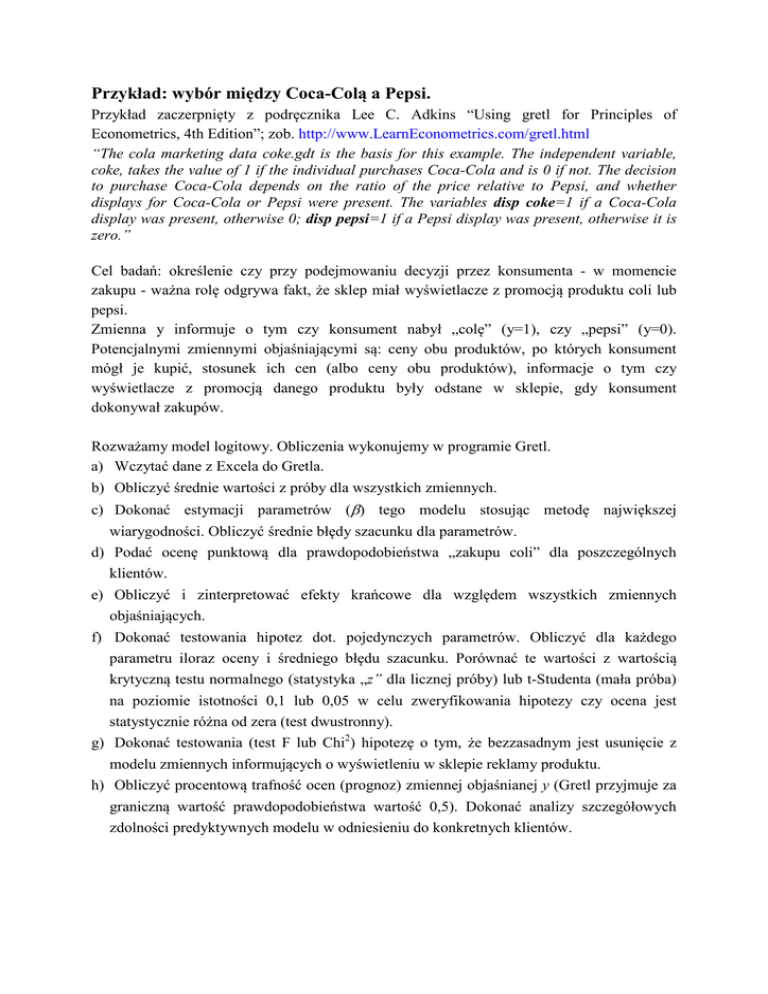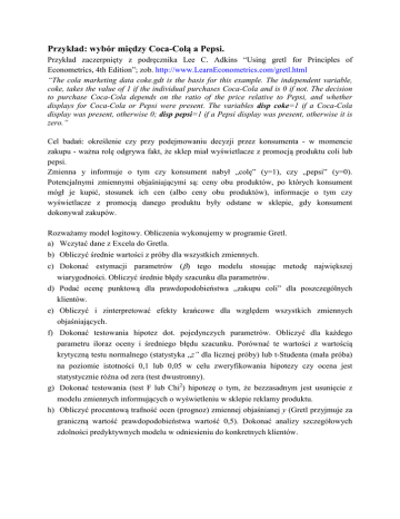 Przykład: wybór między Coca-Colą a Pepsi. Przykład zaczerpnięty z podręcznika Lee C. Adkins “Using gretl for Principles of Econometrics, 4th Edition”; zob. http://www.LearnEconometrics.com/gretl.html “The cola marketing data coke.gdt is the basis for this example. The independent variable, coke, takes the value of 1 if the individual purchases Coca-Cola and is 0 if not. The decision to purchase Coca-Cola depends on the ratio of the price relative to Pepsi, and whether displays for Coca-Cola or Pepsi were present. The variables disp coke=1 if a Coca-Cola display was present, otherwise 0; disp pepsi=1 if a Pepsi display was present, otherwise it is zero.” Cel badań: określenie czy przy podejmowaniu decyzji przez konsumenta - w momencie zakupu - ważna rolę odgrywa fakt, że sklep miał wyświetlacze z promocją produktu coli lub pepsi. Zmienna y informuje o tym czy konsument nabył „colę” (y=1), czy „pepsi” (y=0). Potencjalnymi zmiennymi objaśniającymi są: ceny obu produktów, po których konsument mógł je kupić, stosunek ich cen (albo ceny obu produktów), informacje o tym czy wyświetlacze z promocją danego produktu były odstane w sklepie, gdy konsument dokonywał zakupów. Rozważamy model logitowy. Obliczenia wykonujemy w programie Gretl. a) Wczytać dane z Excela do Gretla. b) Obliczyć średnie wartości z próby dla wszystkich zmiennych. c) Dokonać estymacji parametrów (β) tego modelu stosując metodę największej wiarygodności. Obliczyć średnie błędy szacunku dla parametrów. d) Podać ocenę punktową dla prawdopodobieństwa „zakupu coli” dla poszczególnych klientów. e) Obliczyć i zinterpretować efekty krańcowe dla względem wszystkich zmiennych objaśniających. f) Dokonać testowania hipotez dot. pojedynczych parametrów. Obliczyć dla każdego parametru iloraz oceny i średniego błędu szacunku. Porównać te wartości z wartością krytyczną testu normalnego (statystyka „z” dla licznej próby) lub t-Studenta (mała próba) na poziomie istotności 0,1 lub 0,05 w celu zweryfikowania hipotezy czy ocena jest statystycznie różna od zera (test dwustronny). g) Dokonać testowania (test F lub Chi2) hipotezę o tym, że bezzasadnym jest usunięcie z modelu zmiennych informujących o wyświetleniu w sklepie reklamy produktu. h) Obliczyć procentową trafność ocen (prognoz) zmiennej objaśnianej y (Gretl przyjmuje za graniczną wartość prawdopodobieństwa wartość 0,5). Dokonać analizy szczegółowych zdolności predyktywnych modelu w odniesieniu do konkretnych klientów.